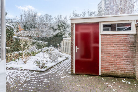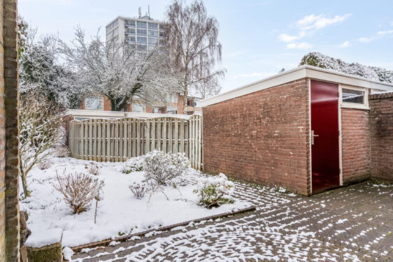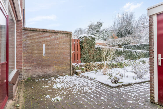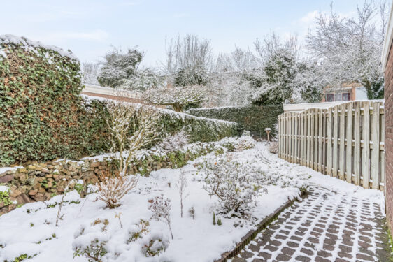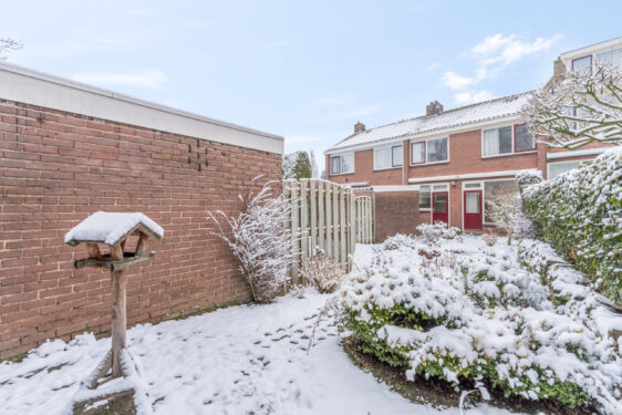 Buiten: de voortuin heeft borderbeplanting en tegelpad naar de voordeur. De achtertuin heeft een heerlijk terras, borderbeplanting en een poort voor achterom. De tuin geeft toegang naar een stenen berging voorzien van elektra.
