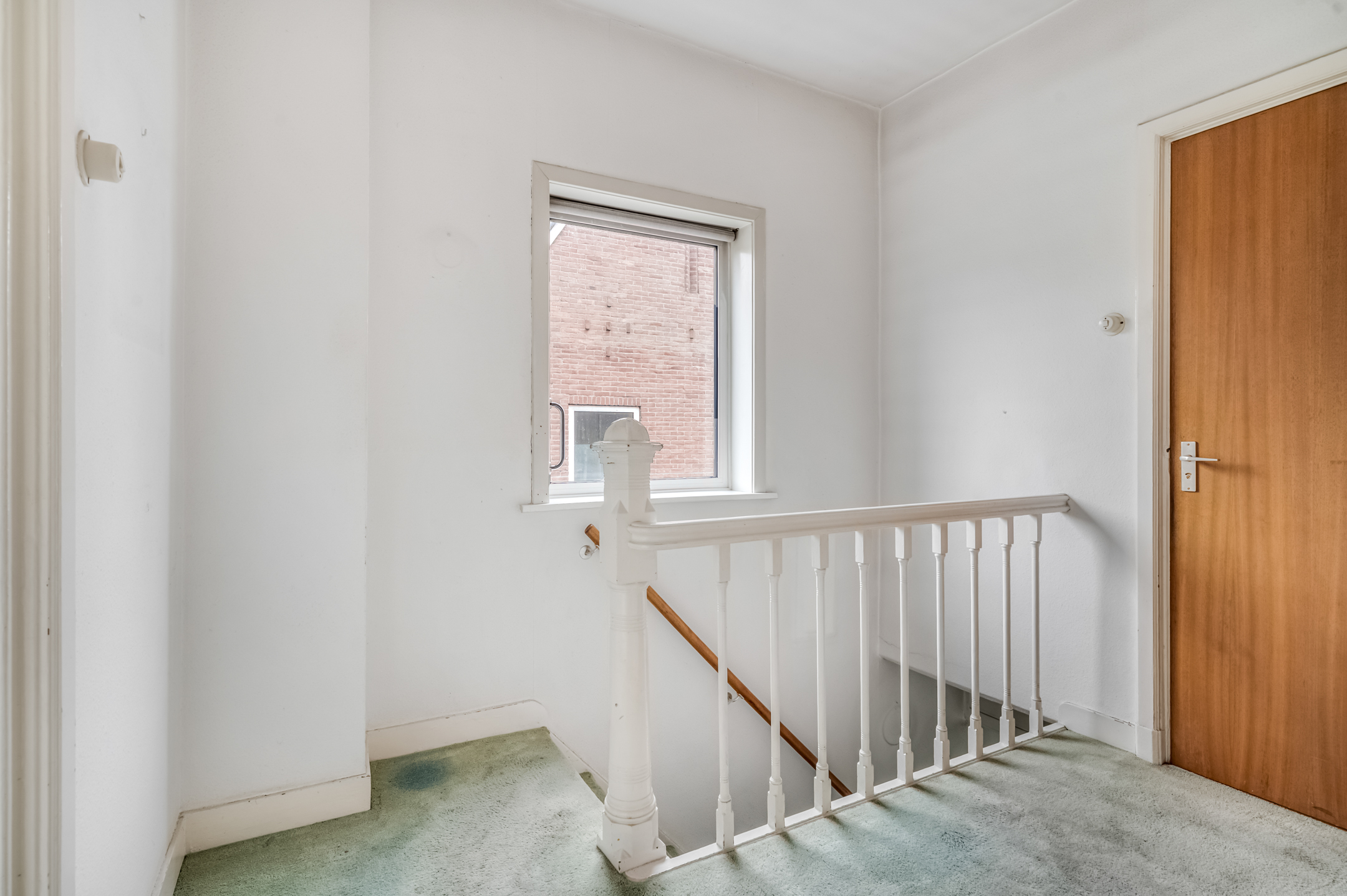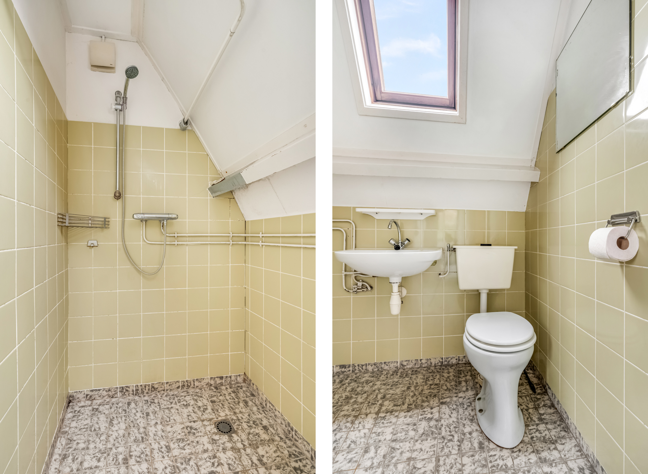 1e verdieping: overloop met afgesloten trapopgang naar de 2e verdieping. De overloop geeft toegang tot 3 slaapkamers met aansluitend een badkamer voorzien van dakraam, douchehoek met thermostaatkraan, wastafel en toilet.