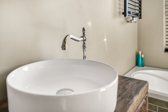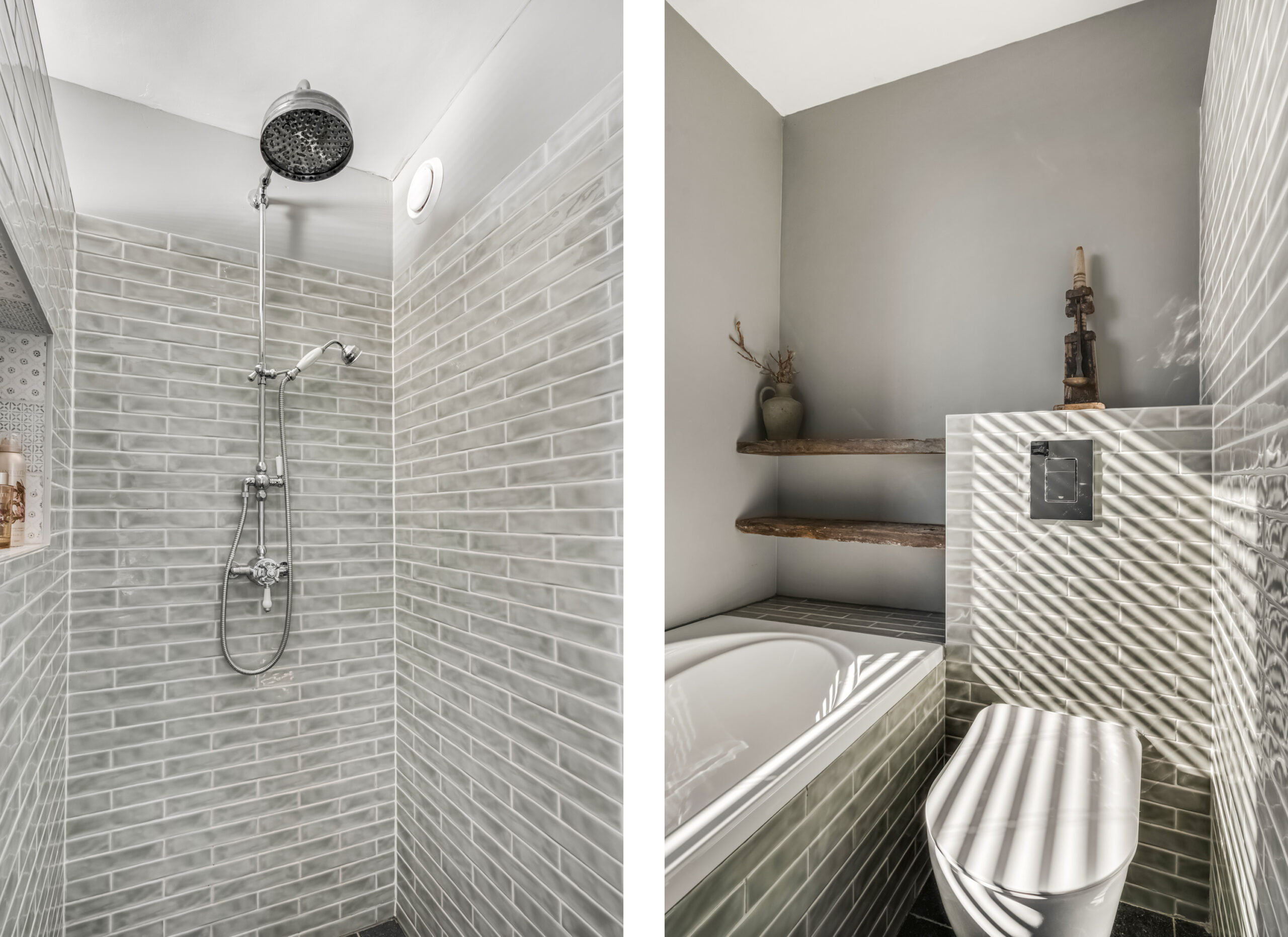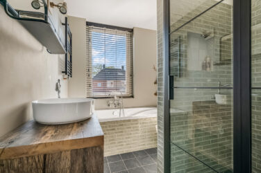 De jonge badkamer is uitgevoerd in een landelijke stijl en beschikt over een ligbad, douchecabine, wastafelmeubel, toilet en een designradiator.