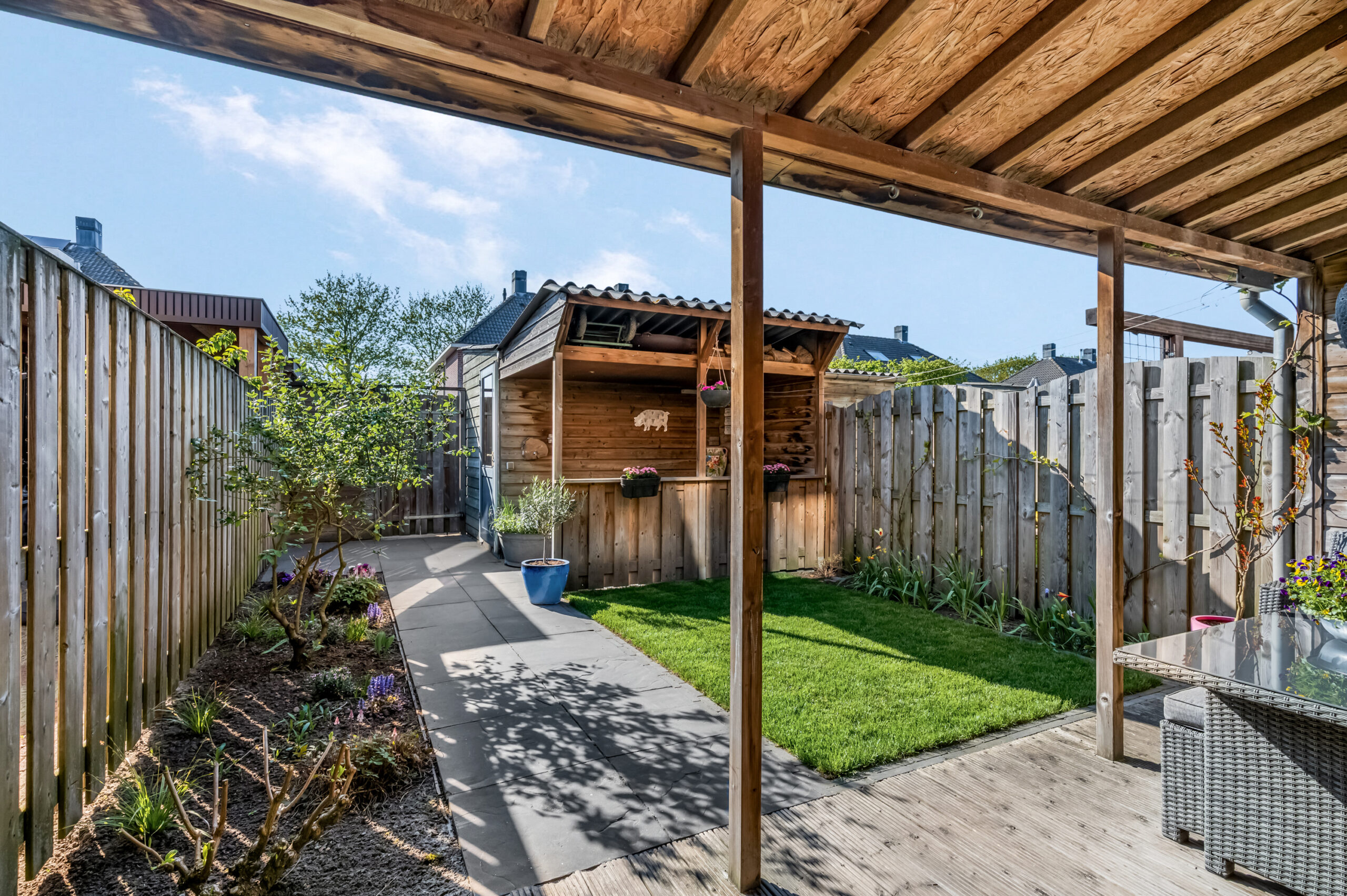 Direct aan de woning bevindt zich een overkapping, waardoor je hier al vroeg in het voorjaar en tot laat in het najaar comfortabel buiten kunt zitten. Achter in de tuin is nog een tweede overkapping met een berging aanwezig, wat zorgt voor extra opslagruimte. De tuin is bovendien bereikbaar via een achterom.