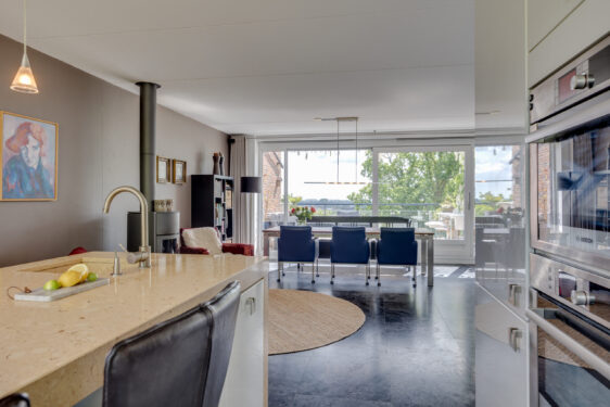 Op de eerste verdieping bevindt zich het woongedeelte met een hardstenen vloer voorzien van vloerverwarming. De moderne open keuken is van alle gemakken voorzien en heeft stijlvolle, zachtgele werkbladen van composiet vermengd met natuursteen. De hoogrenderende houtkachel kan verschillende richtingen op worden gedraaid en zorgt voor extra gezelligheid én warmte. Het zitgedeelte biedt genoeg ruimte voor een fijne loungebank en vanaf de eettafel kijk je op het heerlijke terras waar je tot laat kunt genieten van de zon en het fraaie landschap.