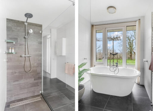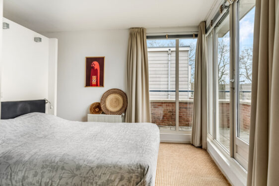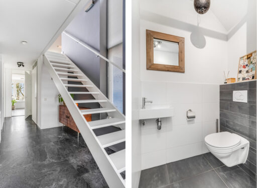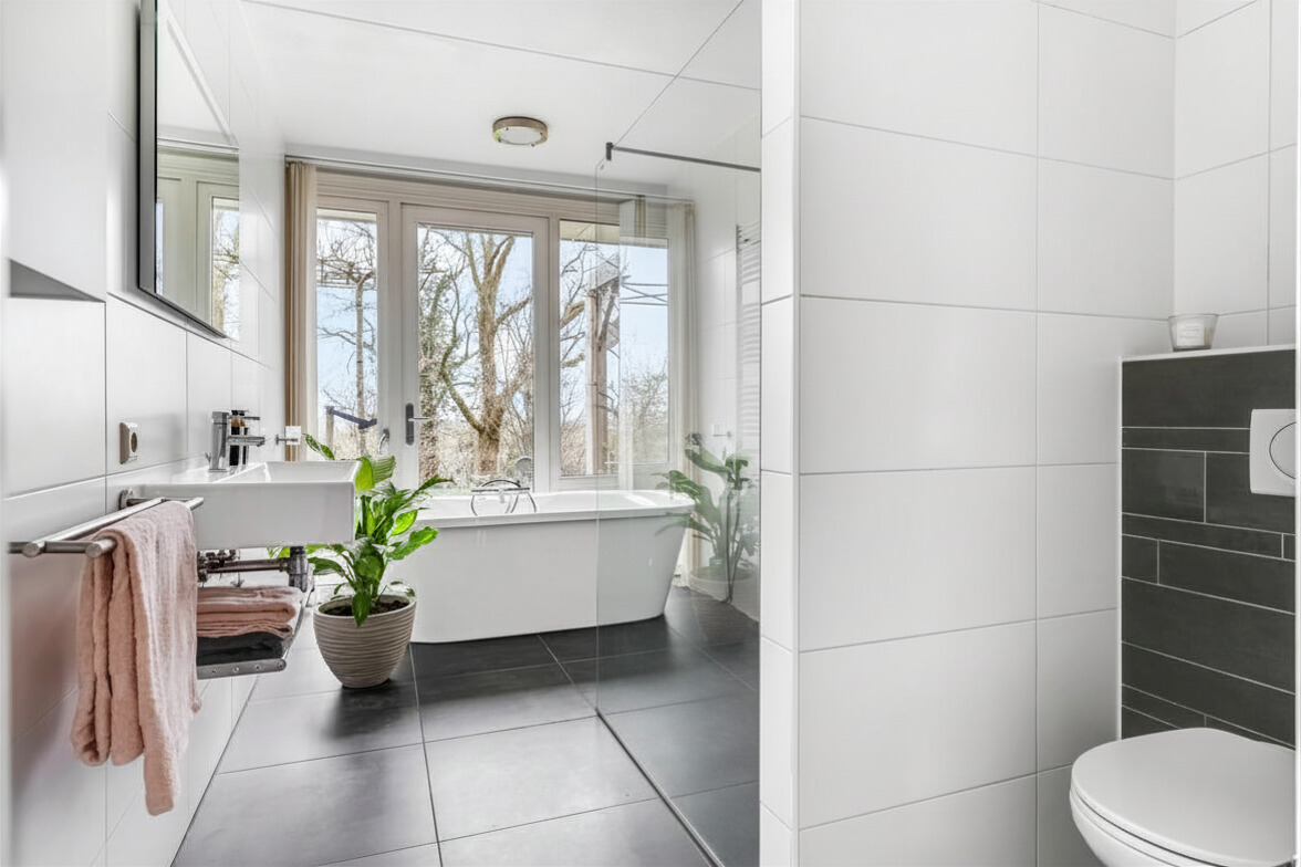 Op de begane grond vind je drie kamers: een grote master slaapkamer met toegang tot de terrastuin op het zuiden, grenzend aan het natuurgebied van de Grebbeberg en een ruime slaapkamer op het noorden, het kantoor (of slaapvertrek) met openslaande deuren is tevens op het zuiden. Ook de moderne badkamer met inloopdouche en ligbad geeft toegang naar buiten. Hier baad je dus letterlijk in het groen! Verder is er een separaat toilet, een wasruimte en een berging.