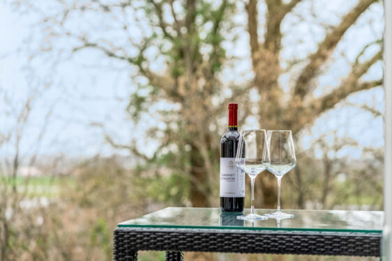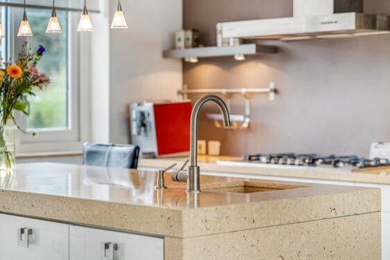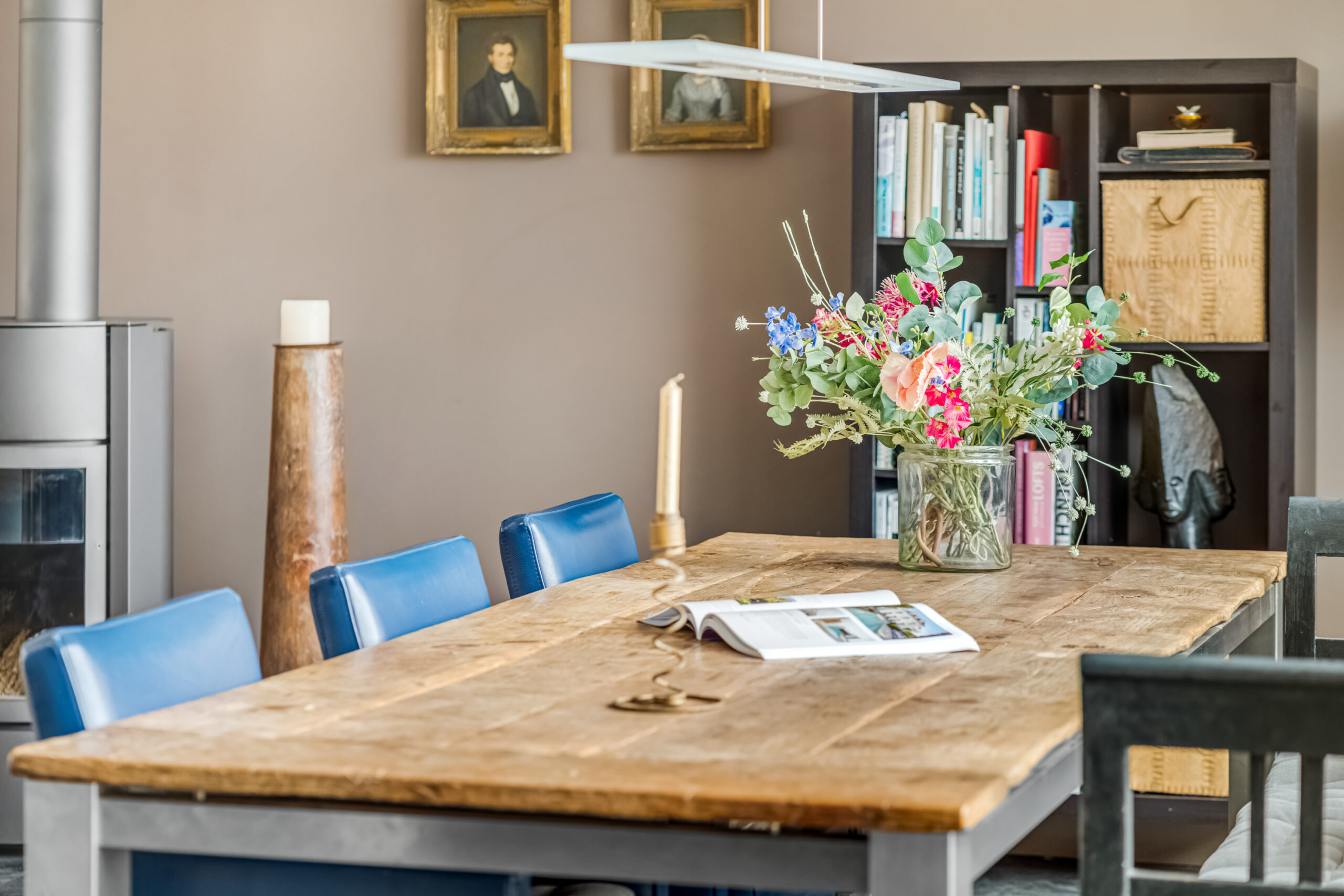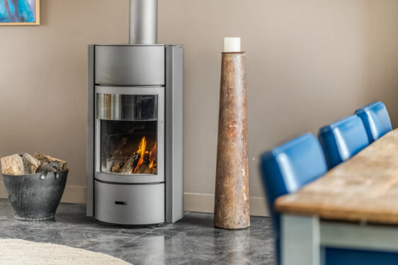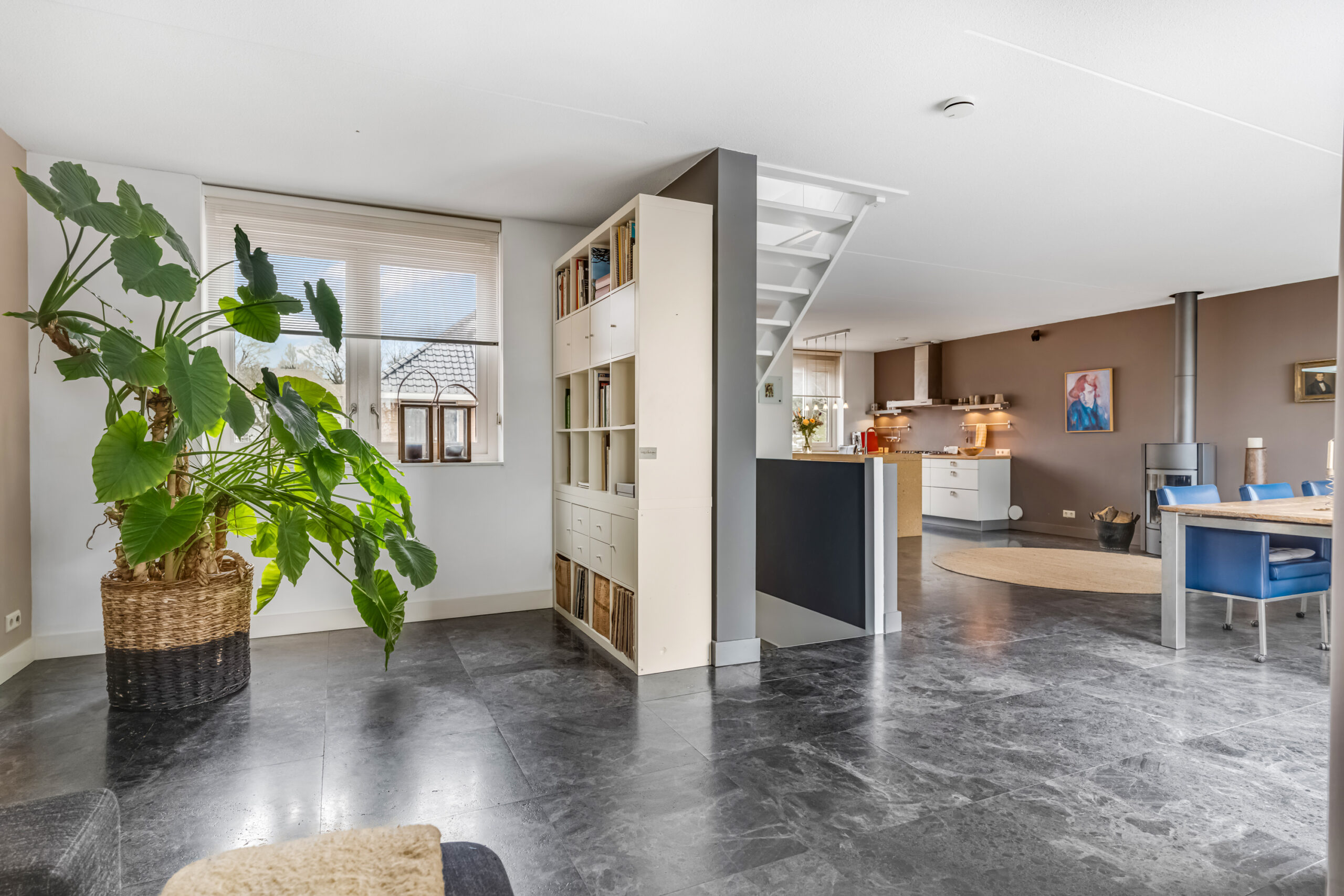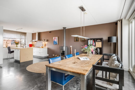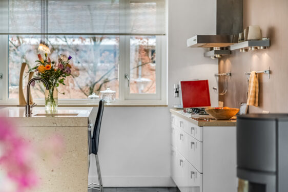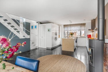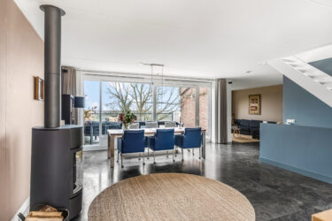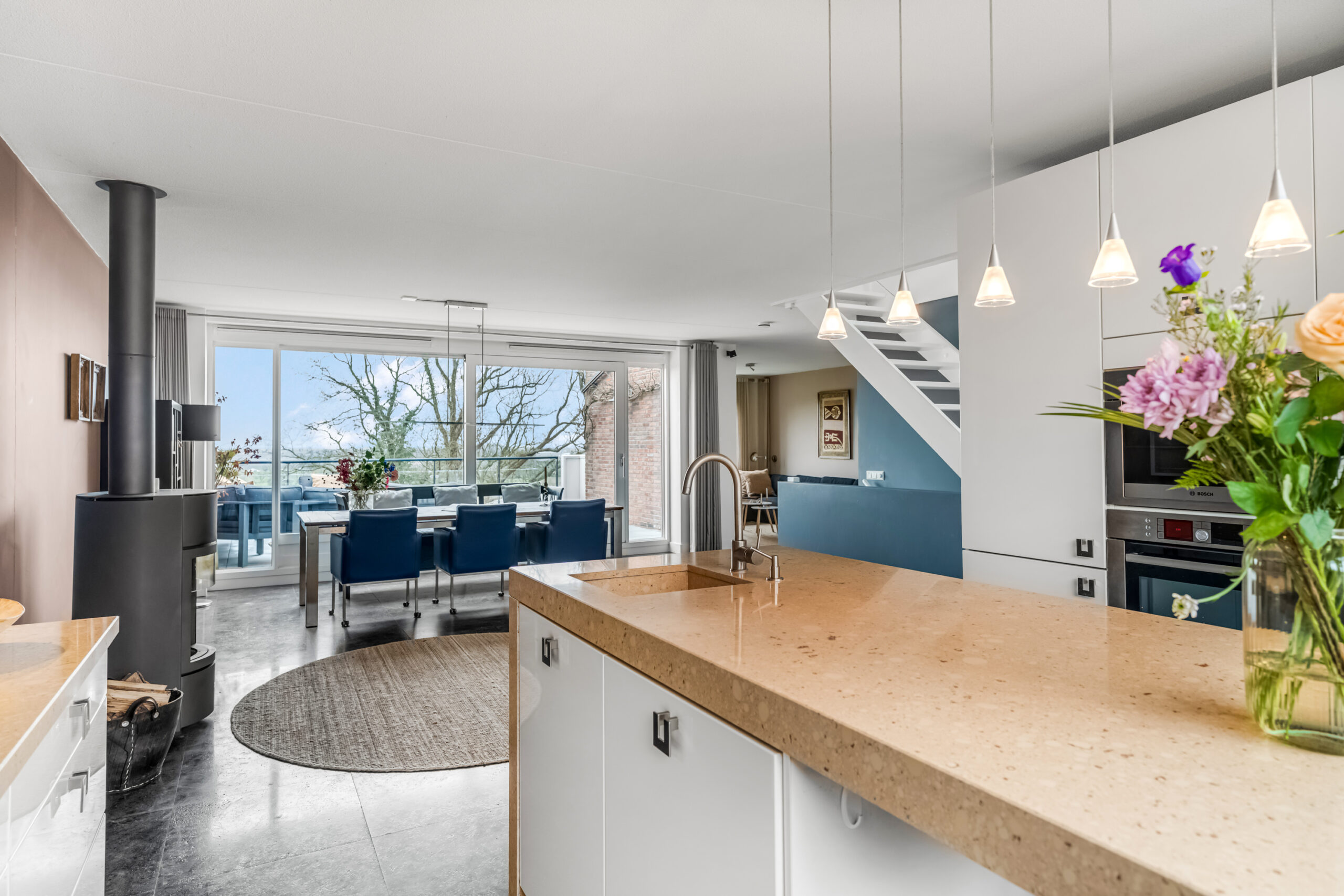 Op de eerste verdieping bevindt zich het woongedeelte met een luxe hardstenen vloer voorzien van vloerverwarming. De moderne open keuken is van alle gemakken voorzien en heeft stijlvolle, zachtgele werkbladen van composiet vermengd met natuursteen. De hoogrenderende houtkachel kan verschillende richtingen op worden gedraaid en zorgt voor extra gezelligheid én warmte. Het zitgedeelte biedt genoeg ruimte voor een fijne loungebank en vanaf de eettafel kijk je op het heerlijke terras waar je tot laat kunt genieten van de zon en het fraaie landschap.