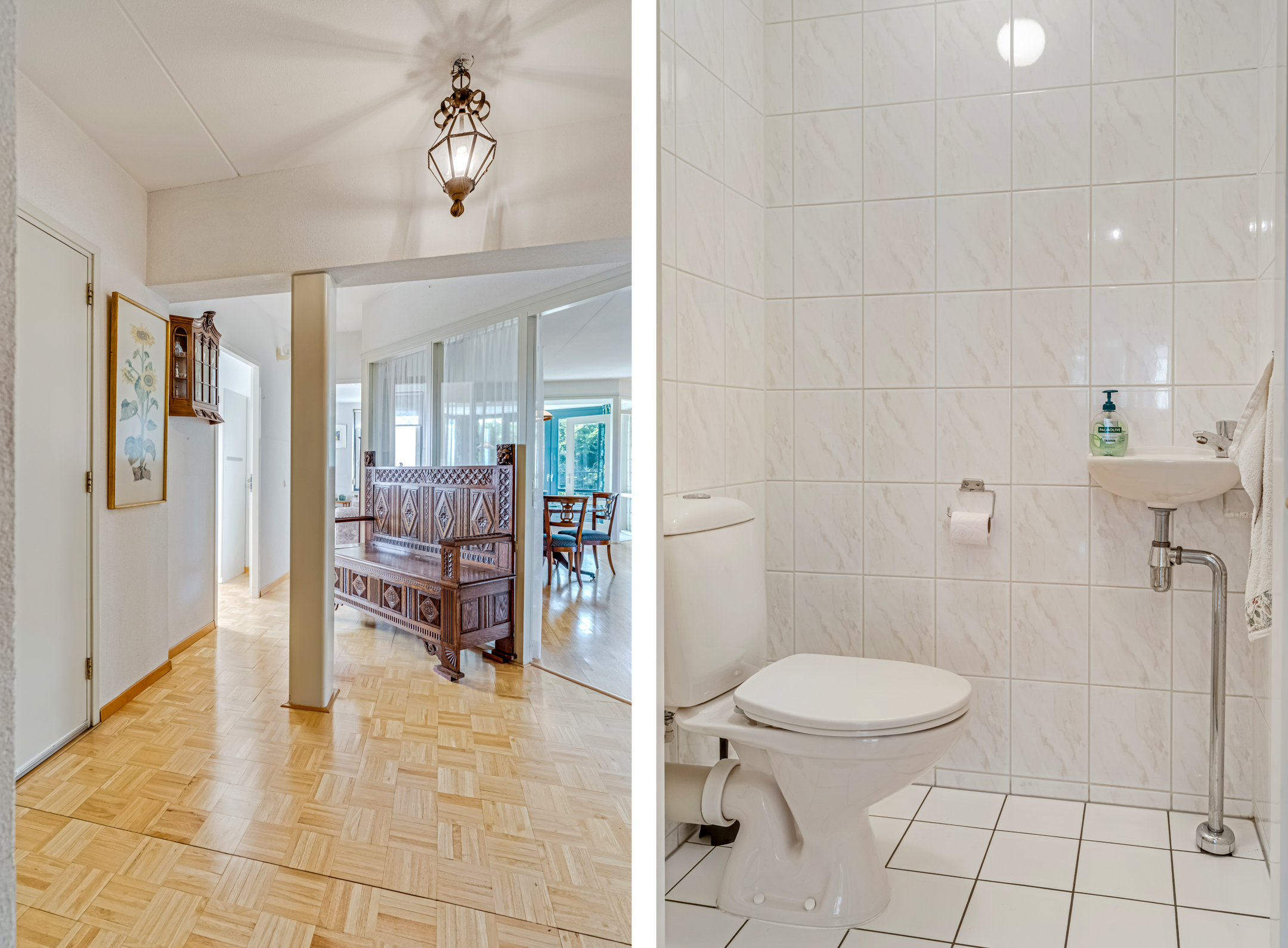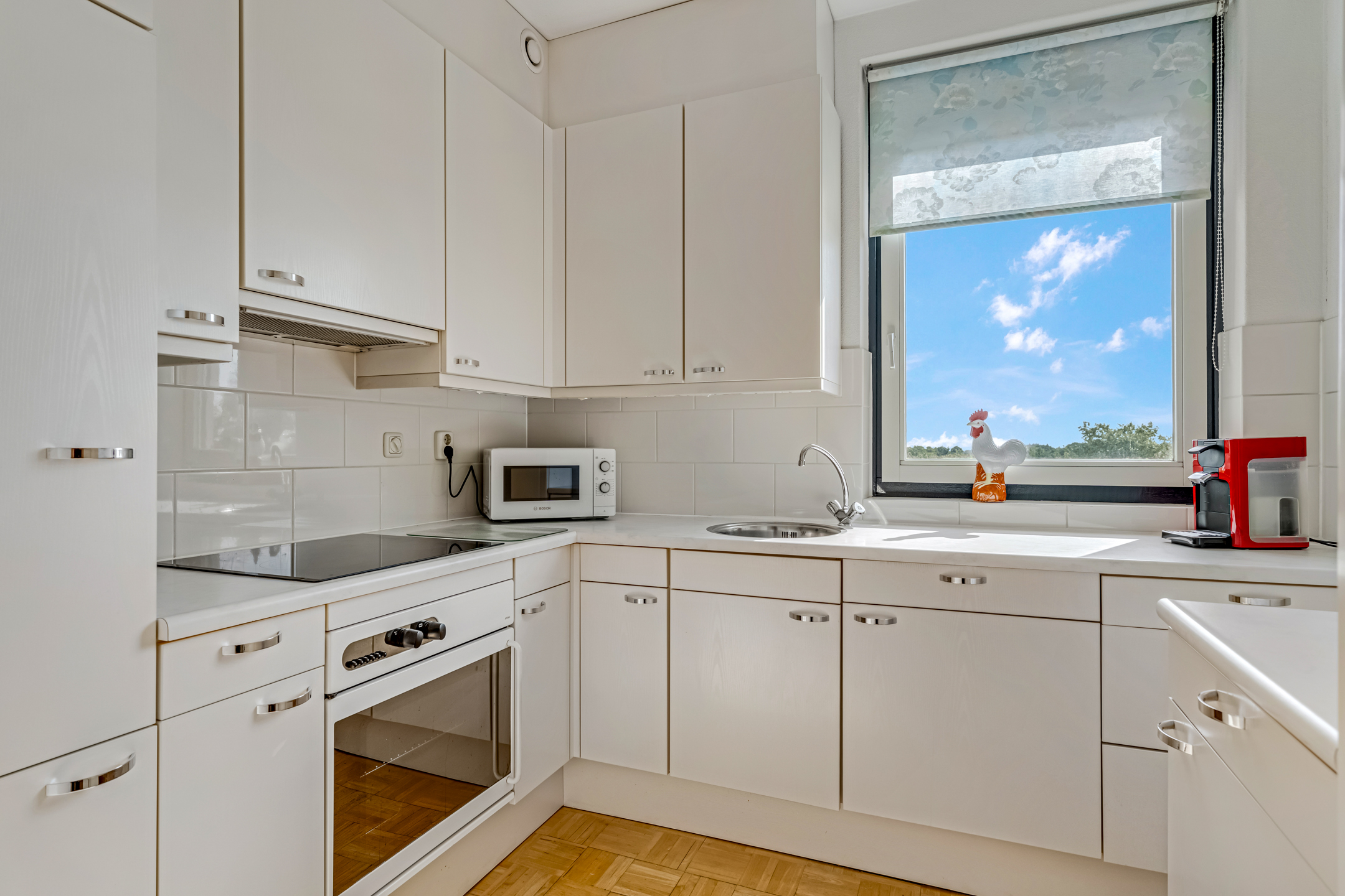 Indeling appartement: Ruime ontvangsthal met praktische bergkast en toiletruimte. De riante living is voorzien van een parketvloer en beschikt over fraaie raampartijen, zowel in de zuid- als westgevel, met een fantastisch uitzicht op de schitterende groene omgeving waar het genieten is van elk jaargetijde. De gesloten keuken beschikt over een hoekopstelling uitgevoerd met een royaal werkblad, lades en bovenkasten. De keuken is voorzien van diverse inbouwapparatuur, zoals een 4-pits inductiekookplaat met vlakschermafzuigkap, oven, koelkast met vriesvak en een vaatwasser. Aansluitend aan de living is er een heerlijke serre waar je op ieder moment van de dag kunt genieten van zon, licht en het omringende groen.
