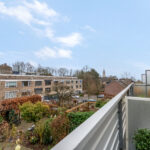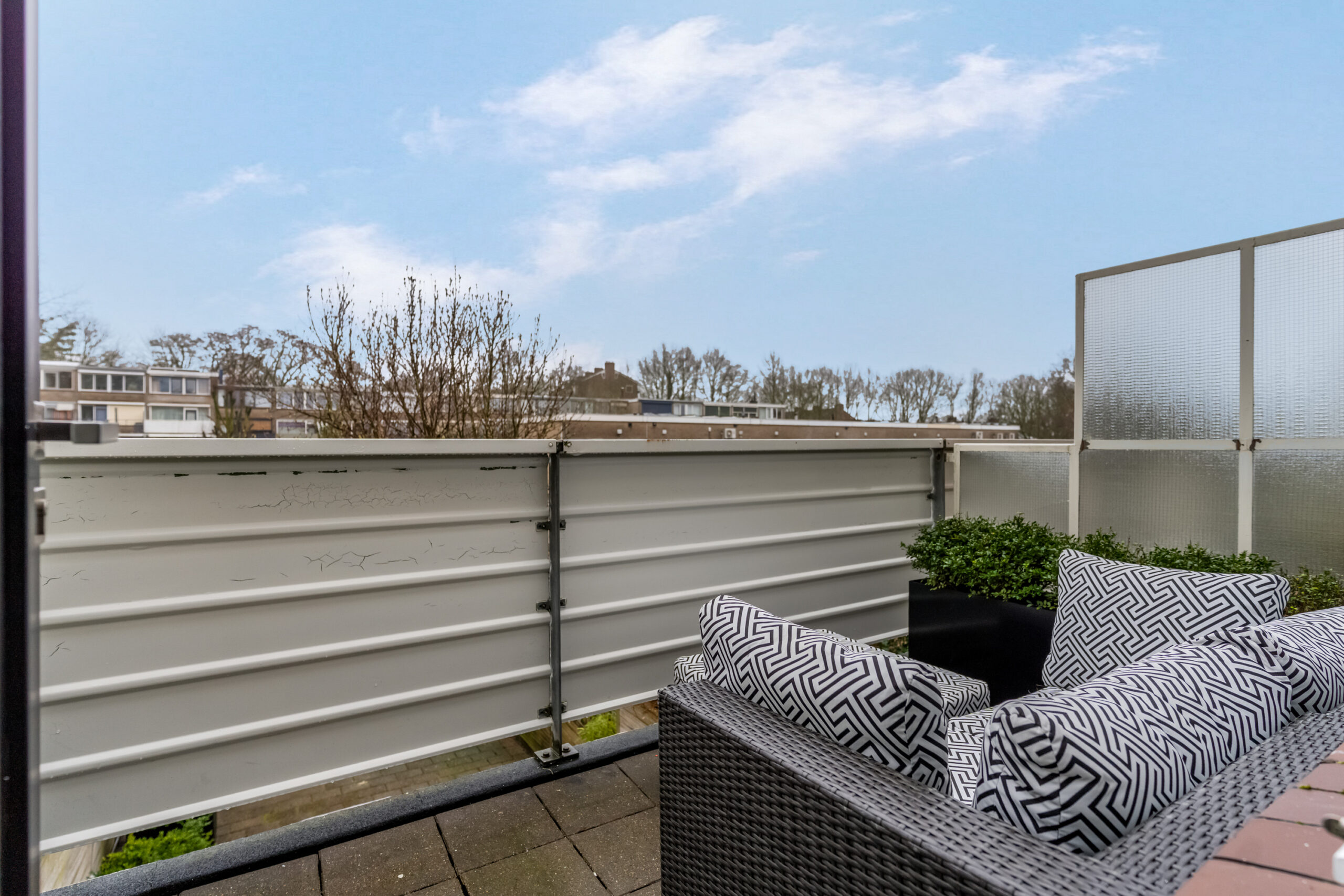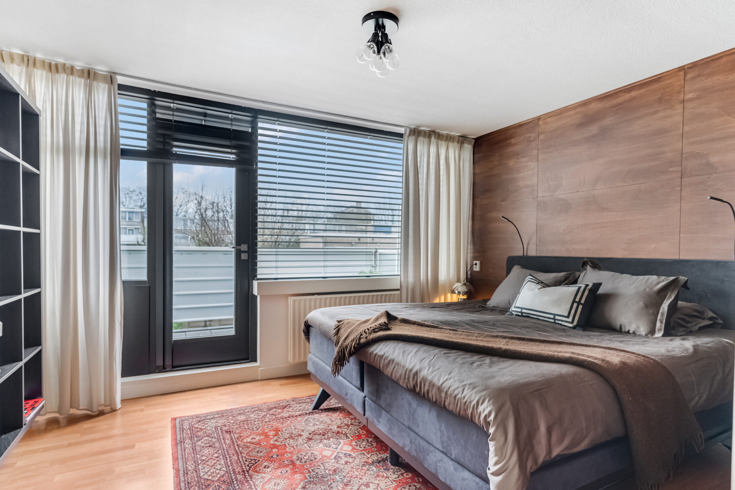 Derde niveau: Op de overloop bevindt zich een vaste kast met aansluitingen voor wassen en drogen. De ruime hoofdslaapkamer ligt aan de achterzijde en heeft een deur naar een woningbreed zonnig balkon.
