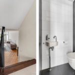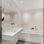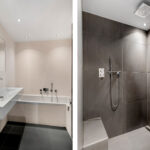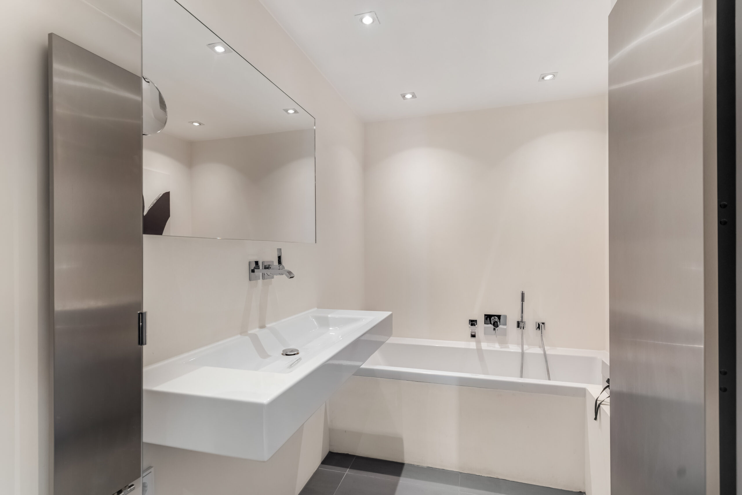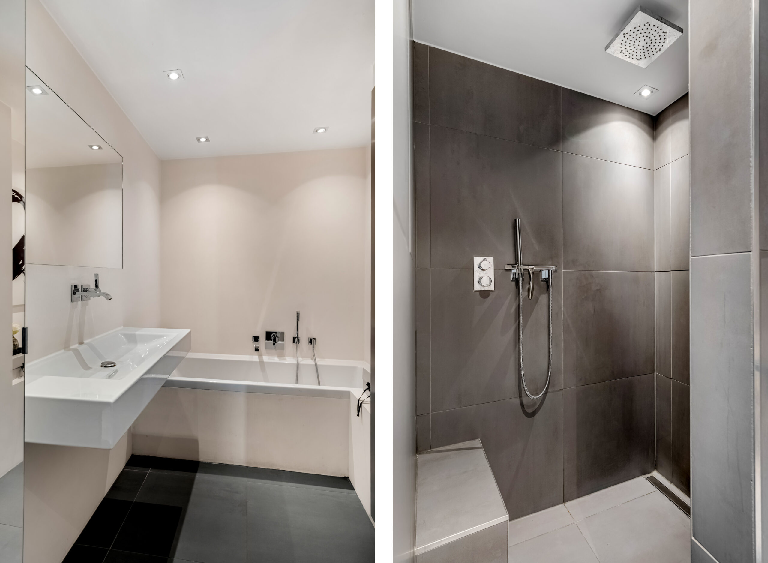 Vierde niveau: Hier vind je de moderne, geheel betegelde badkamer met wastafelmeubel, spiegel, hangende kast, inloopdouche met thermostaatkraan, ligbad met thermostaatkraan en een tweede toilet. Op dit niveau bevindt zich tevens een ruime tweede slaapkamer, momenteel in gebruik als walk-in-closet.