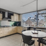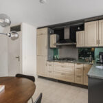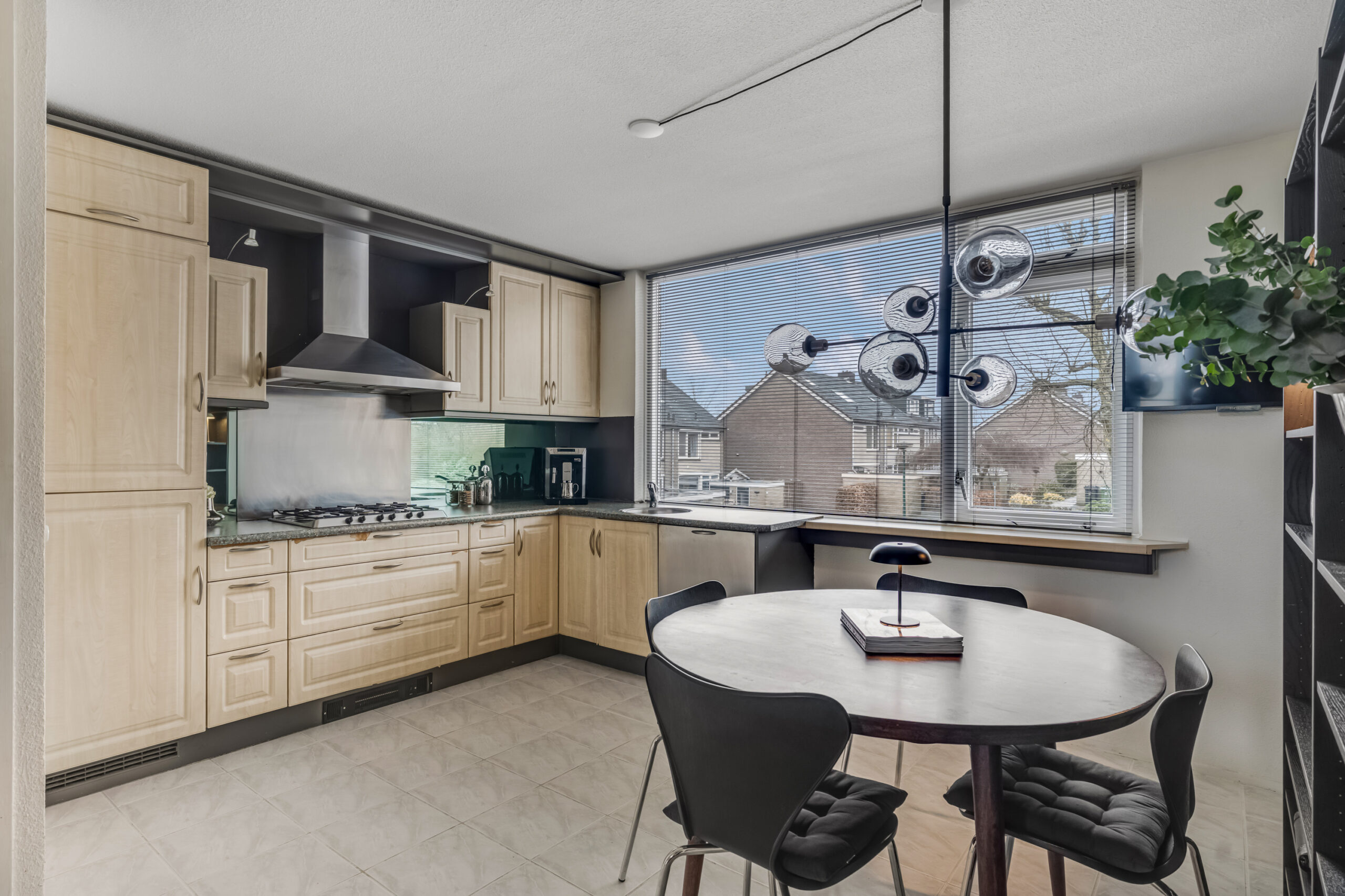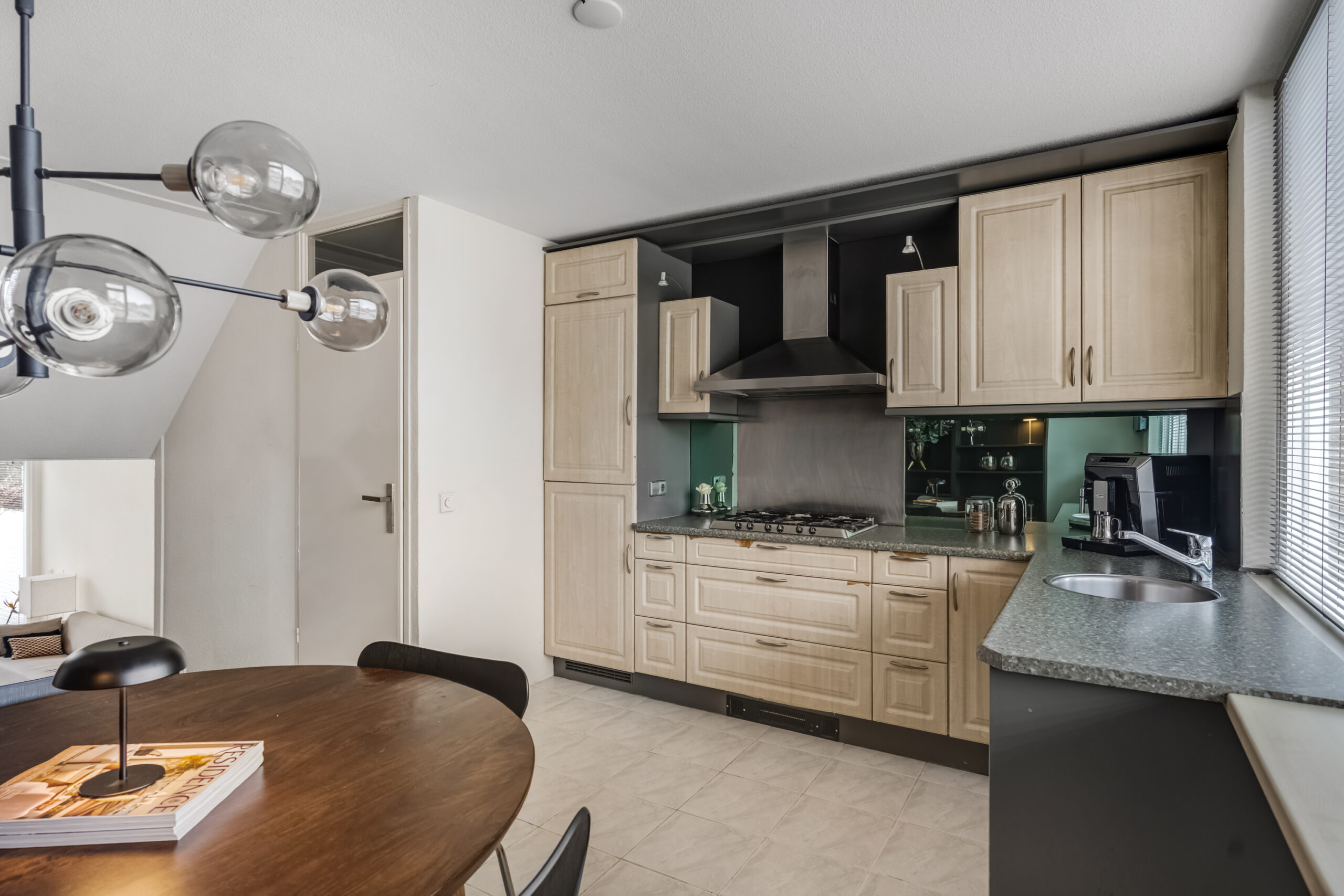 Tweede niveau: De woonkeuken is in een hoekopstelling geplaatst en beschikt over bovenkasten, een kunststof werkblad en diverse inbouwapparatuur, waaronder een 6-pits gaskooktoestel, RVS afzuigkap, koelkast, vriezer met drie lades en een vaatwasser. Aansluitend bevindt zich een halletje met vaste kast en een moderne toiletruimte.