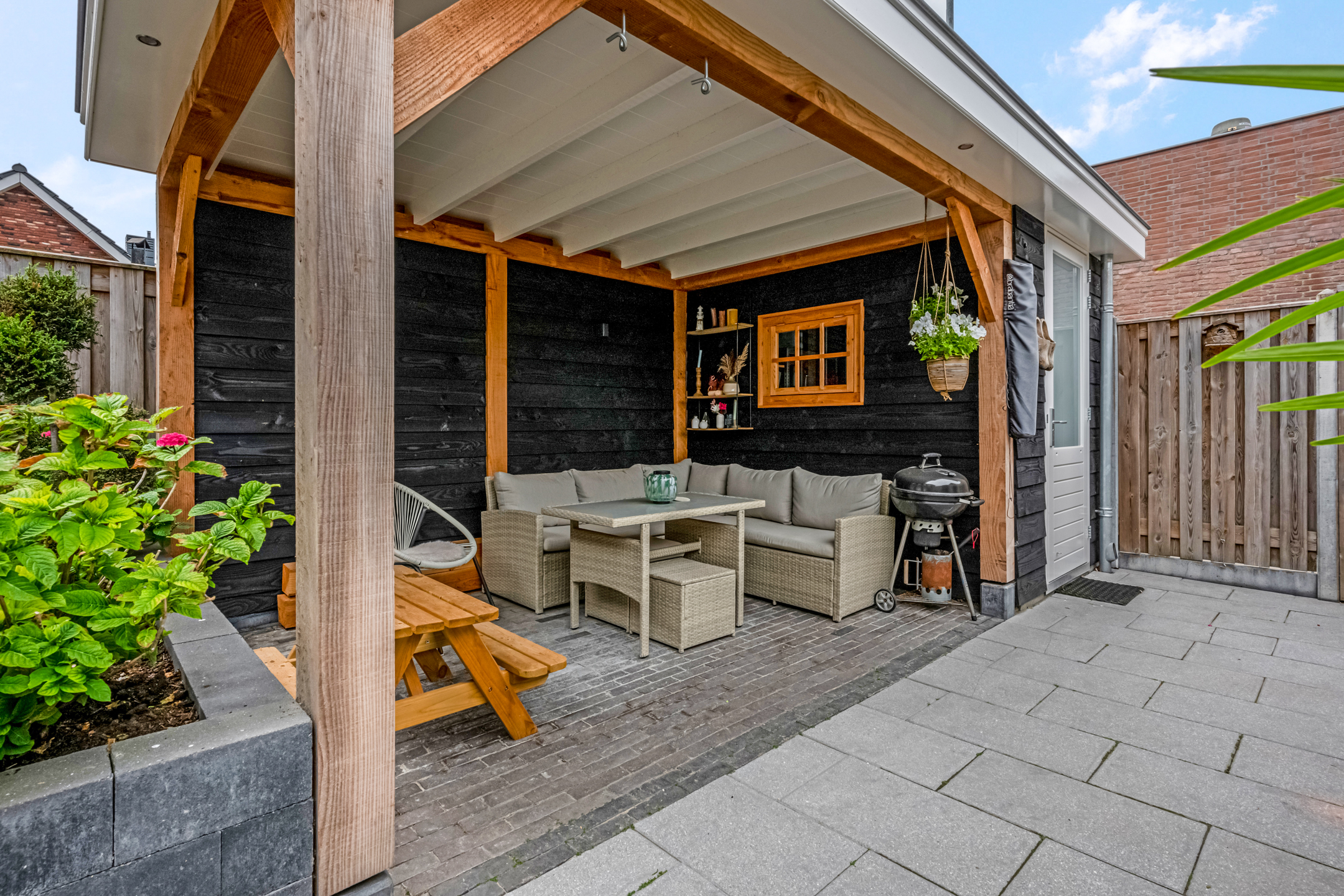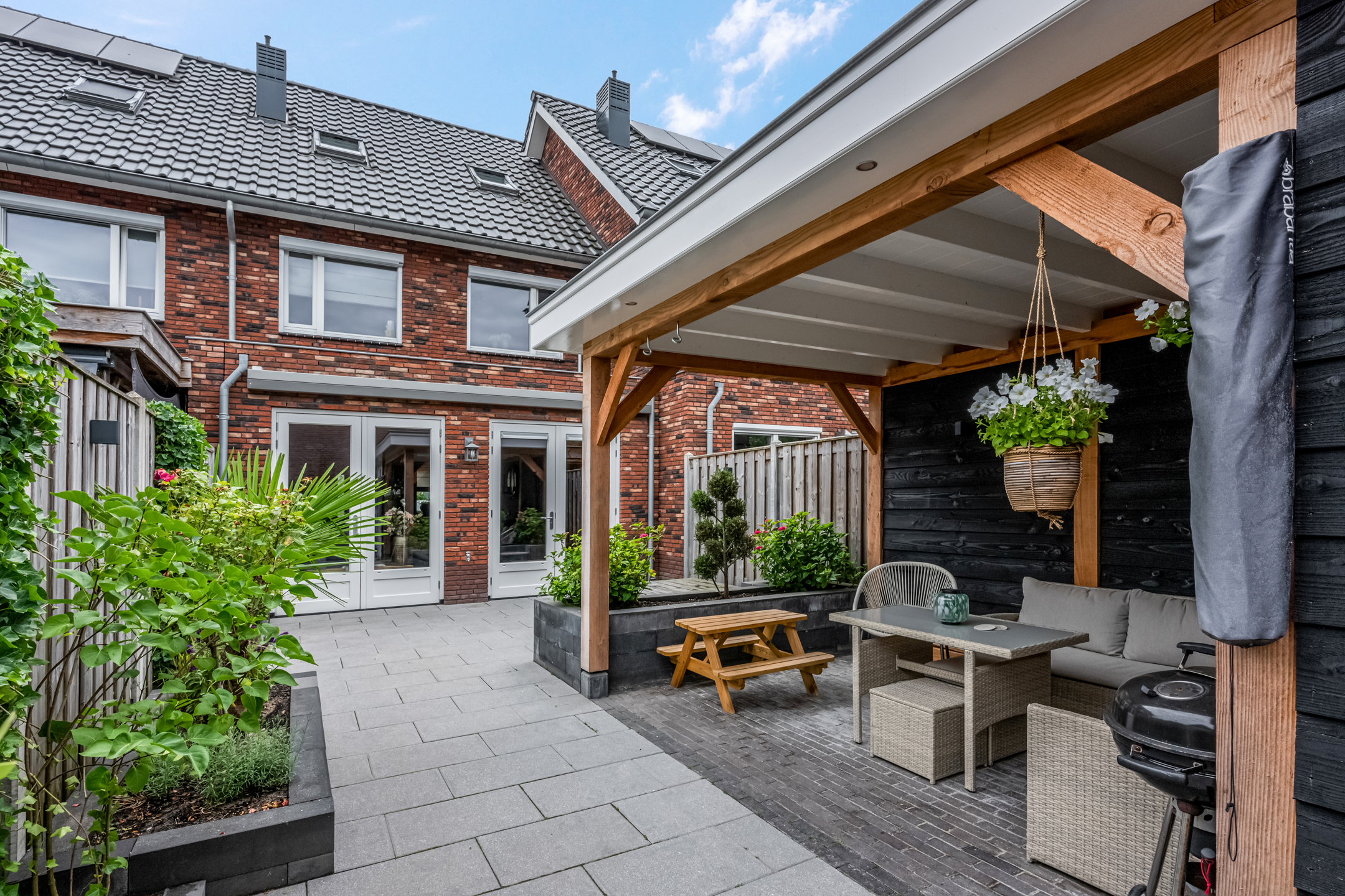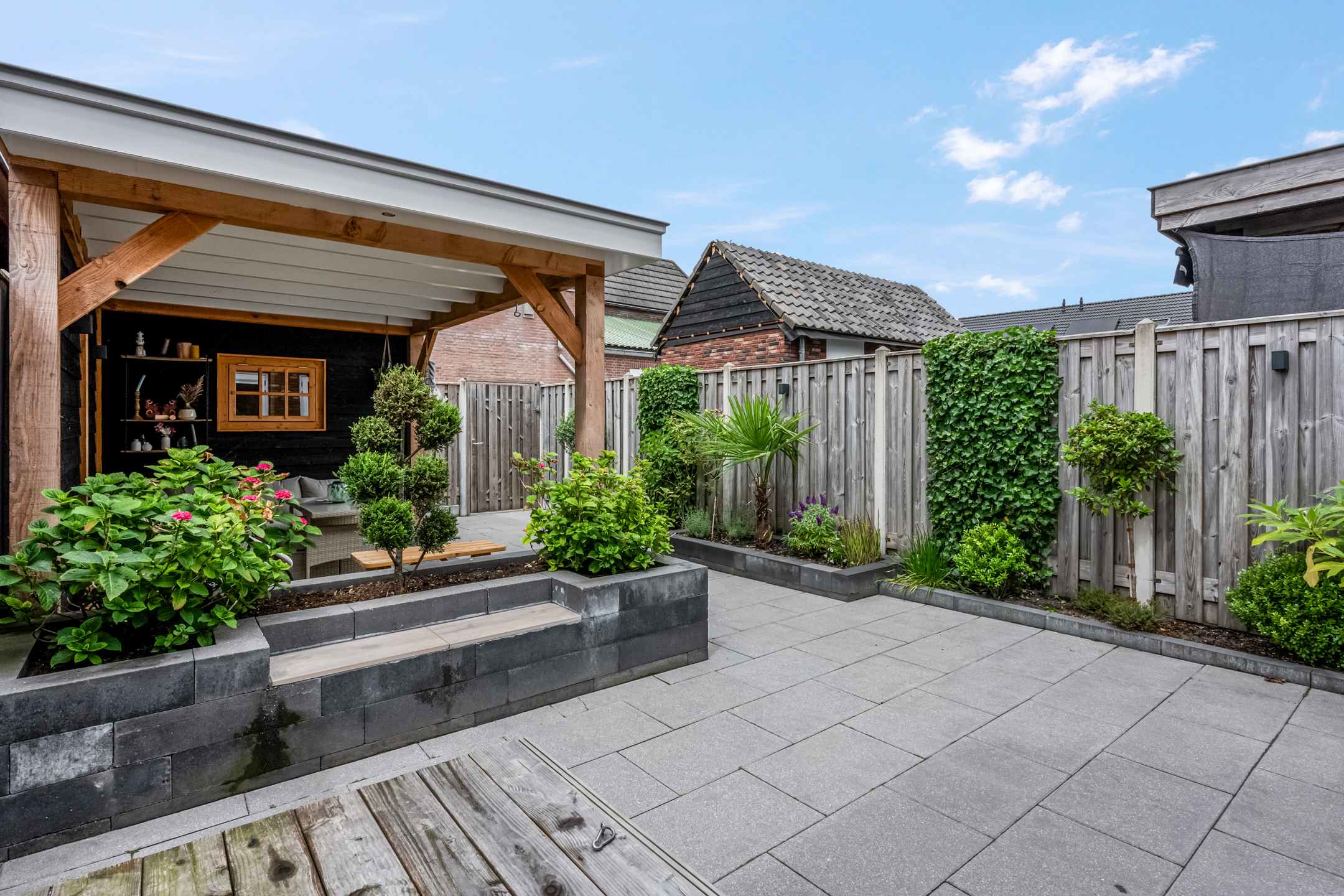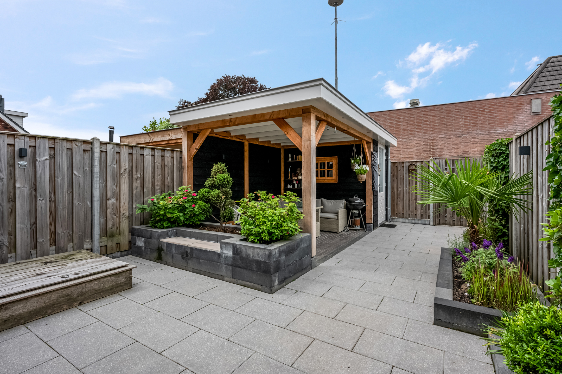 Buiten: Voortuin met sierstraatwerk en omgeven door taxushaagjes. De achtertuin is eveneens fraai en onderhoudsvriendelijk aangelegd met strak straatwerk, enkele verhoogde borders en omzoomd door betonpalen met houten schuttingdelen. De luxe veranda is een ware eye-catcher en een heerlijke plek om lange avonden te genieten van het buitenleven. Onder hetzelfde dak bevindt zich achter de veranda een praktische berging voor het stallen van fietsen. Het aanwezige elektrisch zonnescherm aan de achtergevel van de woning zorgt tevens voor een heerlijke schaduwplek op het terras op hete dagen. De achtertuin en berging zijn daarbij ook nog eens achterom bereikbaar via het aanwezige achterpad.