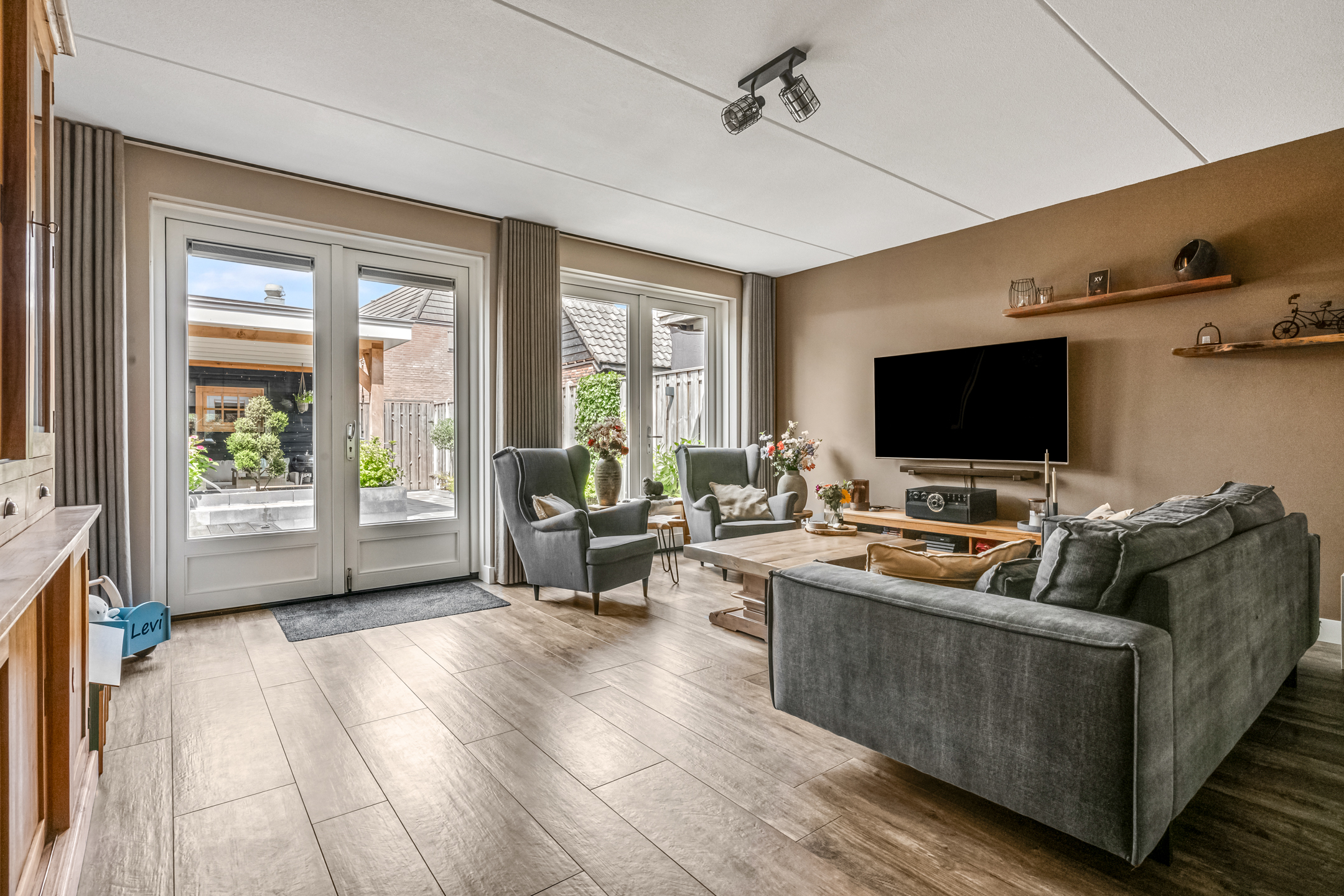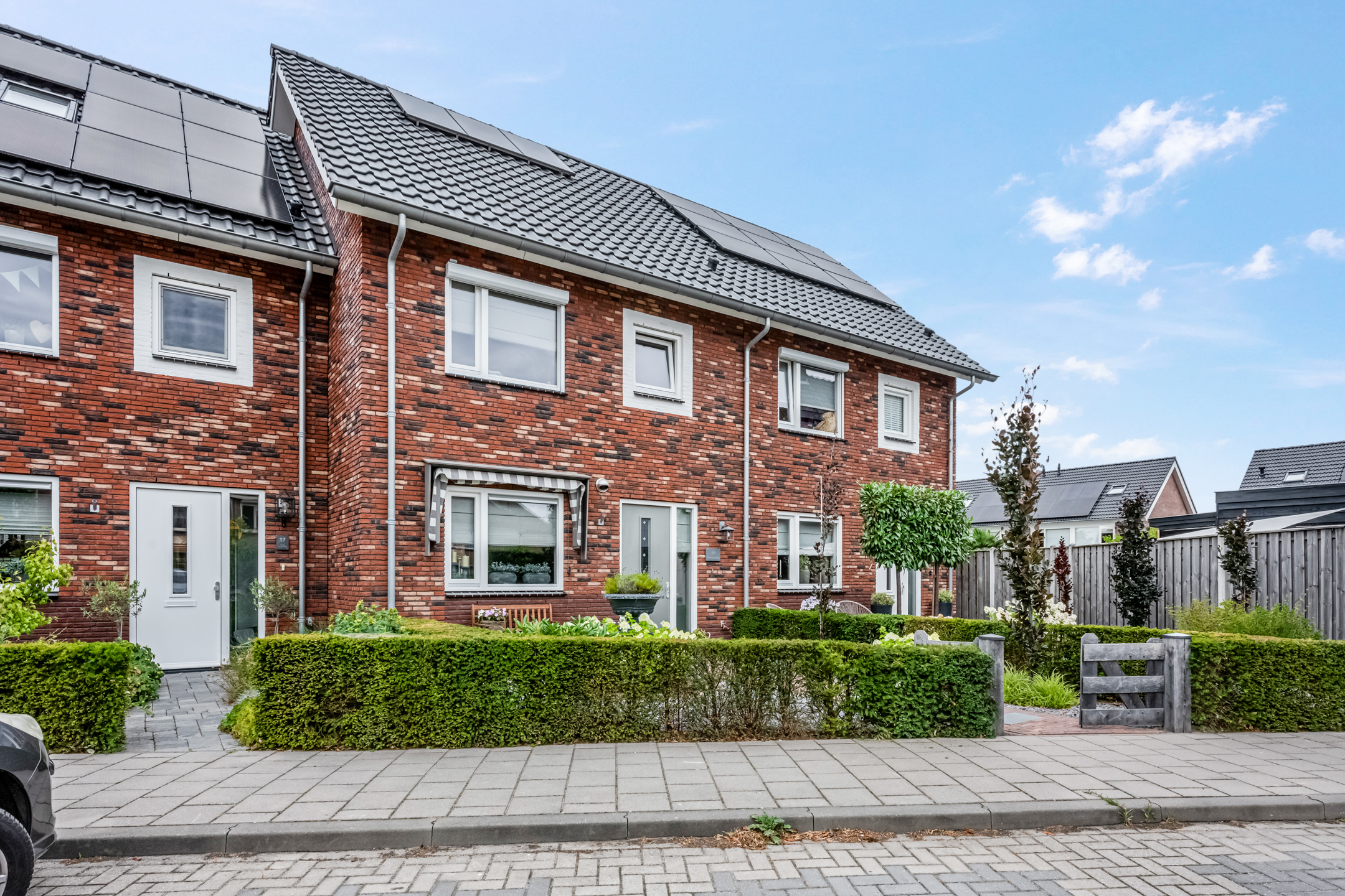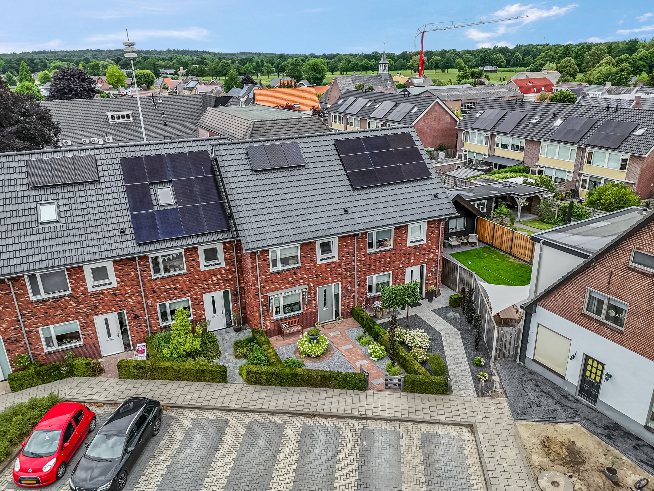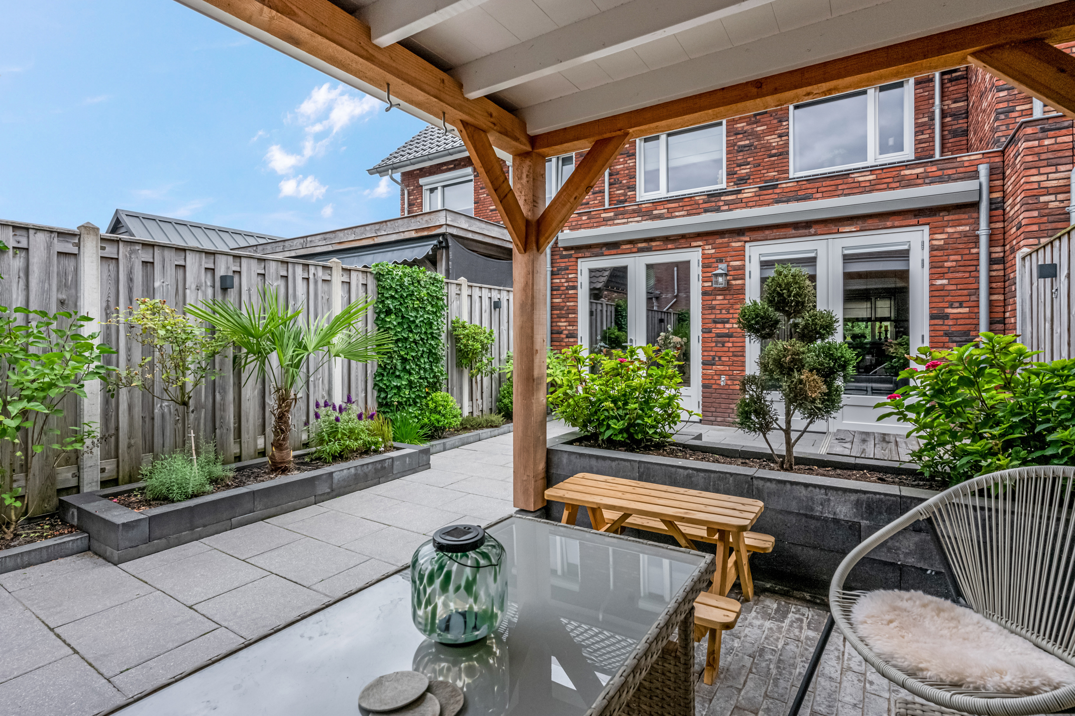Buiten: Voortuin met sierstraatwerk en omgeven door taxushaagjes. De achtertuin is eveneens fraai en onderhoudsvriendelijk aangelegd met strak straatwerk, enkele verhoogde borders en omzoomd door betonpalen met houten schuttingdelen. De luxe veranda is een ware eye-catcher en een heerlijke plek om lange avonden te genieten van het buitenleven. Onder hetzelfde dak bevindt zich achter de veranda een praktische berging voor het stallen van fietsen. Het aanwezige elektrisch zonnescherm aan de achtergevel van de woning zorgt tevens voor een heerlijke schaduwplek op het terras op hete dagen. De achtertuin en berging zijn daarbij ook nog eens achterom bereikbaar via het aanwezige achterpad.