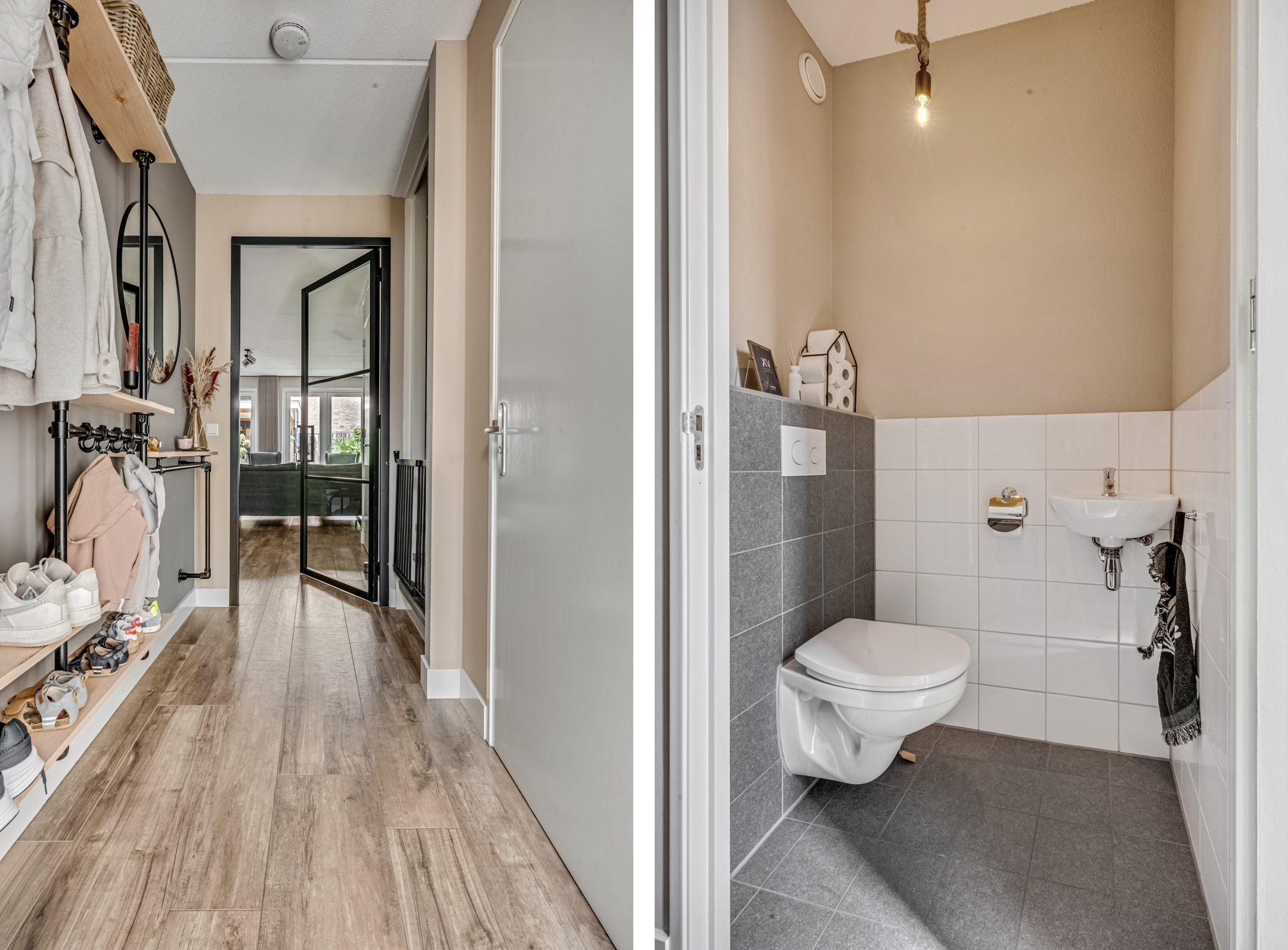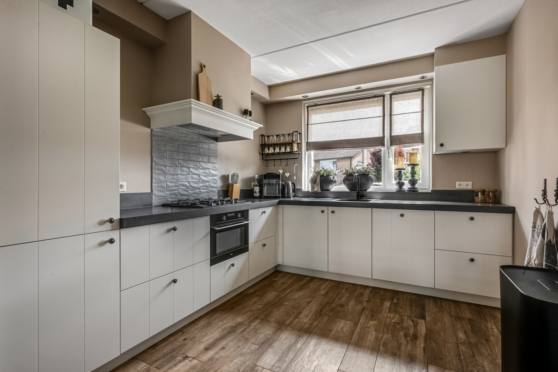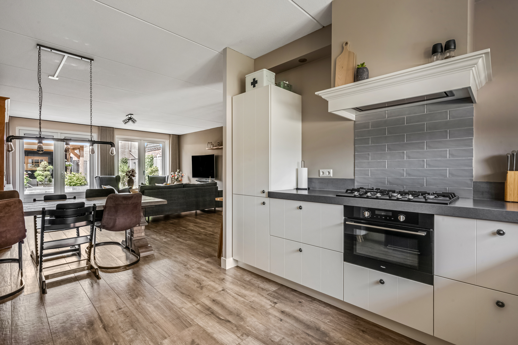 Begane grond: entree/hal met trap naar de 1e verdieping en toegang tot de moderne toiletruimte en meterkast. De woonkamer is aan de achterzijde uitgebouwd, beschikt over een mooie pvc-vloer, praktische trapkast en een dubbele set openslaande deuren naar de achtertuin. Aan de voorzijde bevindt zich de open keuken die is uitgevoerd in een smaakvolle hoekopstelling met veel kast- en werkruimte en spots in de aanwezige koof. De keuken is voorzien van een 5-pits gaskookplaat, afzuigschouw, koel-/vriescombinatie, vaatwasser en combi-oven. De gehele begane grondvloer is voorzien van een smaakvolle tegelvloer met vloerverwarming.