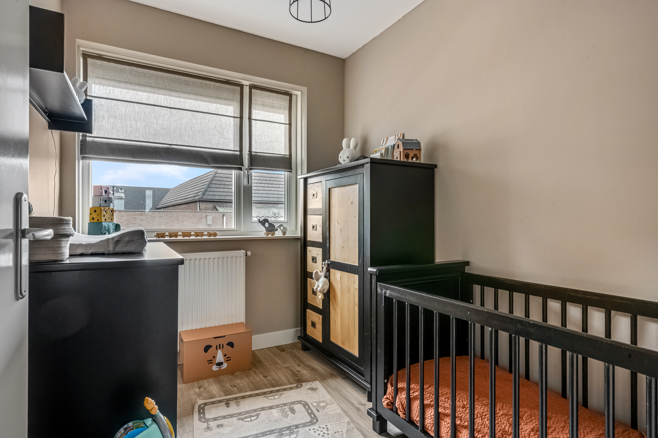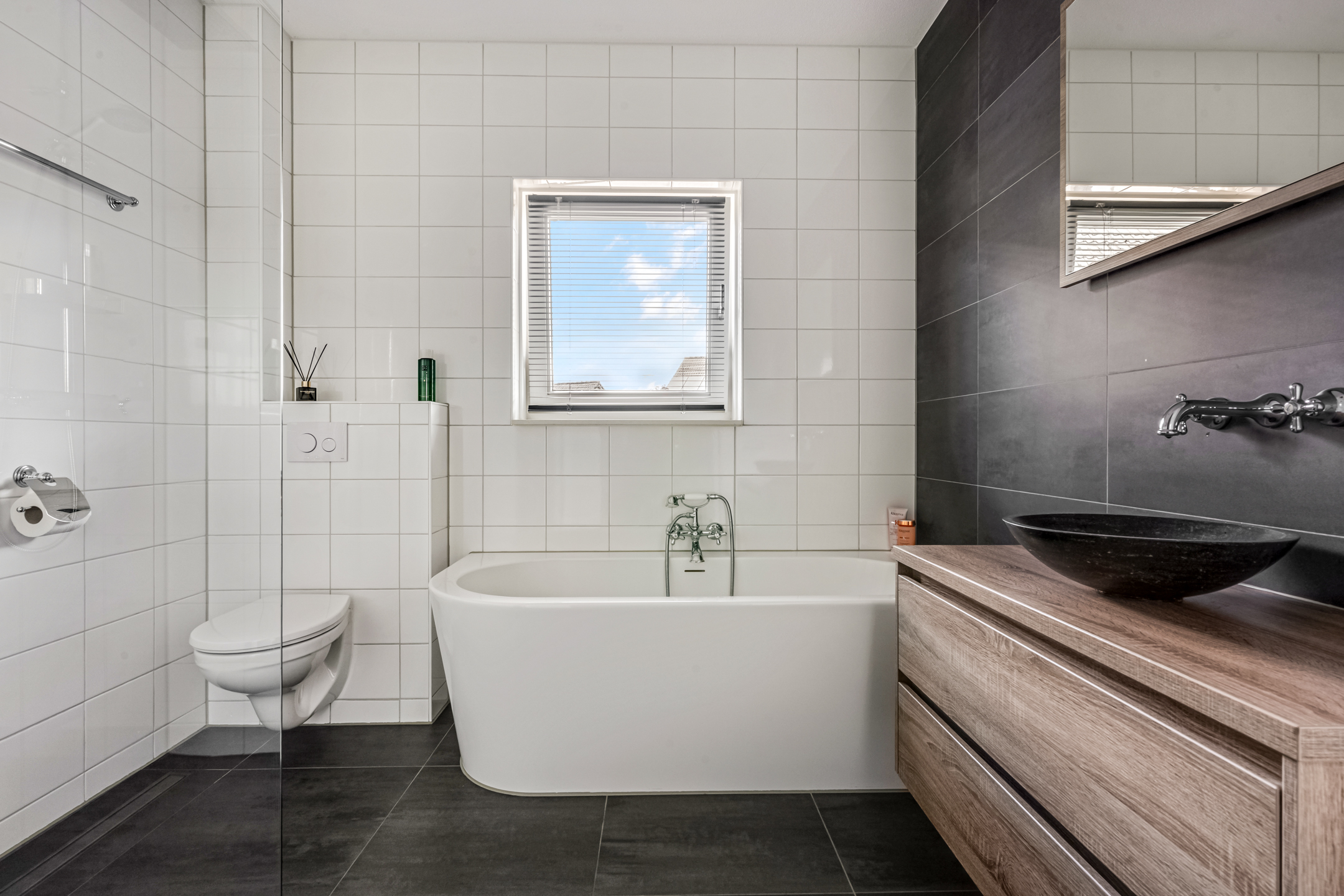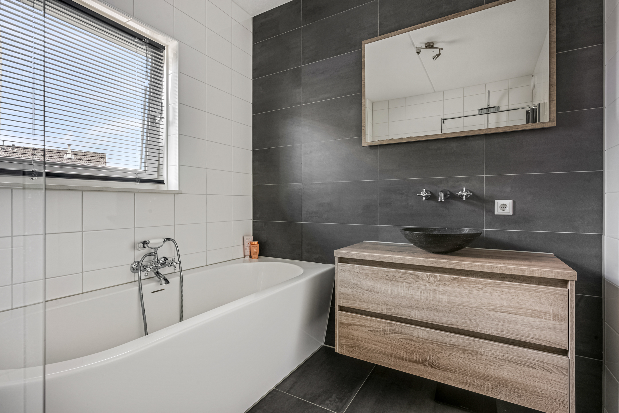 1e verdieping: overloop met trap naar de 2e verdieping. De 3 ruime en strak afgewerkte slaapkamers met gestuukte wanden en een lichte pvc-vloer. De slaapkamers zijn voorzien van elektrisch bedienbare rolluiken. De badkamer is geheel betegeld en beschikt over een ligbad, douchehoek met stortdouche, badkamermeubel met waskom en bijpassende spiegel. Ook de badkamer is voorzien van vloerverwarming.