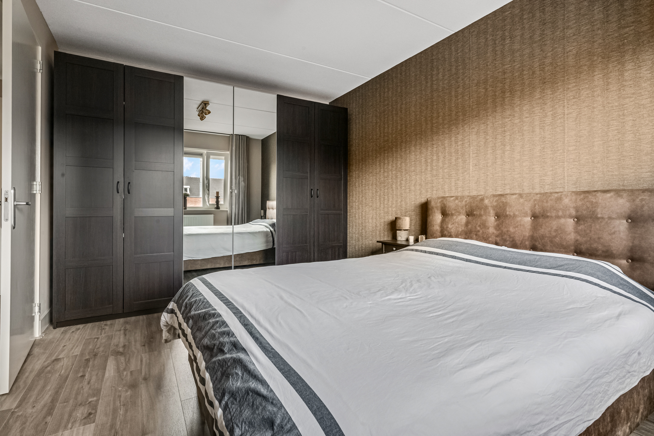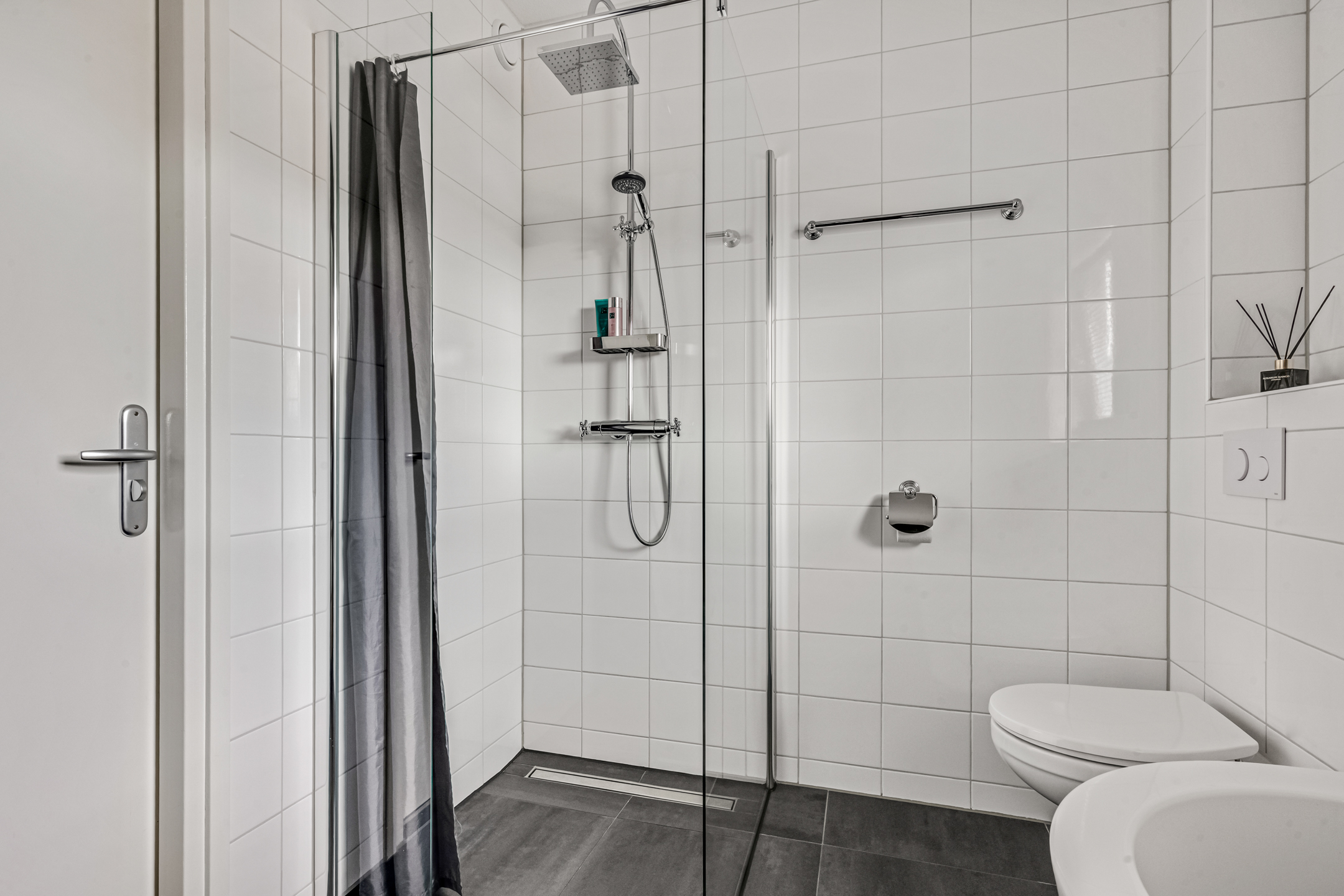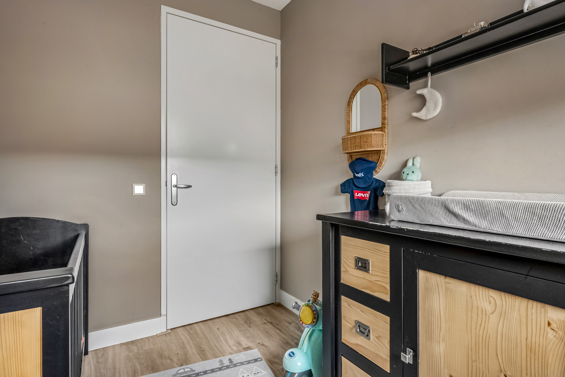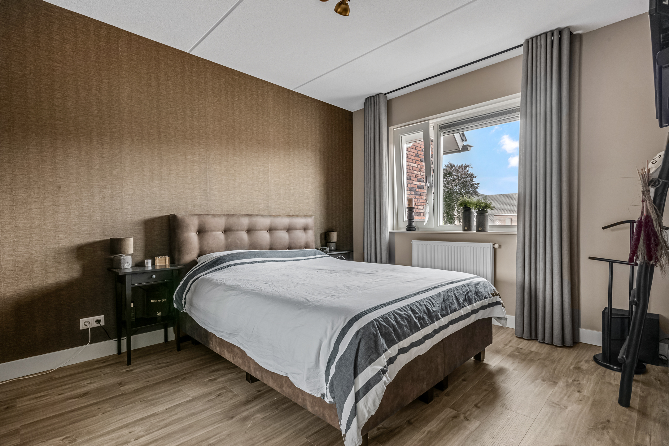1e verdieping: overloop met trap naar de 2e verdieping. De 3 ruime en strak afgewerkte slaapkamers met gestuukte wanden en een lichte pvc-vloer. De slaapkamers zijn voorzien van elektrisch bedienbare rolluiken. De badkamer is geheel betegeld en beschikt over een ligbad, douchehoek met stortdouche, badkamermeubel met waskom en bijpassende spiegel. Ook de badkamer is voorzien van vloerverwarming.