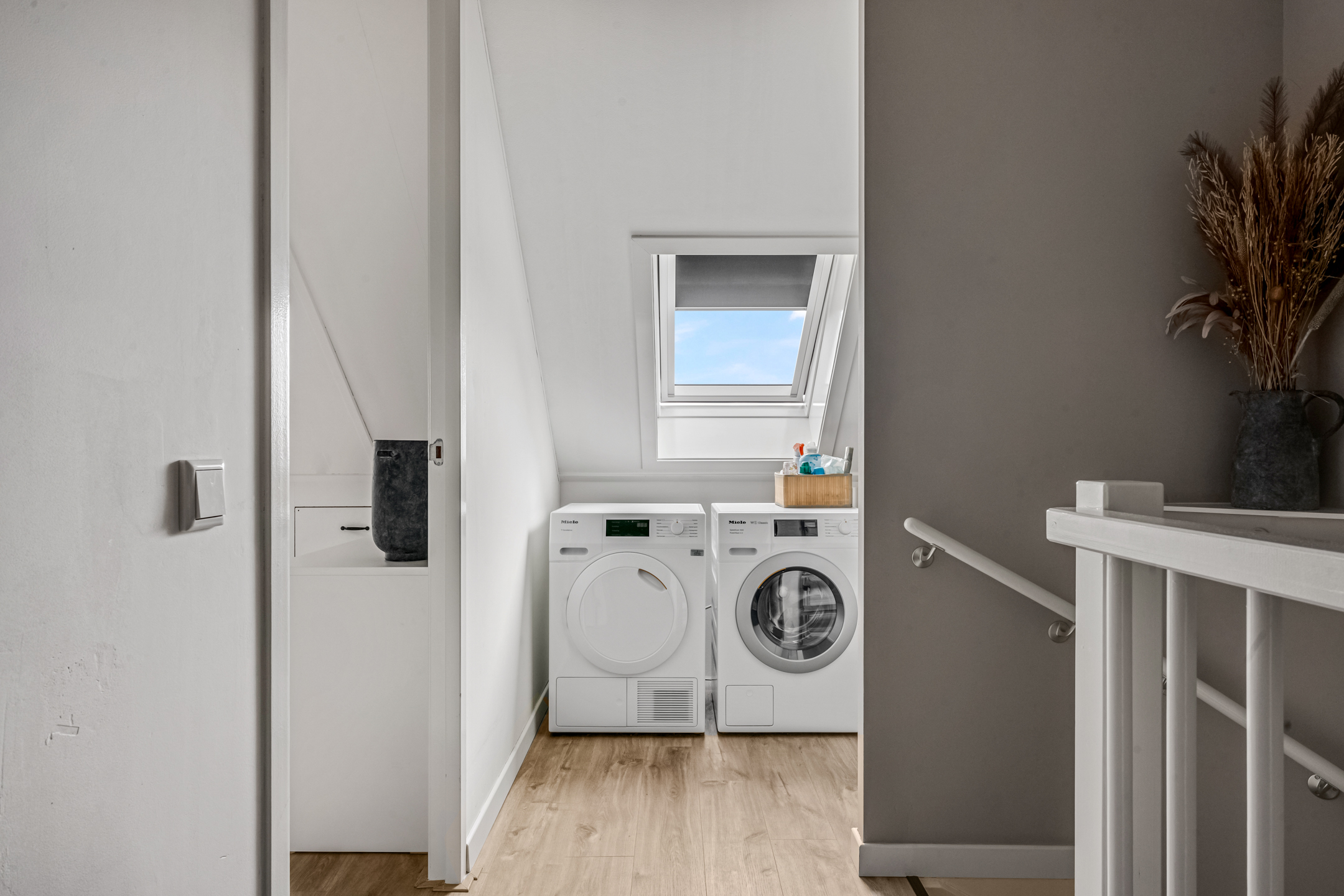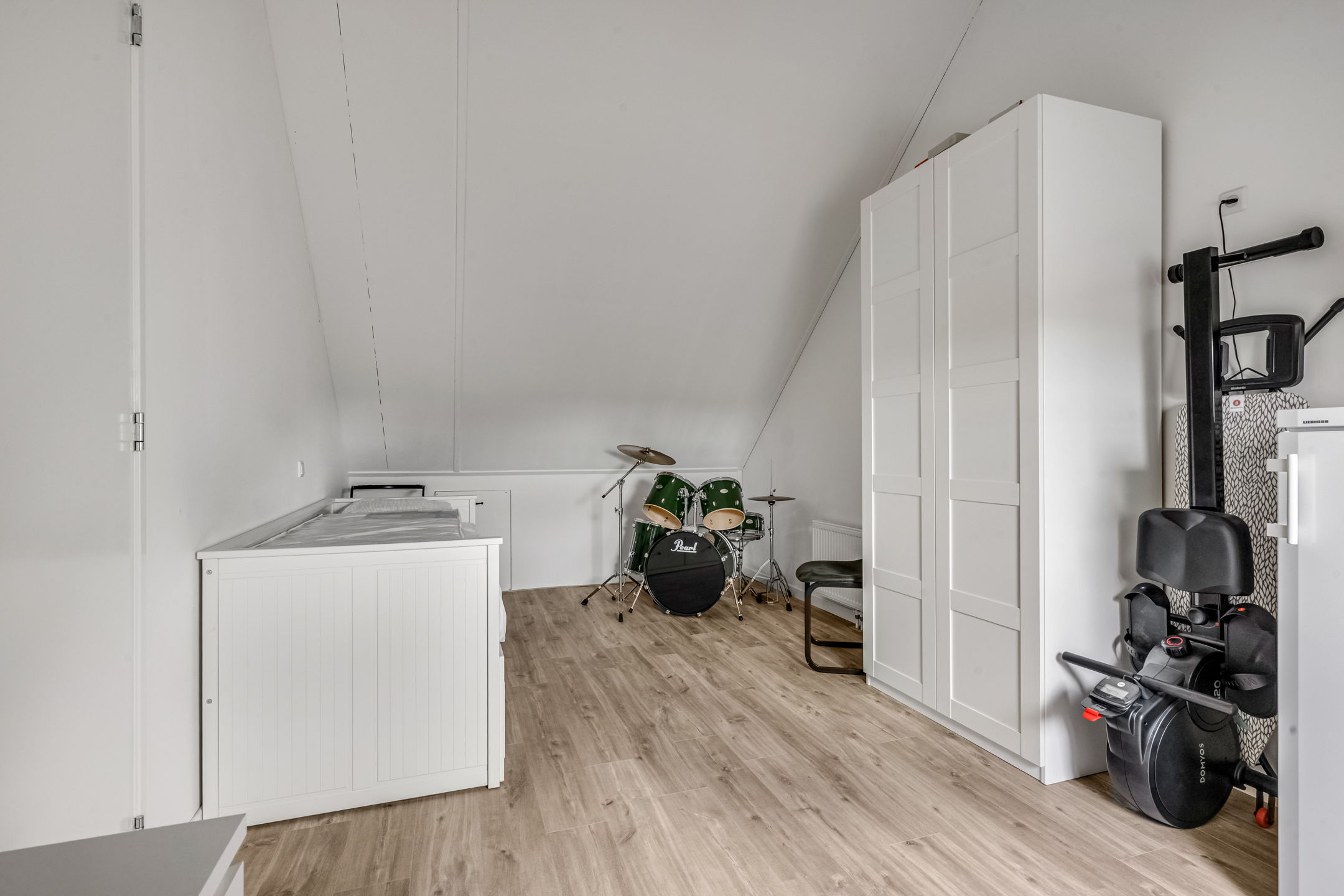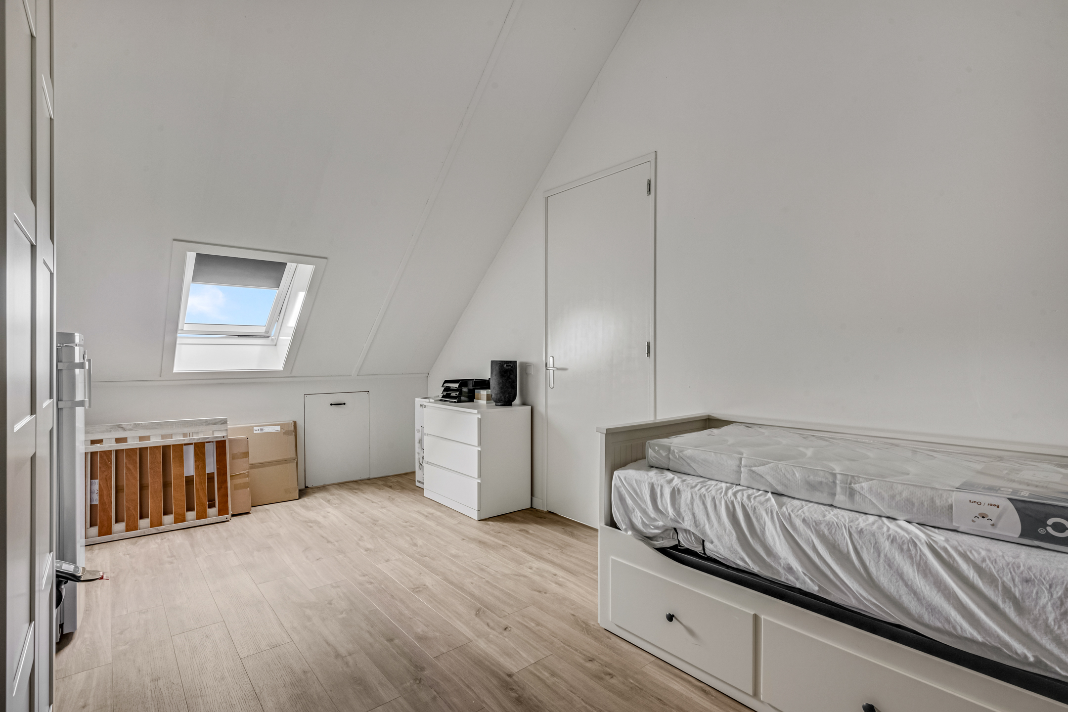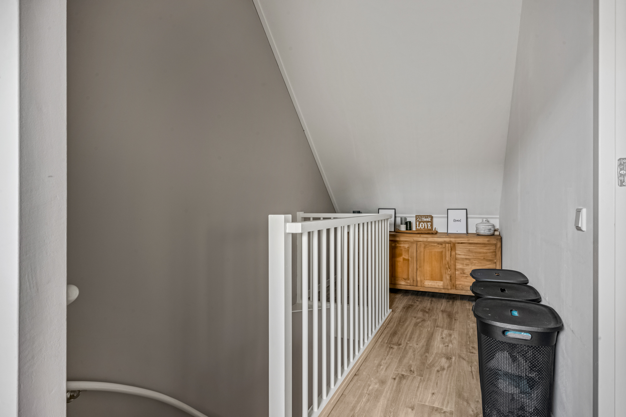 2e verdieping: deze verdieping is opgedeeld in een overloop/voorzolder en een royale zolderkamer die beiden zijn voorzien van een groot dakvenster en wederom fraai zijn afgewerkt met een pvc-vloer. Op de voorzolder bevinden zich de aansluitpunten voor de wasmachine en droger. Tevens bevinden zich hier de cv-combiketel en omvormer van de zonnepanelen. De slaapkamer is dermate groot en hoog dat er nog mogelijkheid is voor het realiseren van een extra kamer en/of bergzolder.