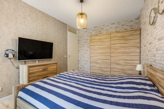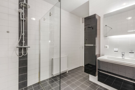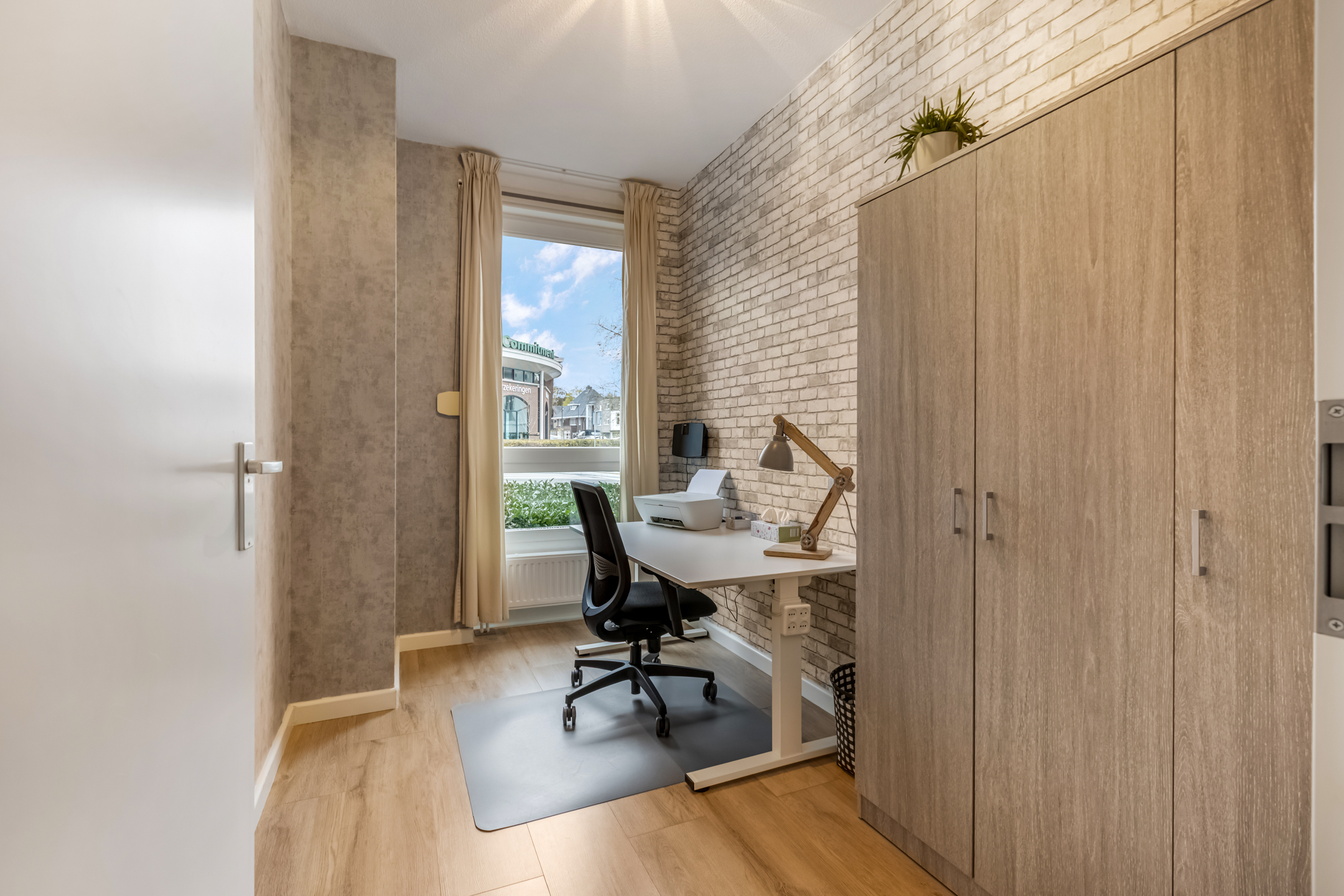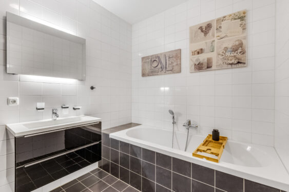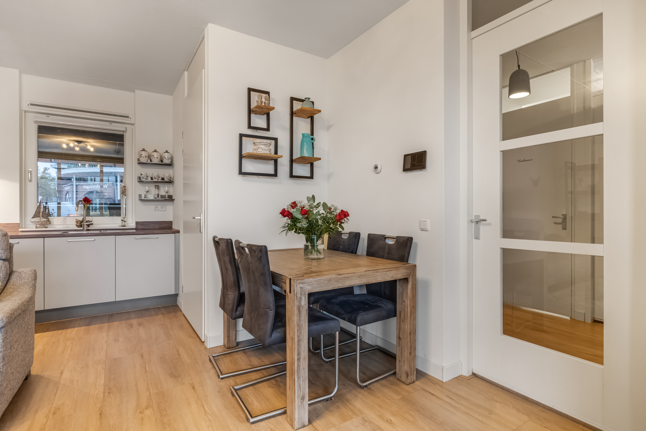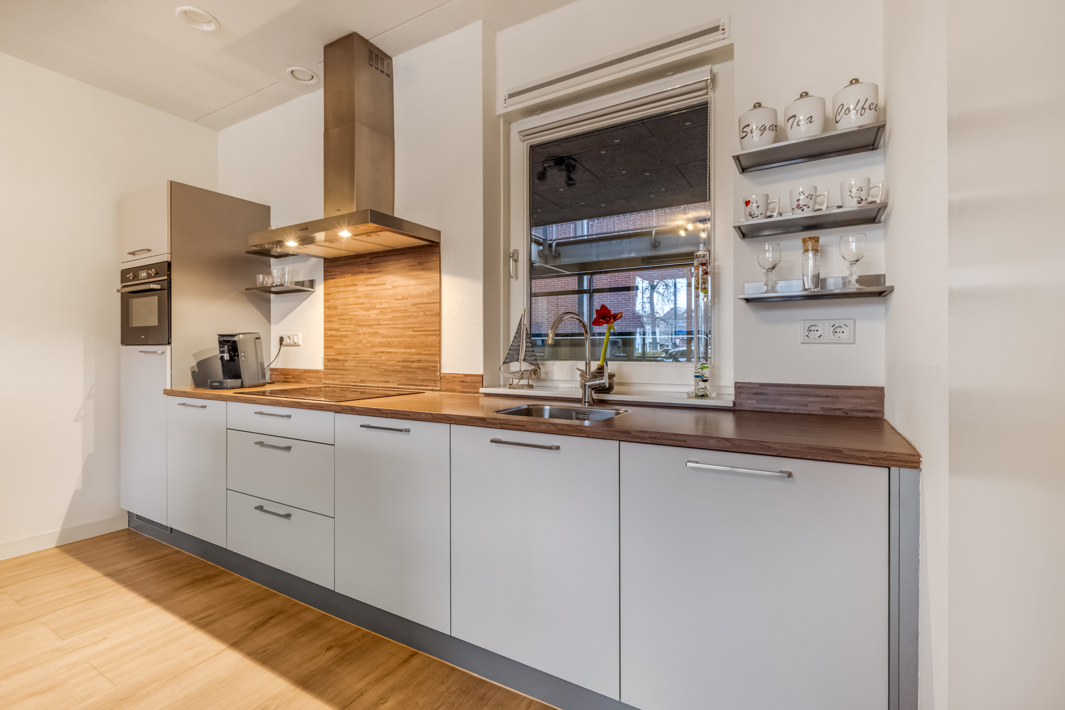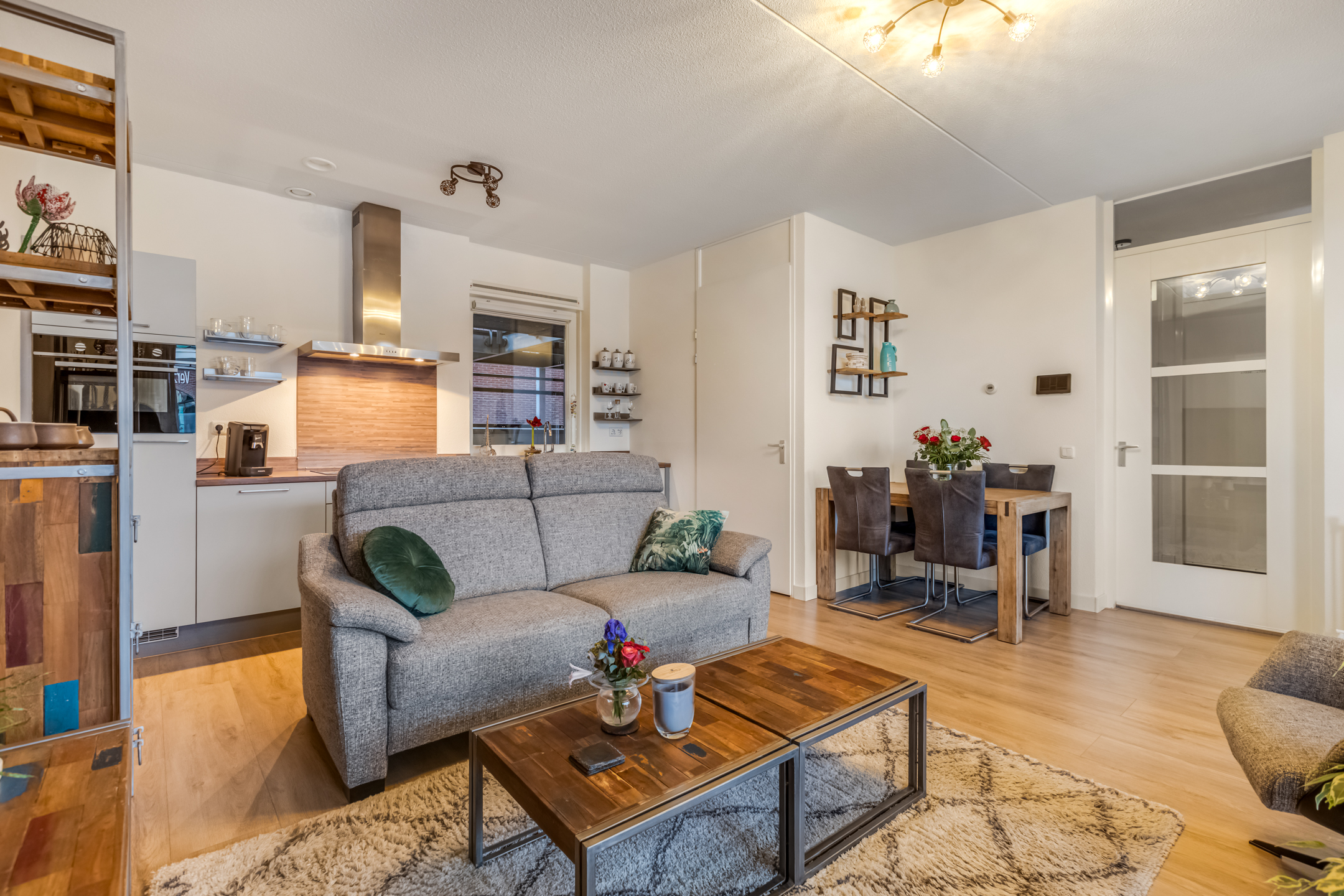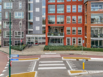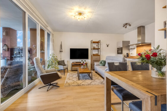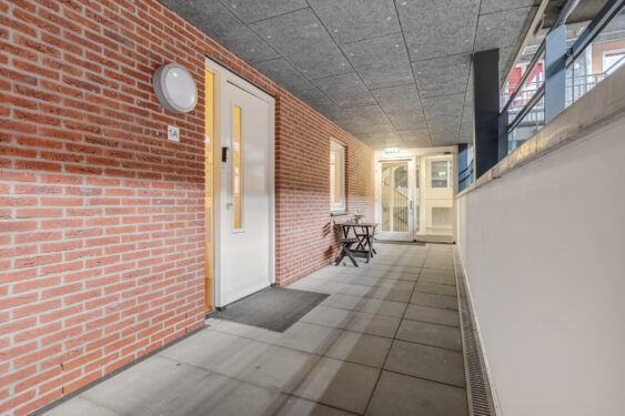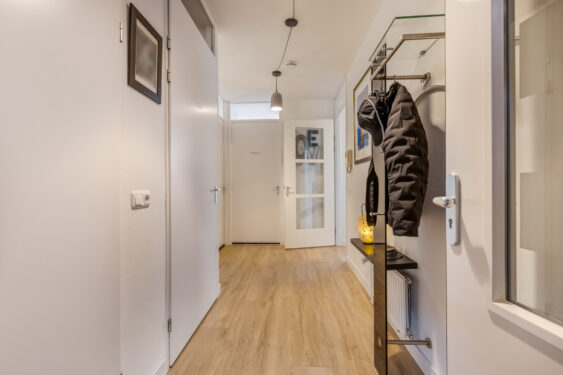 Binnenkomst in de royale ontvangsthal met garderobe, meterkast en verzorgde toiletruimte met fonteintje. De woonkamer heeft grote raampartijen en een moderne open keuken aan de galerijzijde. De moderne keuken is voorzien van diverse inbouwapparatuur, waaronder een 4-pits inductiekookplaat met afzuigschouw, vaatwasser, combi-oven, koelkast met vriesvak en veel opbergruimte. Aangrenzend is een handige inpandige berging met ruimte voor de cv-ketel, aansluitingen voor de wasmachine en droger en de opslag voor de boodschappen. De twee slaapkamers liggen aan de straatzijde; de hoofdslaapkamer biedt volop ruimte voor een groot bed en kastenwand, terwijl de tweede kamer ideaal is als logeer- of werkkamer. De badkamer is strak afgewerkt met een ruime inloopdouche, modern wastafelmeubel met verlichte spiegel en een praktische opbergkast.