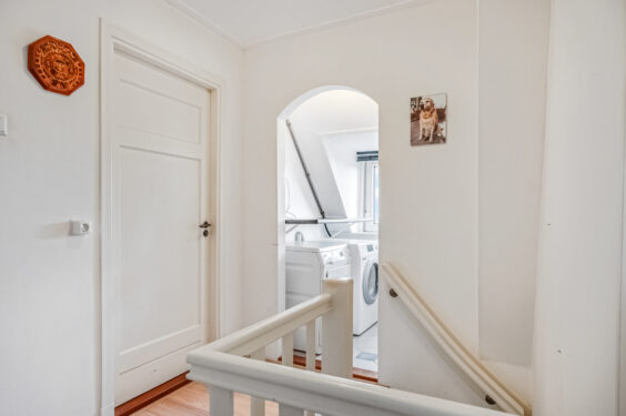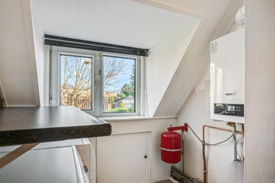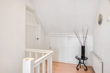 1e verdieping: Overloop met toegang tot een praktische wasruimte waar tevens de cv-combiketel is geplaatst. De verdieping beschikt over één ruime slaapkamer met inbouwkasten, airco en handmatige screens.