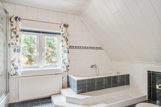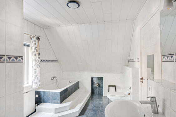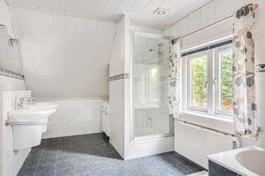 Daarnaast vind je hier een zeer royale, volledig betegelde badkamer met dubbele wastafel, spiegel, douche, ligbad en toilet.
