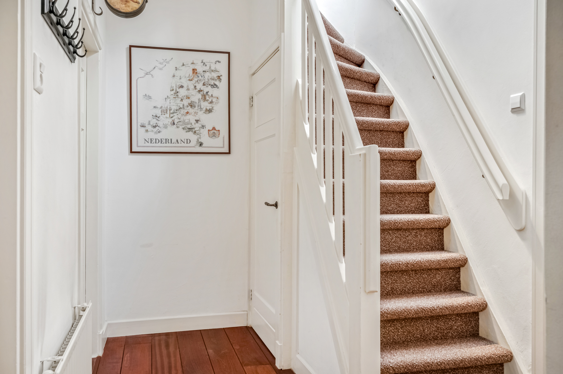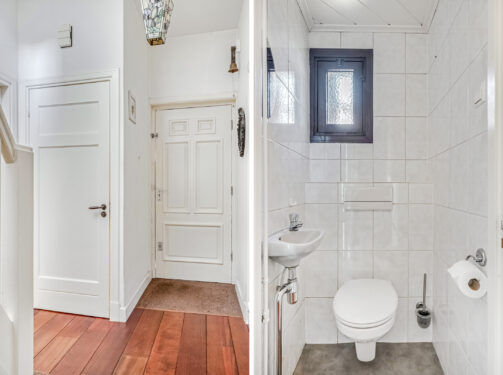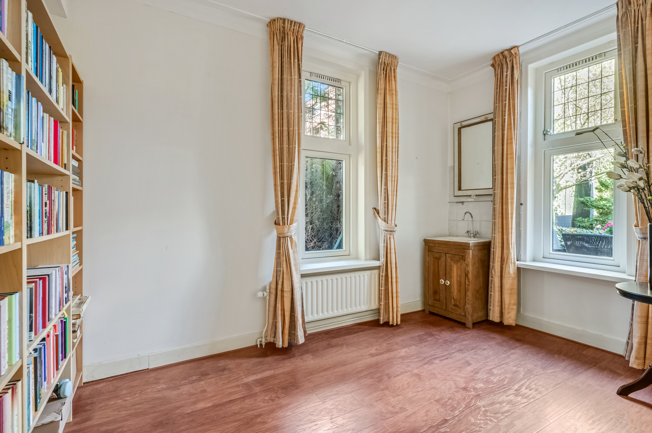 Begane grond: Entree met garderoberuimte, toilet met fonteintje en toegang tot de ruime provisiekelder (stahoogte). Aan de voorzijde ligt een fijne werkkamer, aan de achterzijde een tweede kamer die uitstekend dienstdoet als slaapkamer, compleet met charmant wastafelmeubel.