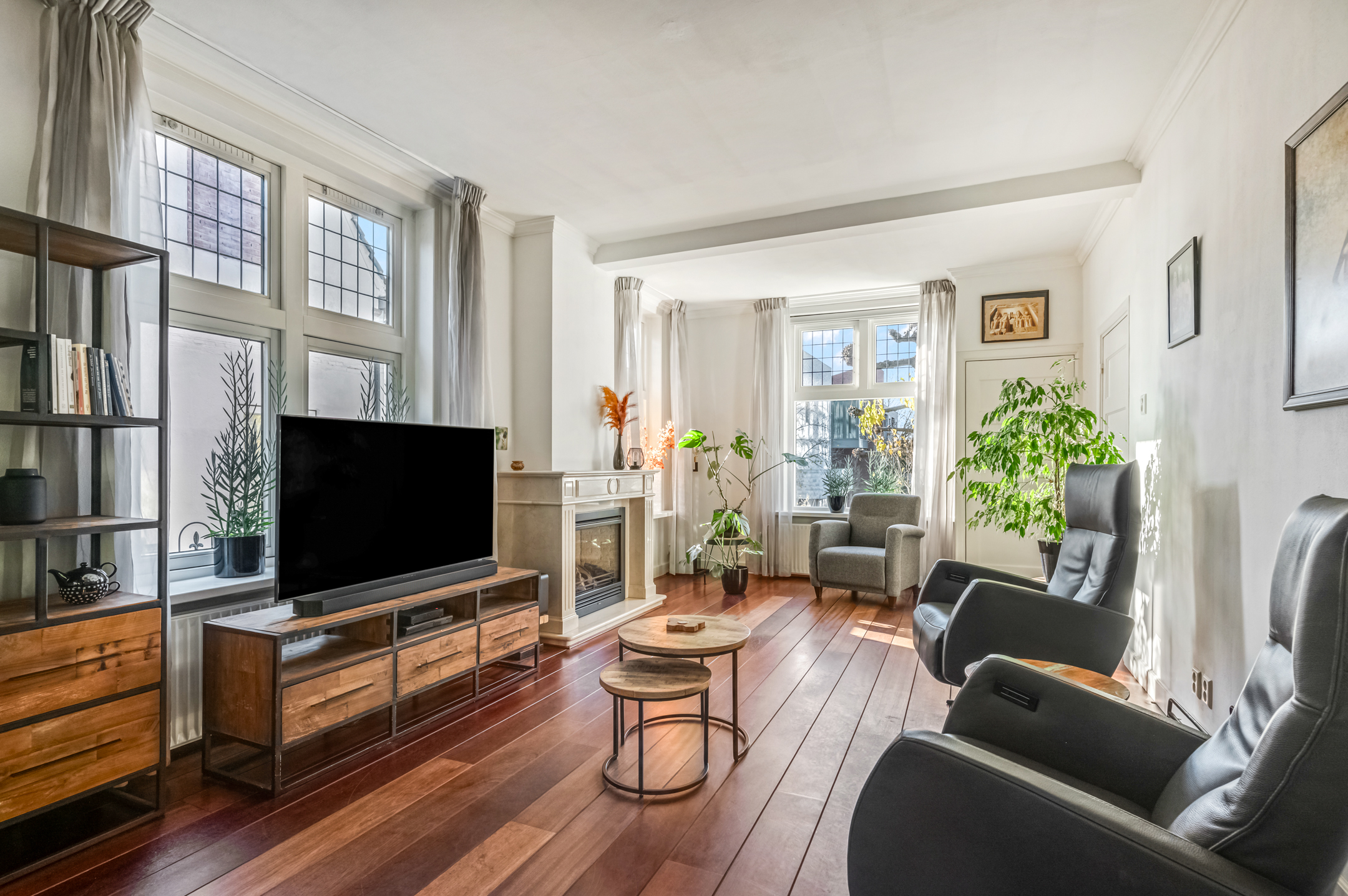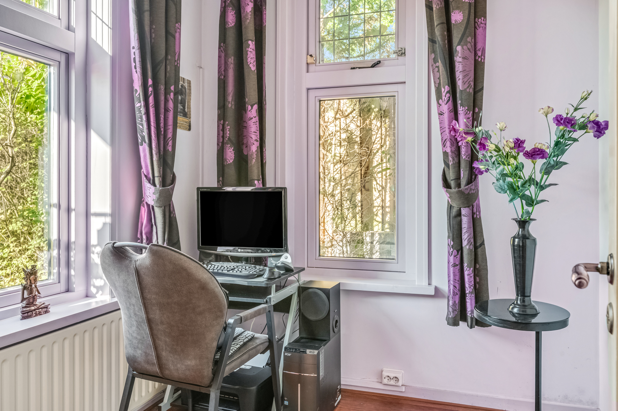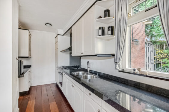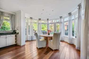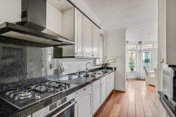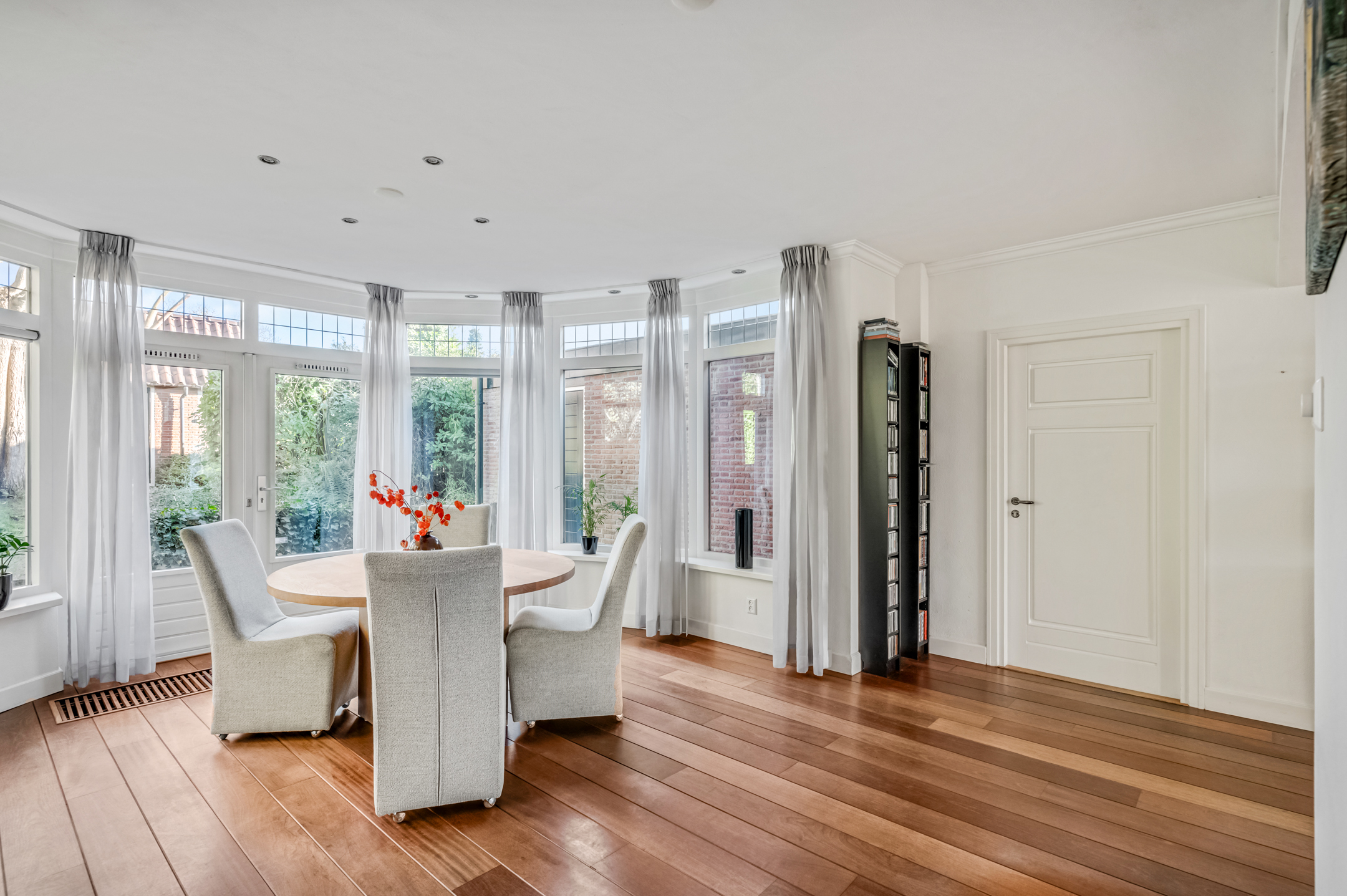 De woonkamer is een plaatje: glas-in-loodramen, een fraaie marmeren schouw met gashaard, een vaste kast én een stijlvolle aangebouwde halfronde erker/serre met openslaande deuren naar de achtertuin. Hier valt het licht heerlijk naar binnen. De halfopen keuken heeft een granieten werkblad en is voorzien van diverse inbouwapparatuur.
