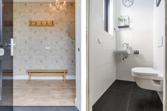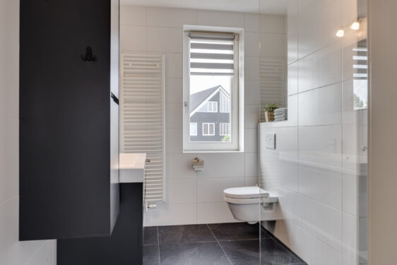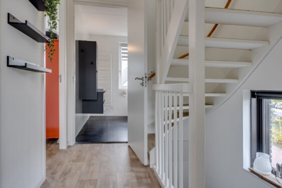 Aangrenzend aan de woonkamer bevindt zich de praktische bijkeuken met een vaste kastenwand, opstelling voor wasmachine en droger, én een deur naar de tuin. De gehele begane grond is voorzien van comfortabele vloerverwarming.