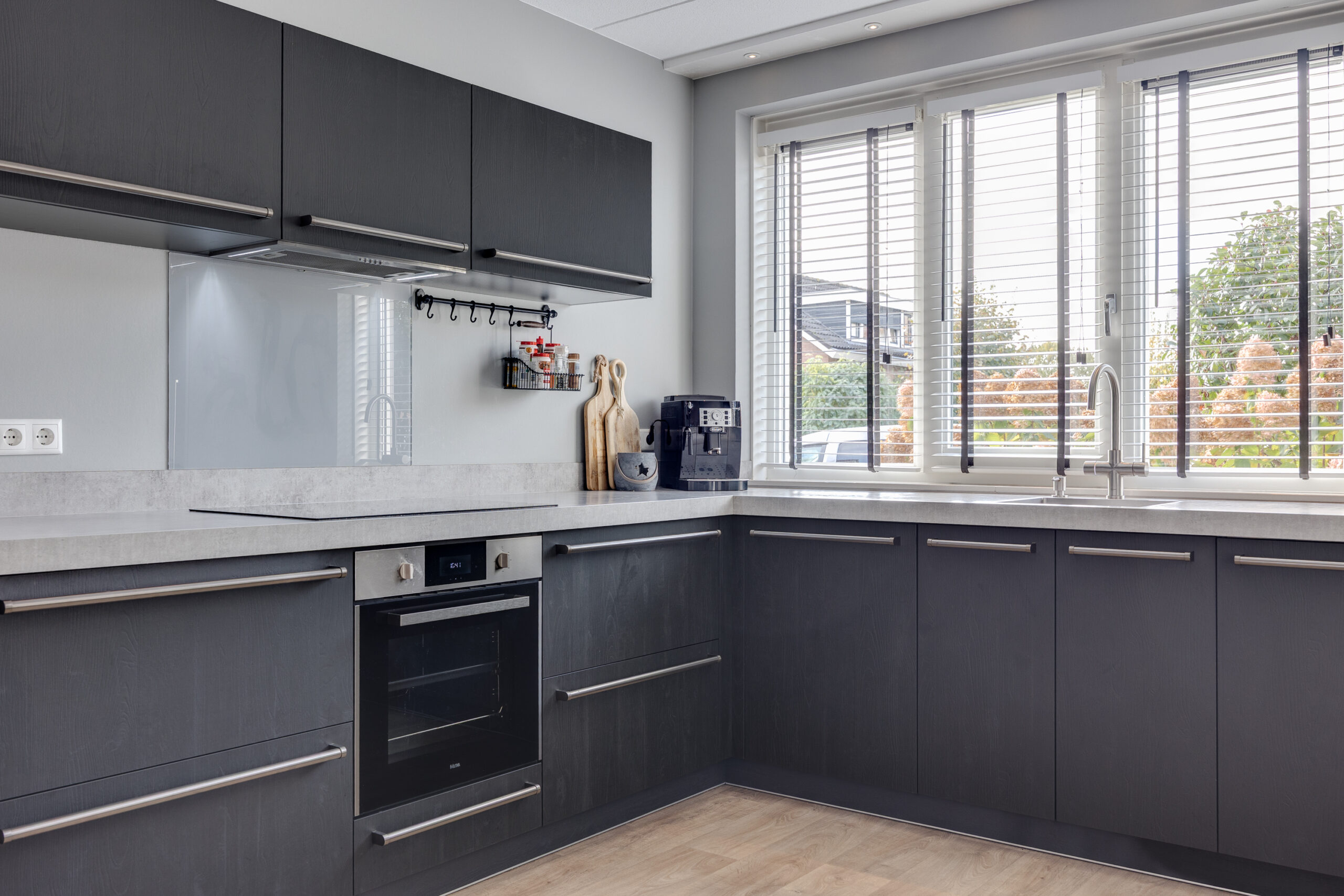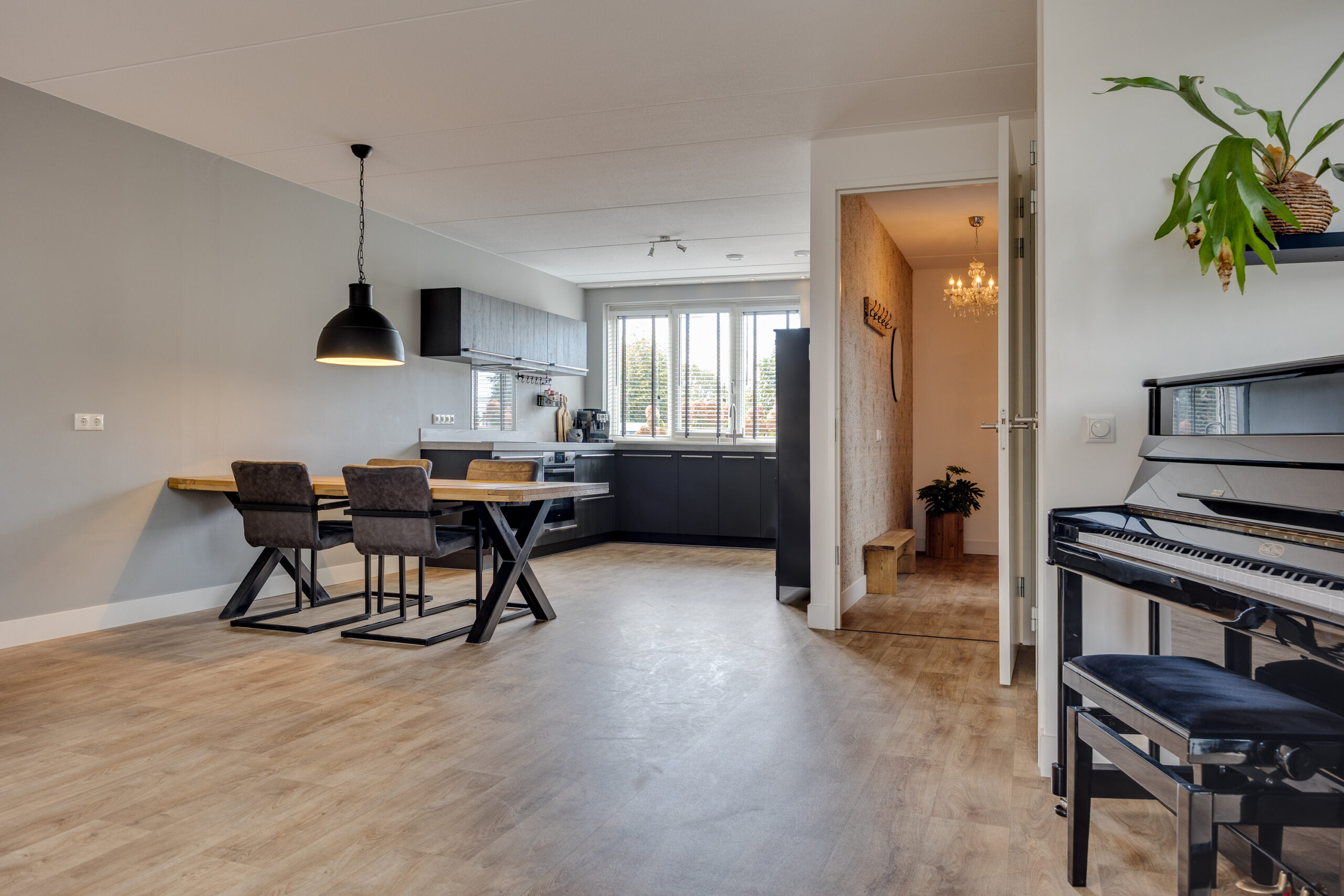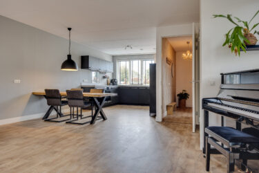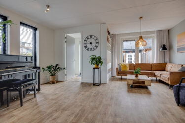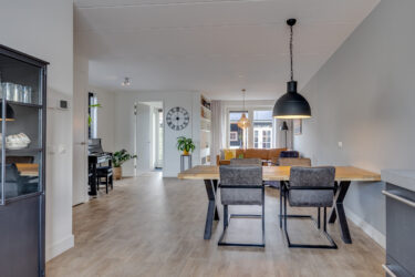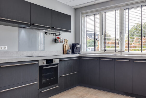Via de zijkant van de woning bereik je de voordeur. De ontvangsthal biedt toegang tot de meterkast, een moderne toiletruimte met wastafel en de trapopgang naar de eerste verdieping. De ruime, tuingerichte woonkamer is licht en sfeervol dankzij de dubbele tuindeuren en de fijne verbinding met buiten. De open keuken aan de voorzijde is uitgevoerd in een hoekopstelling en voorzien van alle gemakken: een inductiekookplaat, afzuigkap, heteluchtoven, Quooker, vaatwasser, koelkast en vriezer. De inbouwspots zorgen hier voor een strakke, eigentijdse uitstraling. Het keukenraam is voorzien van een screen tegen het zonlicht.