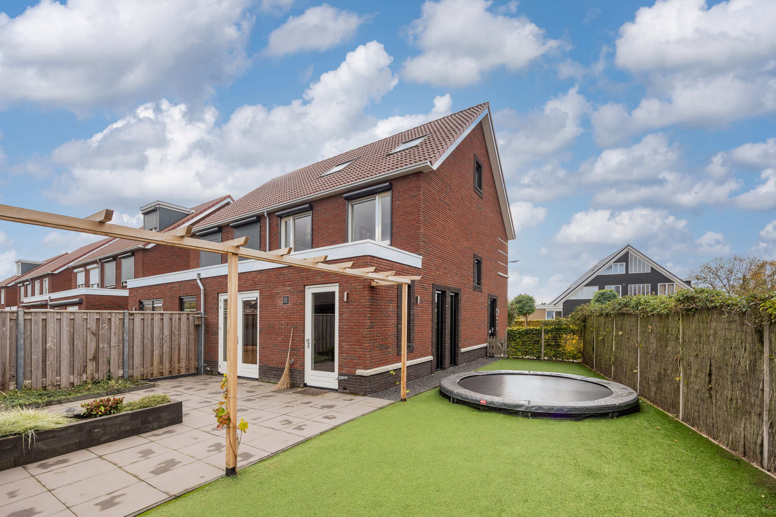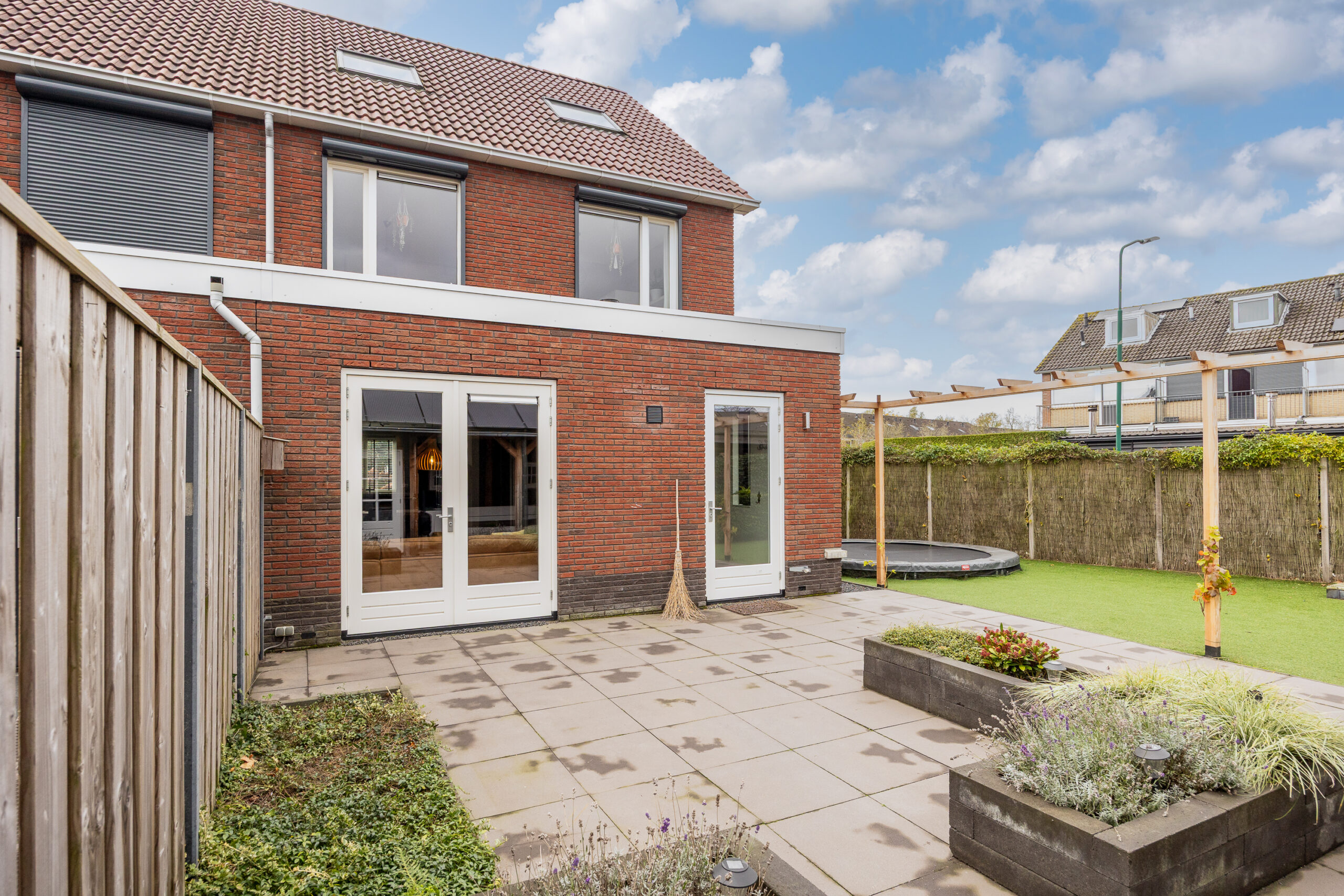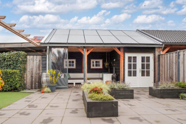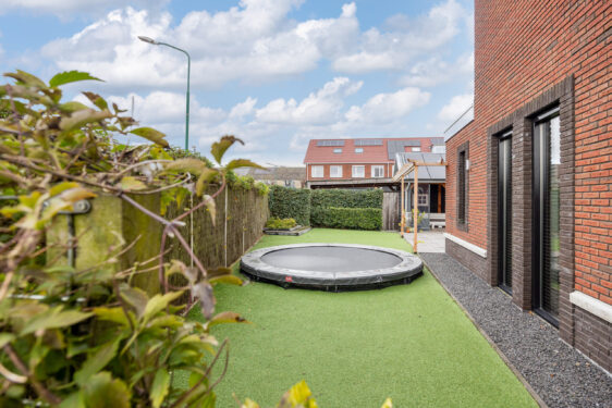 De achtertuin is verzorgd aangelegd met een terras en kunstgras, waardoor het onderhoud minimaal is. Achter in de tuin bevindt zich een ruime veranda die dankzij een afsluitbaar zeil het hele jaar door te gebruiken is. Vanuit de tuin heb je toegang tot de garage met elektra en bergzolder. Via de achtergelegen weg is de garage ook bereikbaar. Hier is tevens ruimte om twee auto’s op eigen terrein te parkeren. De voortuin is stijlvol ingericht met een combinatie van kunstgras en diverse beplanting, wat zorgt voor een verzorgde eerste indruk.