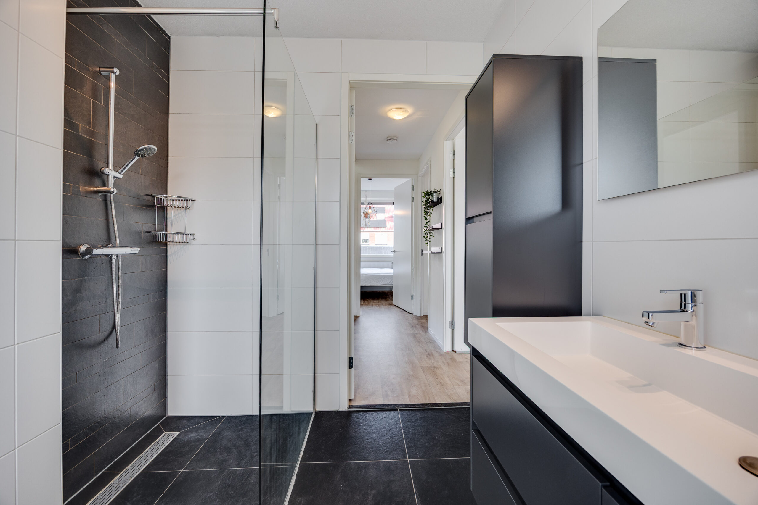 Vanaf de overloop zijn drie slaapkamers bereikbaar: twee aan de achterzijde en één aan de voorzijde. De grootste kamer aan de achterzijde beschikt over een fraaie vaste kastenwand en alle kamers zijn voorzien van rolluiken aan de buitenzijde. De moderne badkamer is stijlvol afgewerkt en uitgerust met een inloopdouche, dubbel wastafelmeubel, vaste kast, designradiator en een tweede toilet.
