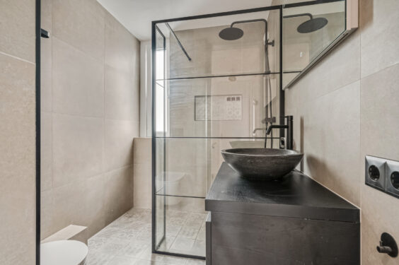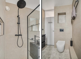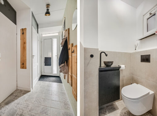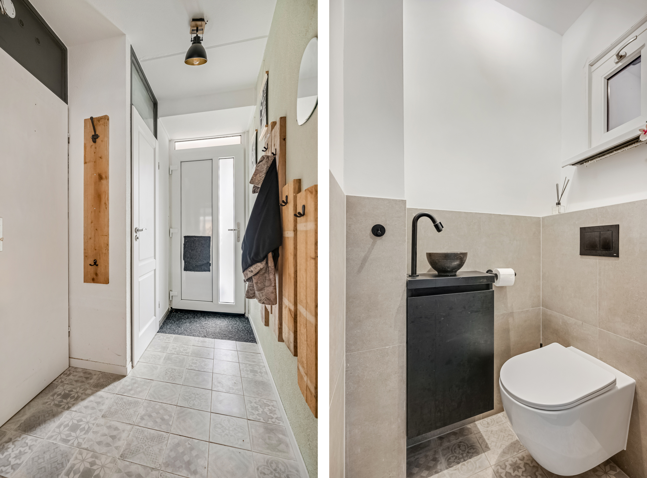 1e verdieping: De overloop geeft toegang tot drie slaapkamers. Twee kamers staan momenteel in open verbinding met elkaar via praktische houten schuifdeuren, maar kunnen eenvoudig weer worden gesplitst. De derde slaapkamer bevindt zich aan de voorzijde van de woning. De badkamer is modern uitgevoerd met grootformaat wandtegels, stijlvol vloertegelpatroon, een royale inloopdouche, 2e toilet en een badkamermeubel met natuurstenen waskom. Een heerlijke plek om de dag te beginnen (of te eindigen).