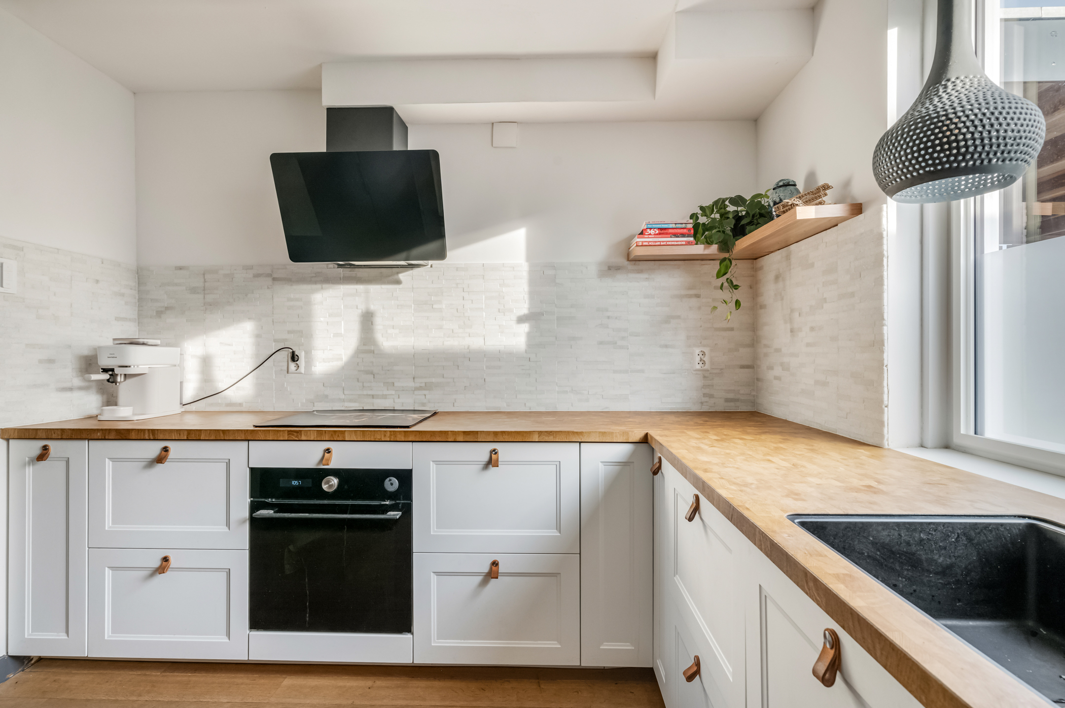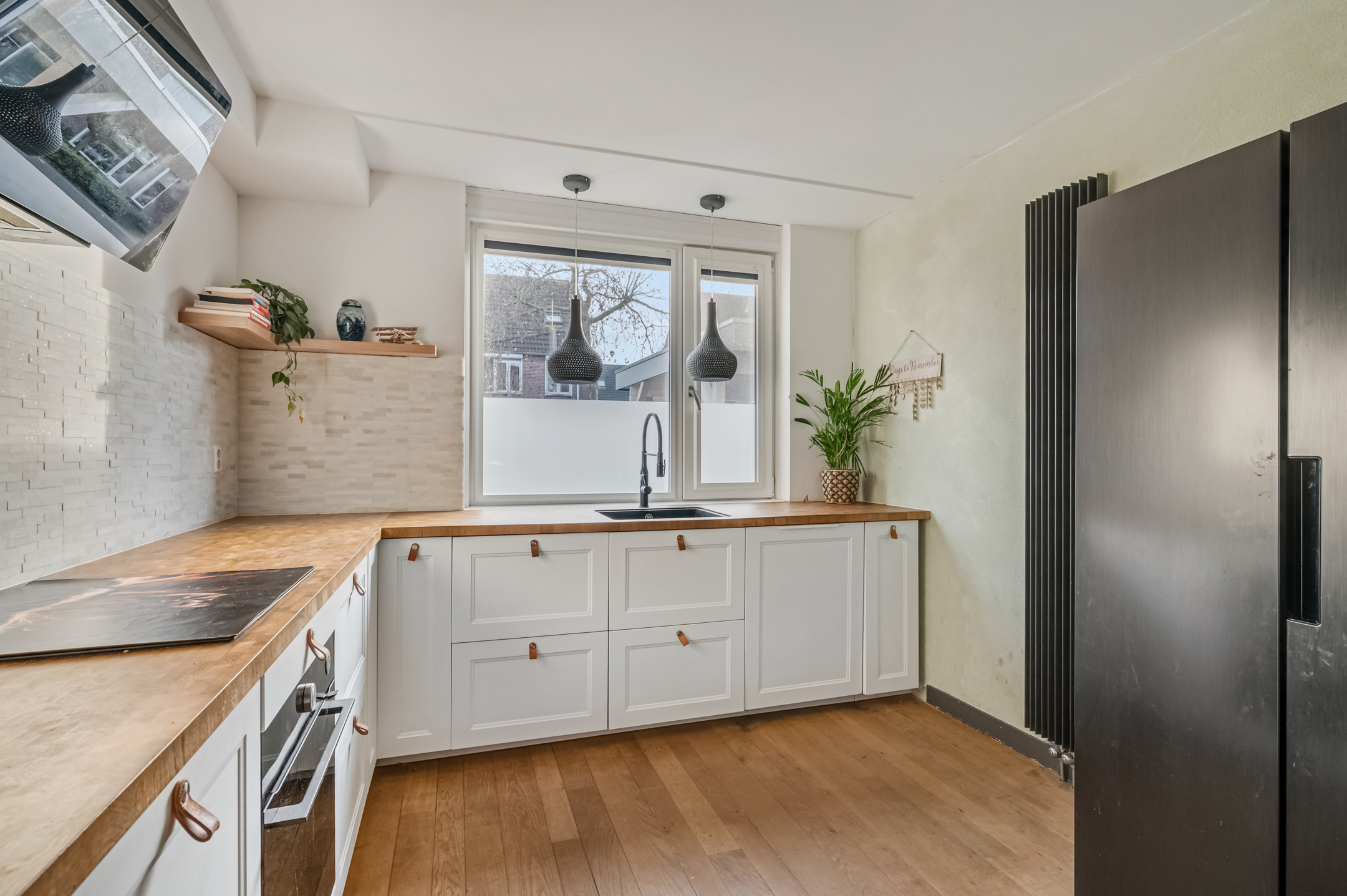 Begane grond: binnenkomst via de verzorgde hal met moderne toiletruimte (v.v. fonteintje), garderobehoek, meterkast en de trapopgang naar boven. De tuingerichte woonkamer is over de gehele breedte uitgebouwd en staat via een brede schuifpui fraai in verbinding met de tuin. De strakke afwerking in combinatie met de rustieke eiken vloer geven de ruimte een royale en sfeervolle uitstraling. Aan de straatzijde bevindt zich de moderne keuken met hoekopstelling. Strak vormgegeven, praktisch ingedeeld en compleet uitgerust met o.a. een inductiekookplaat met afzuigschouw, oven, vaatwasser, opberglades en een losse koel-vriescombinatie. Hier kook je met plezier terwijl je uitkijkt over het hofje.
