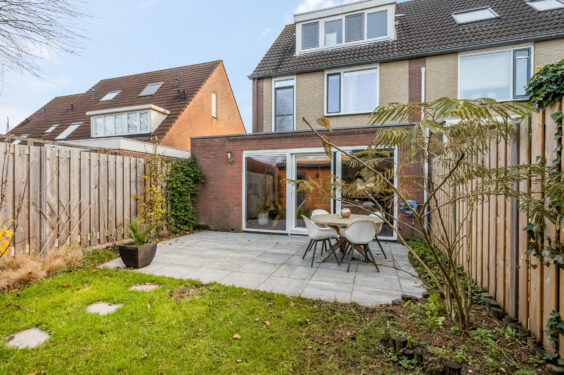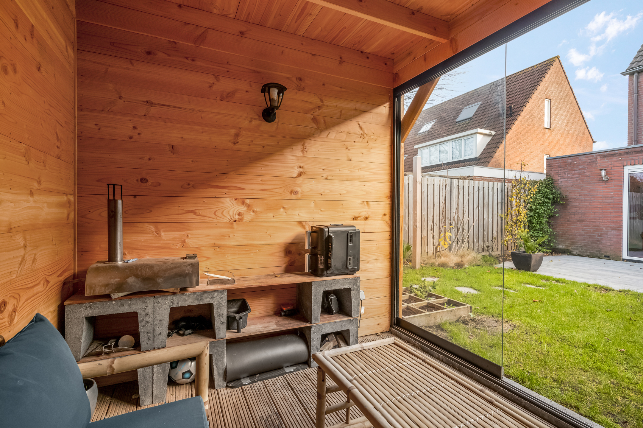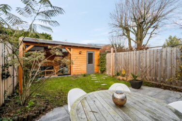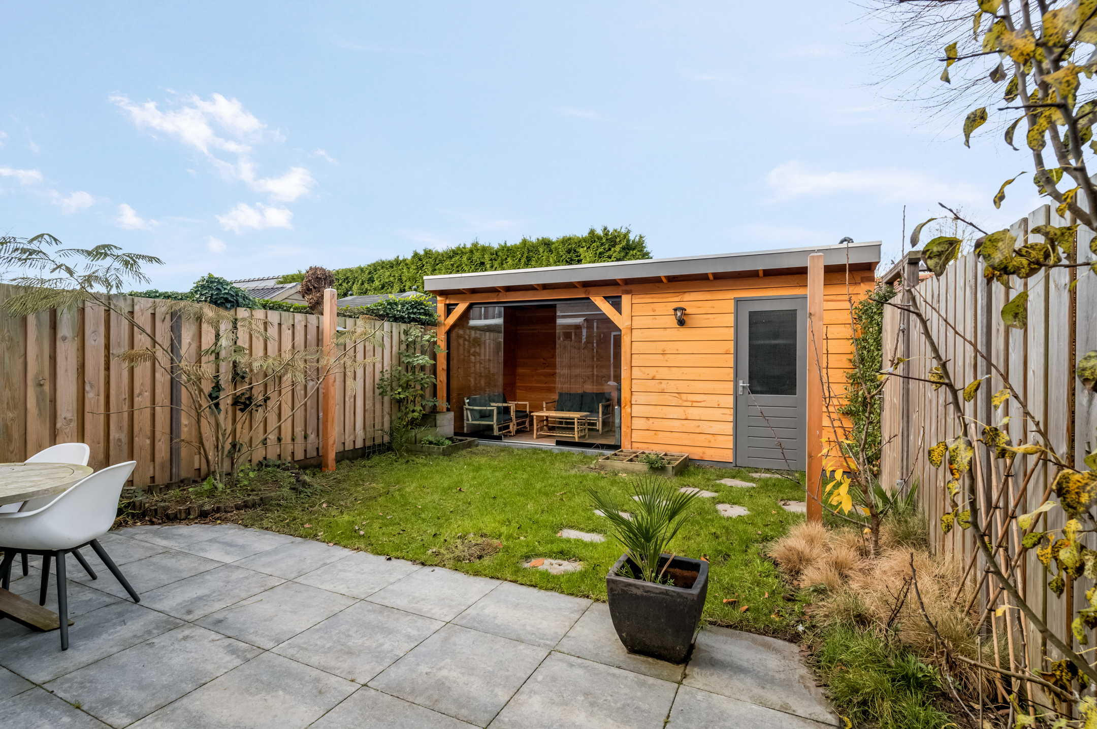 De achtertuin is een verrassende buitenruimte met een fijne mix van gazon, bestrating en sfeervolle borders. Achter in de tuin staat een recent (2025) geplaatste houten overkapping met inpandige berging, perfect voor lange zomeravonden of winterbarbecues. Via een afsluitbare poort in de verzorgde schutting heb je een directe achterom via het aanwezige zijpad.