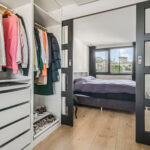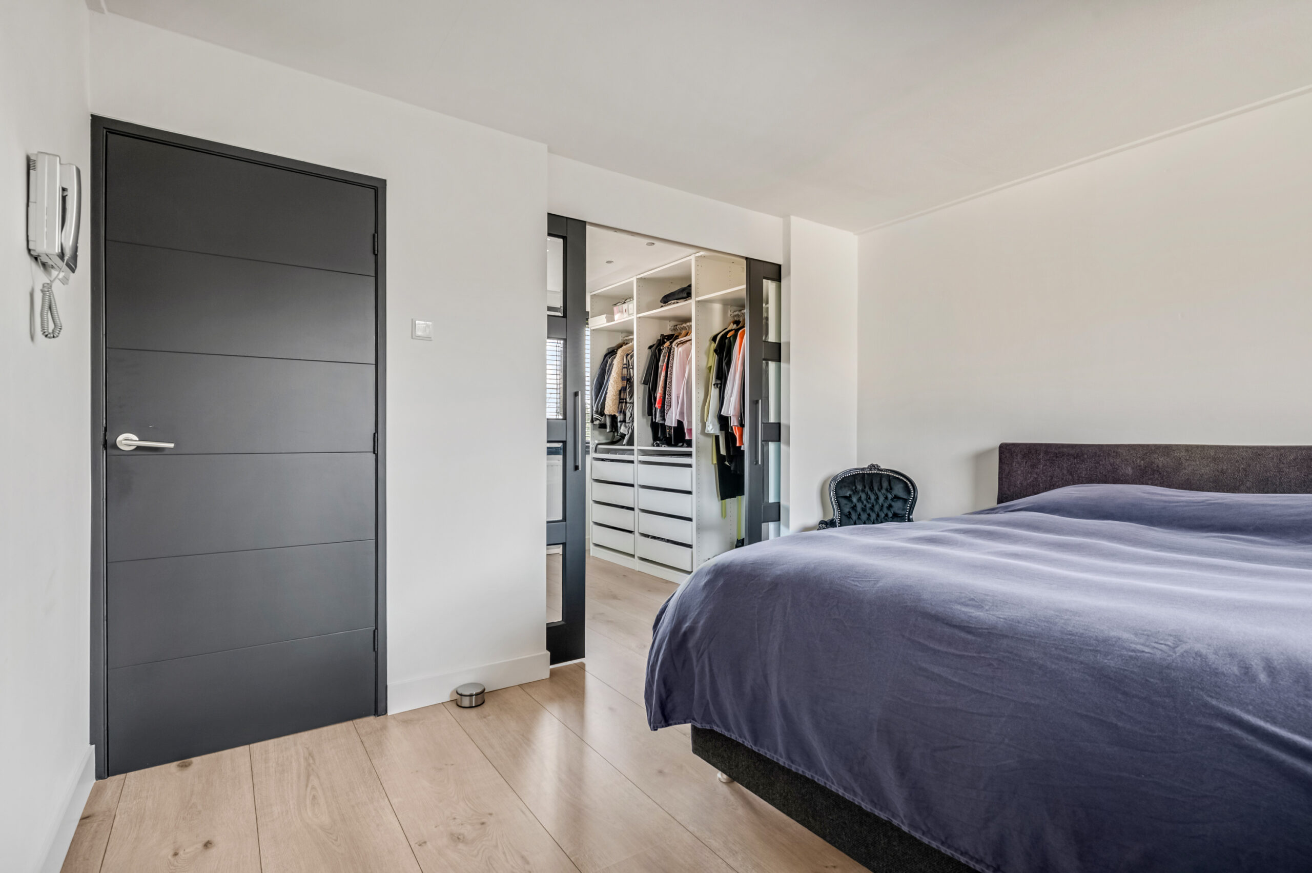 1e verdieping: overloop met trapopgang naar de 2e verdieping. De twee slaapkamers liggen aan de achterzijde van de woning waarvan de ruime ouderslaapkamer toegang geeft naar een walk-in-closet. De andere slaapkamer is momenteel in gebruik als werkkamer. De badkamer is geheel betegeld en heeft een dubbel wastafelmeubel met spiegel, bad/douchecombinatie met thermostaatkraan en toilet.