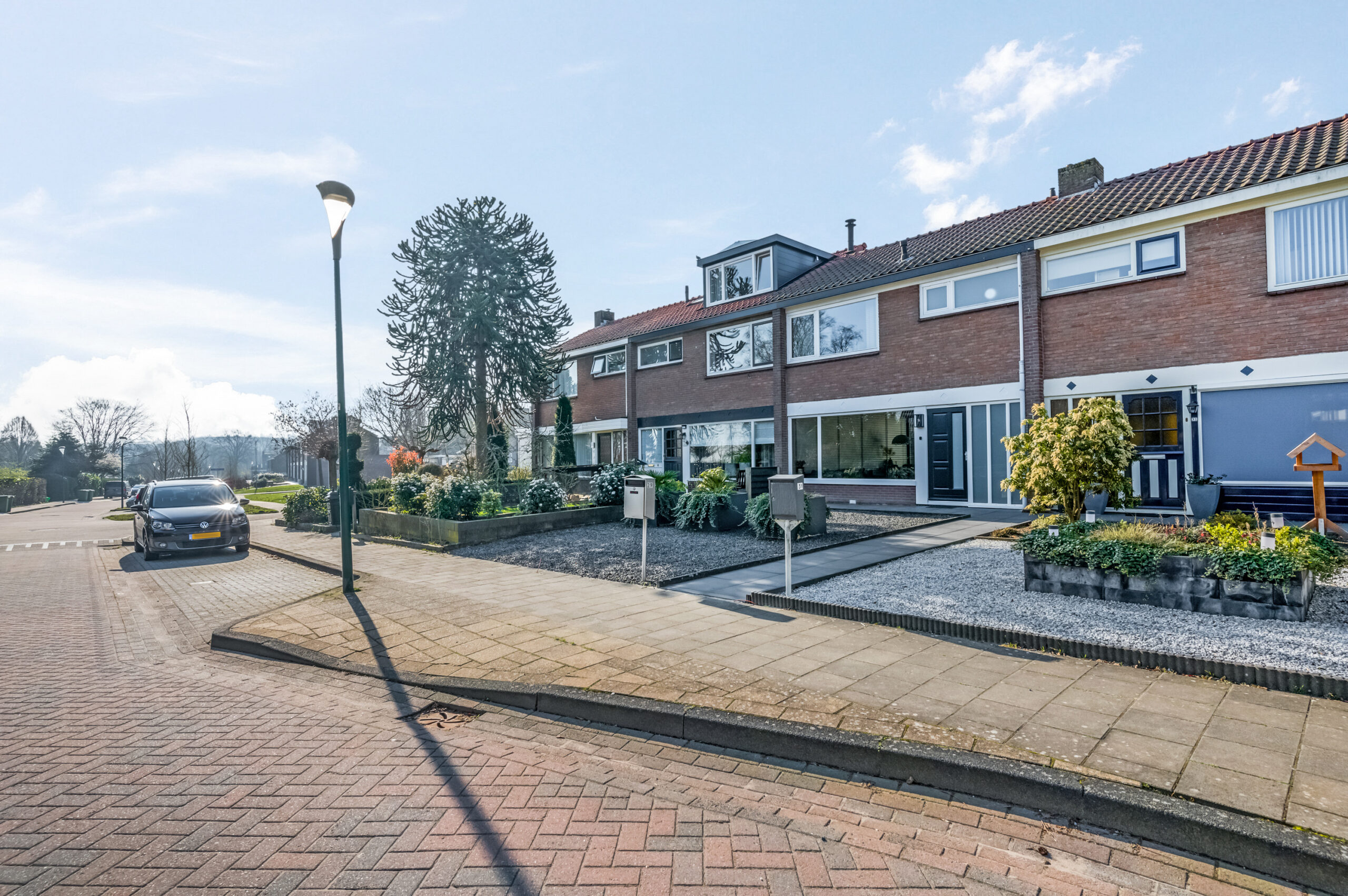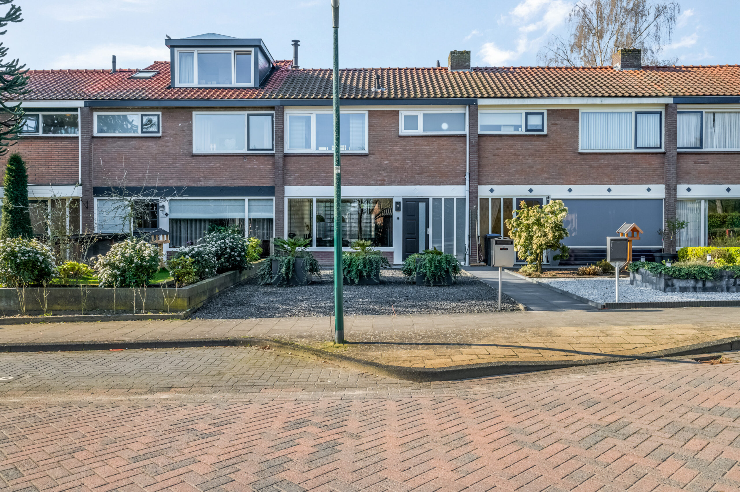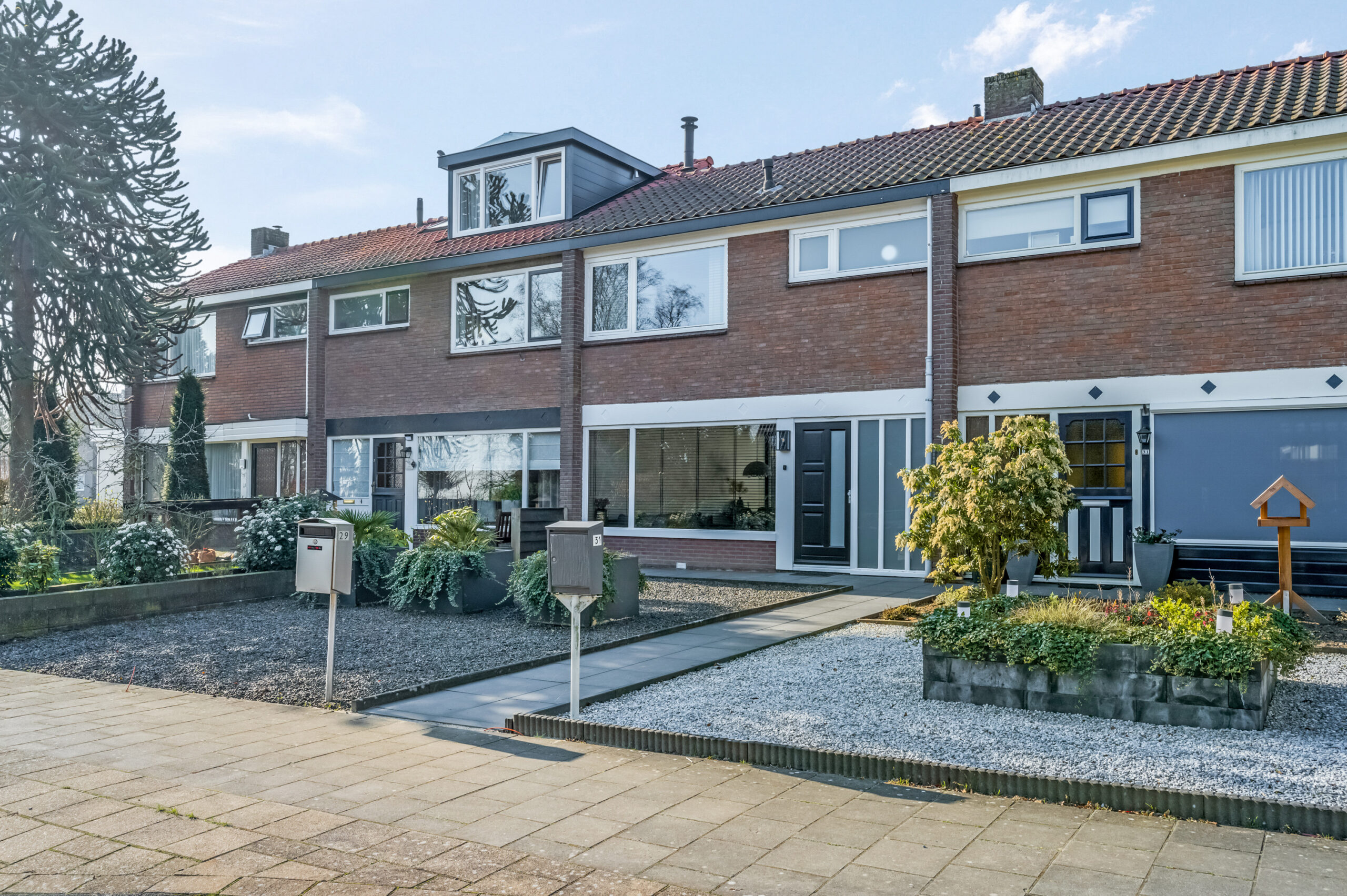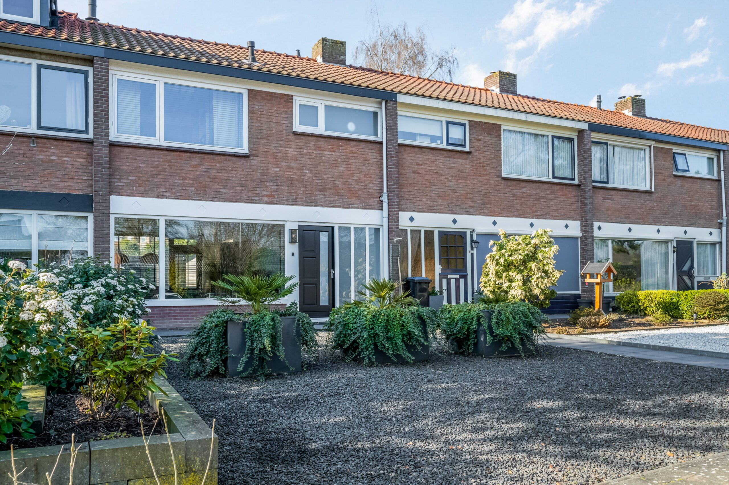 Buiten: de voortuin bestaat uit een tegelpad met siergrind en mooie plantenbakken.