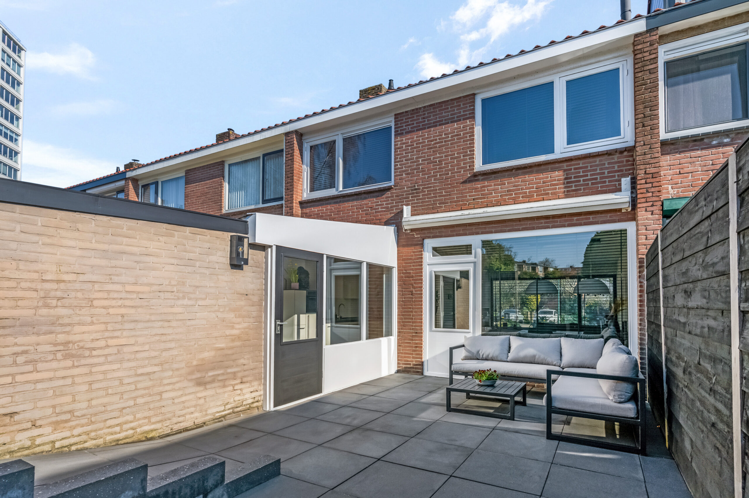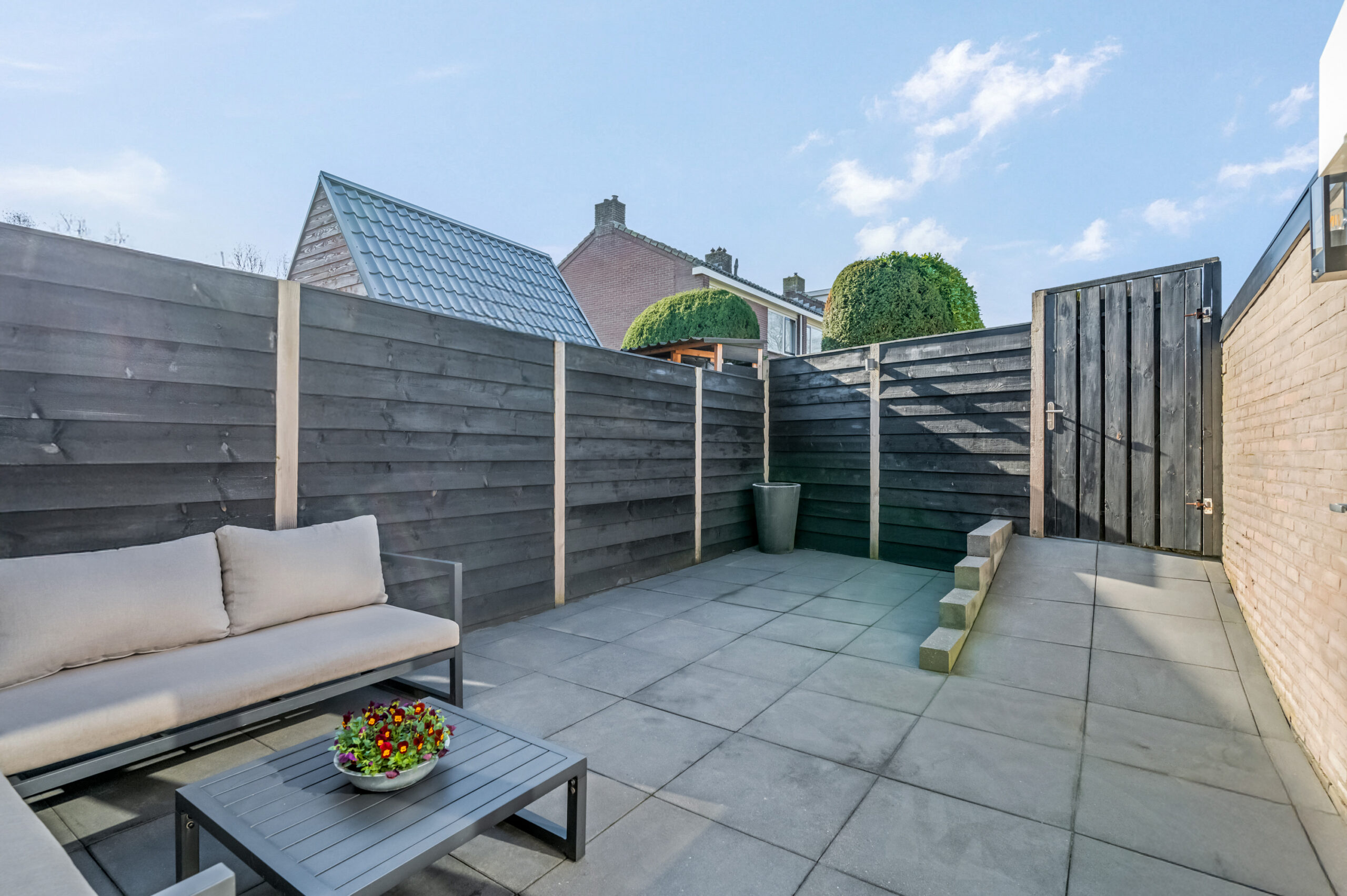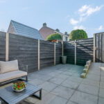 De onderhoudsvriendelijke achtertuin ligt op het zuiden en heeft een poort voor achterom.