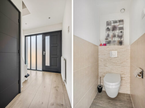 1e verdieping: overloop met trapopgang naar de 2e verdieping. De twee slaapkamers liggen aan de achterzijde van de woning waarvan de ruime ouderslaapkamer toegang geeft naar een walk-in-closet. De andere slaapkamer is momenteel in gebruik als werkkamer. De badkamer is geheel betegeld en heeft een dubbel wastafelmeubel met spiegel, bad/douchecombinatie met thermostaatkraan en toilet.