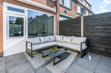 De onderhoudsvriendelijke achtertuin ligt op het zuiden en heeft een poort voor achterom.