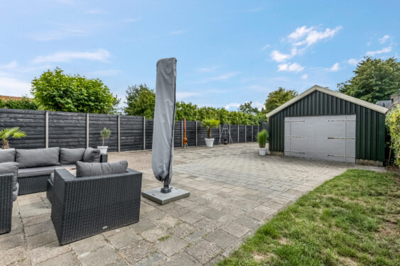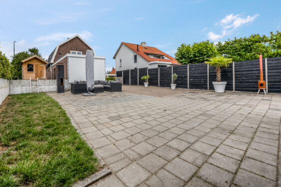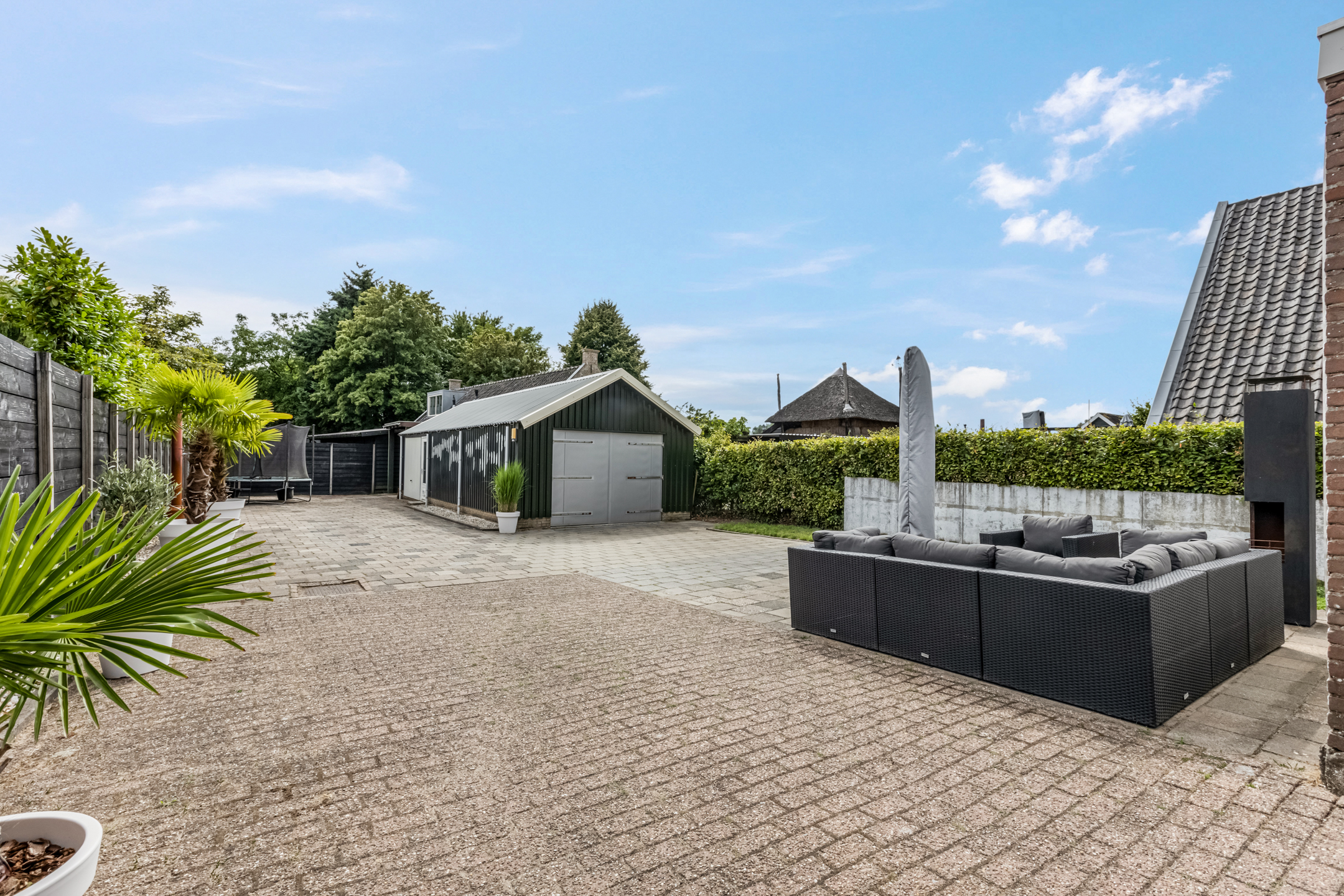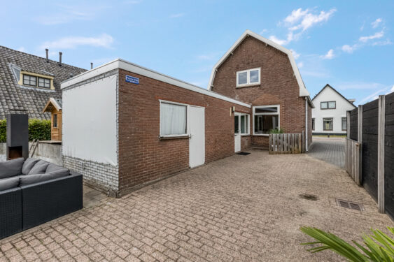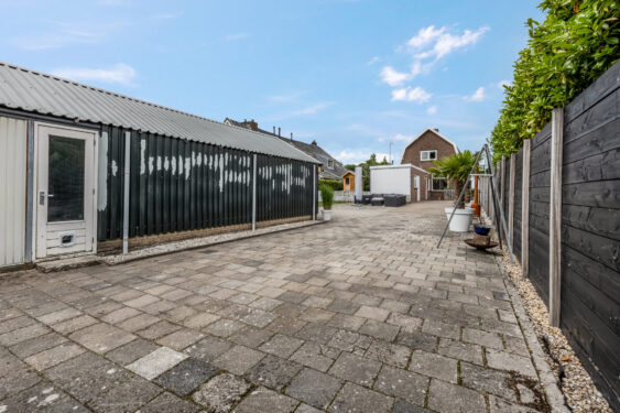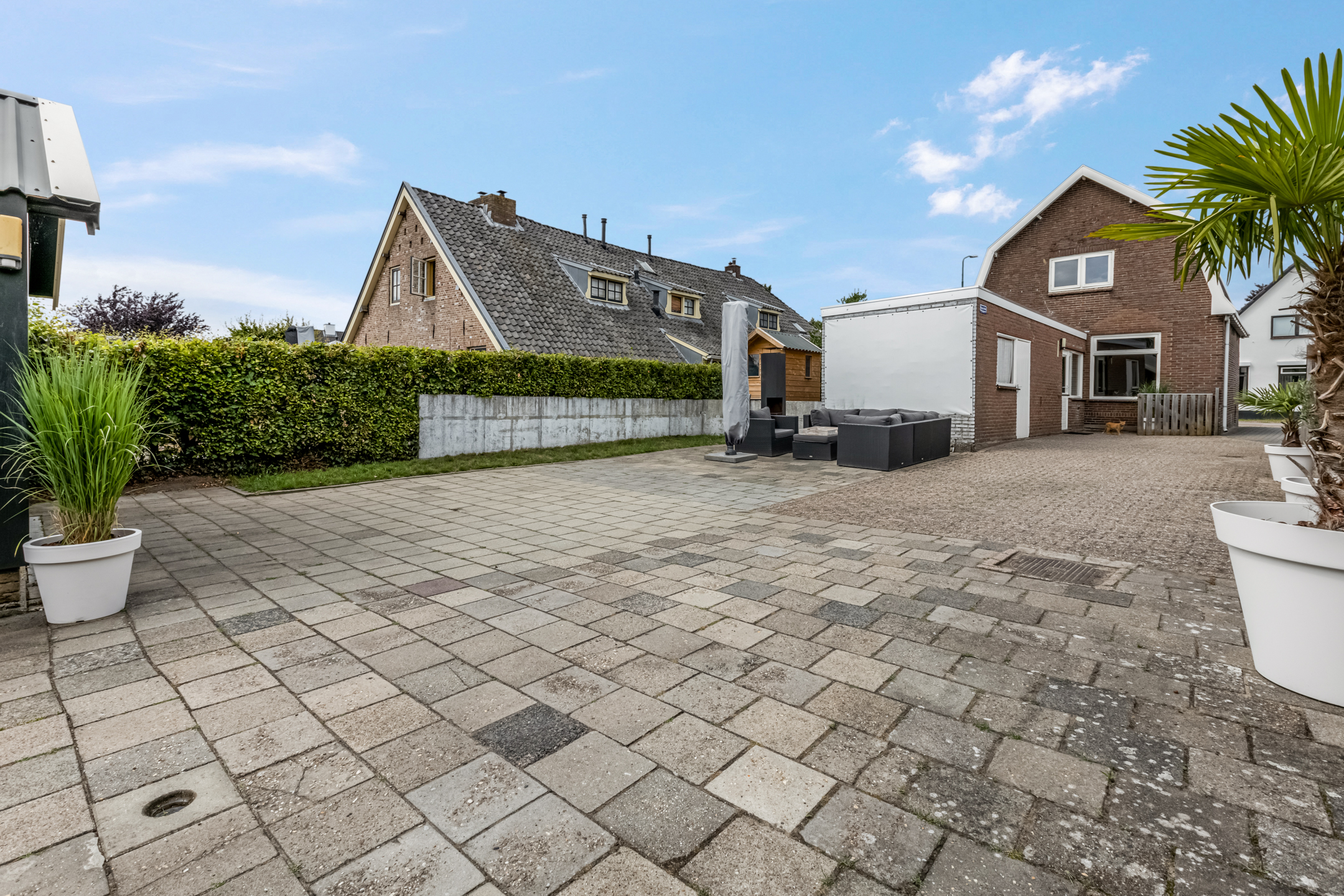 De woning beschikt over een royale oprit naar het volledig bestraatte buitenterrein met ruime parkeergelegenheid. Aan de zijkant bevindt zich een terras met groene borders, een zijtuin en een aangebouwde stenen berging.