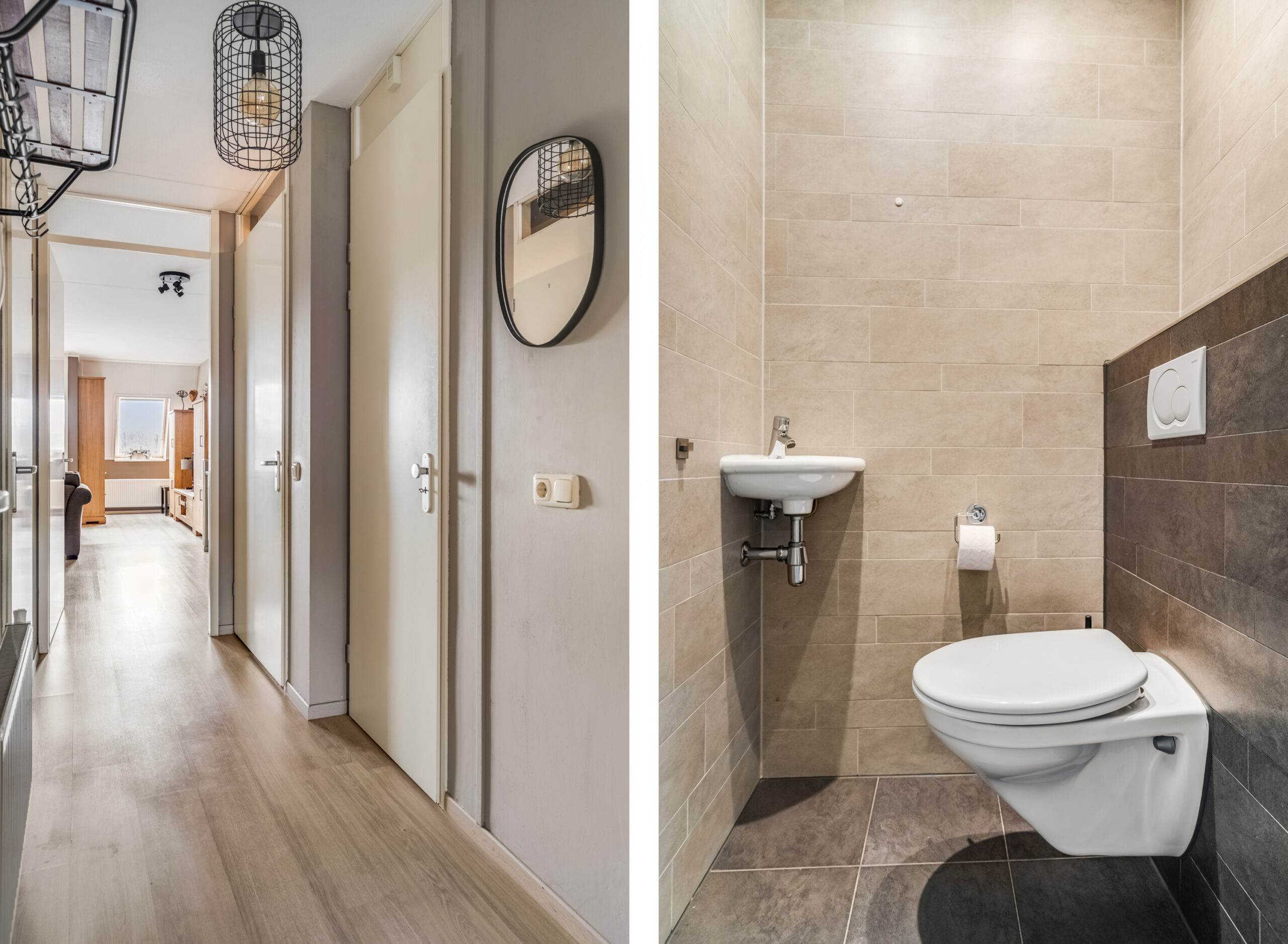 Tot slot vind je in de hal de meterkast en een moderne toiletruimte met fonteintje.