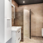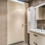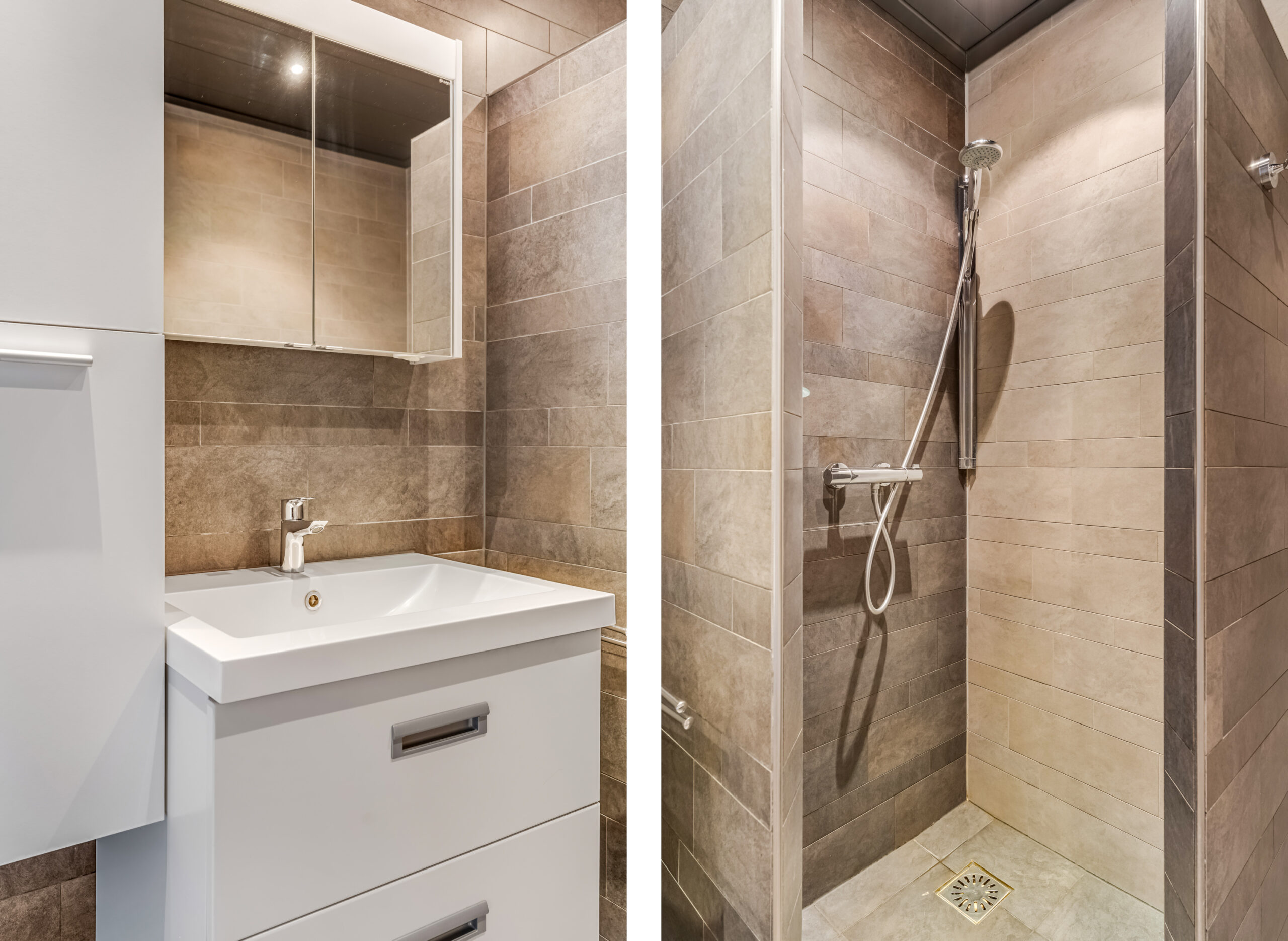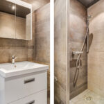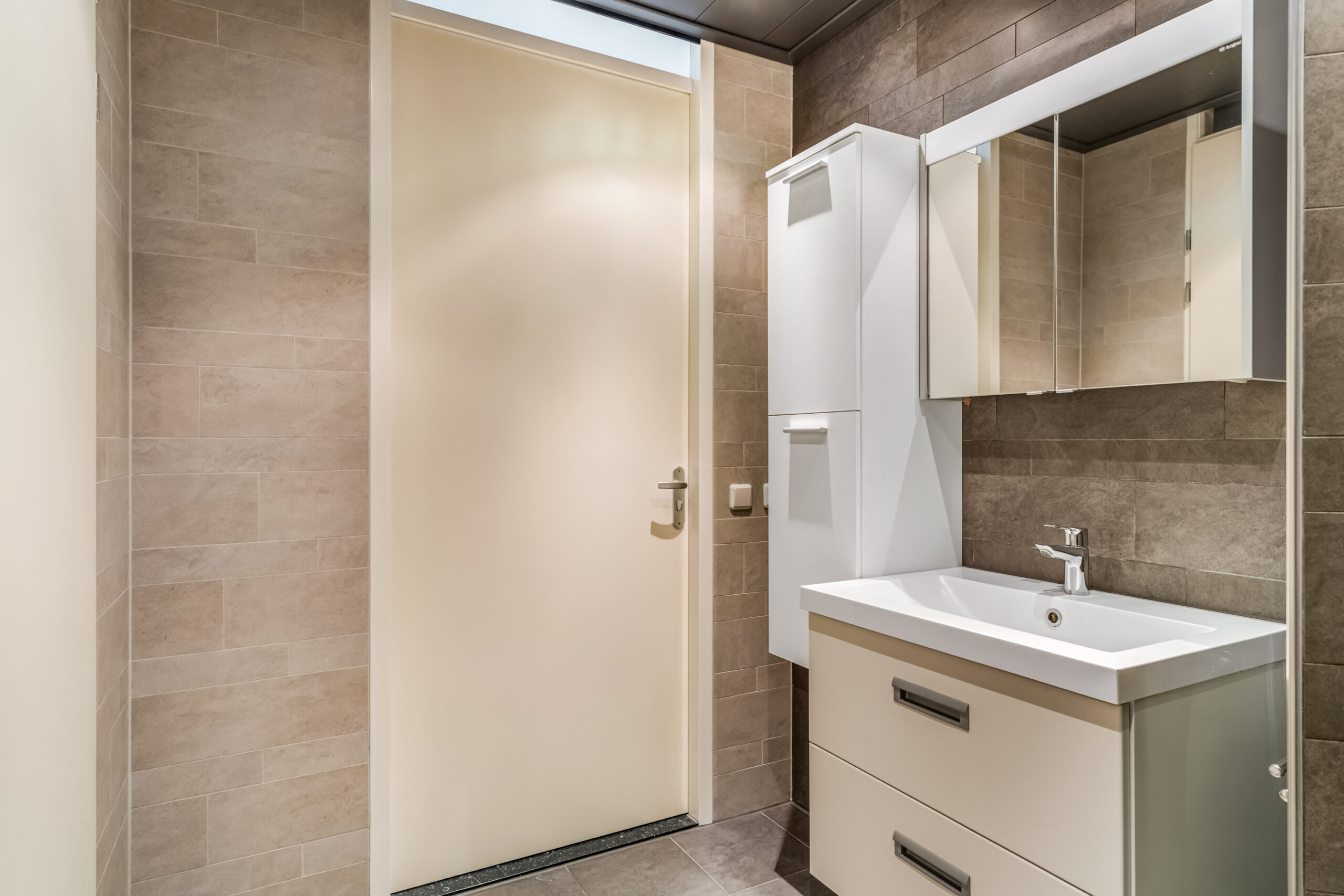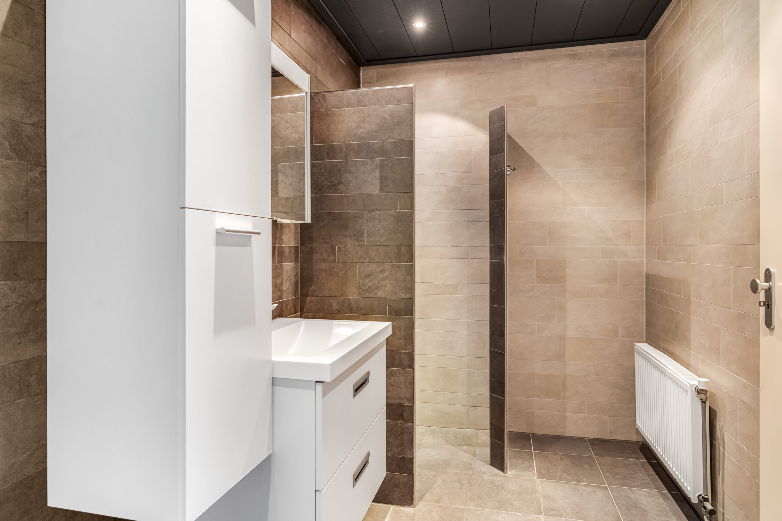 De badkamer is geheel betegeld en modern uitgevoerd met een inloopdouche, wastafelmeubel, hangmeubel en radiator. Vanuit de badkamer is de praktische wasruimte bereikbaar, waar zich de cv-opstelling (Remeha, 2023), mechanische ventilatie en aansluitingen voor wasmachine en droger bevinden.