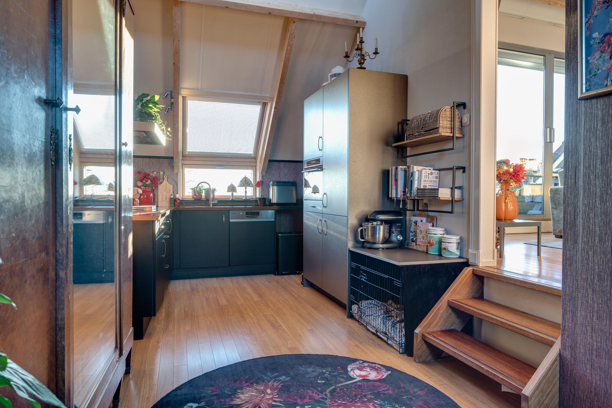 Ontvangsthal met trap naar de onderste woonlaag, garderobe, toiletruimte, meterkast en toegangsdeur naar de ruime garage (met mogelijkheid voor een extra slaapkamer). Enkele treden brengen je van de hal naar de uiterst sfeervolle living. Onmiddellijk valt je oog op het magnifieke uitzicht over de Rijn en mooie Uiterwaarden die zichtbaar zijn door de brede schuifpui die de woonkamer scheidt van het kamerbrede balkon. Het hoge plafond, de speelse raampartijen en aanwezige vide dragen bij aan de heerlijke sfeer. Een leuk detail is de ruime werkplek die in verbinding staat met de living maar waar ongestoord kan worden gewerkt of gestudeerd. Vanuit de woonkamer is er toegang tot de woonkeuken die is voorzien van een hoekopstelling met houten werkblad, 4-pits inductiekookplaat met afzuigkap en vaatwasser. In de separate apparatenkast zijn de oven (met magnetronfunctie), koelkast en vriezer met 3 lades verwerkt.