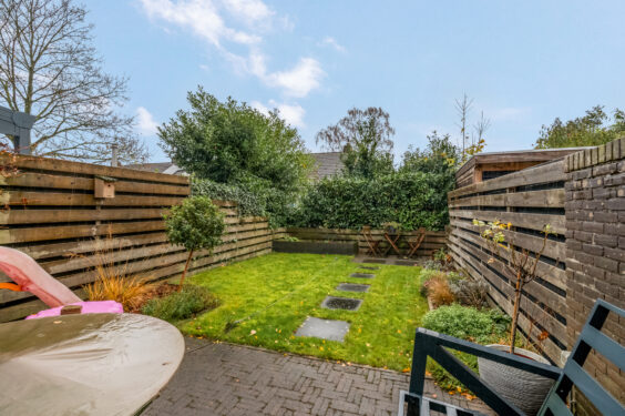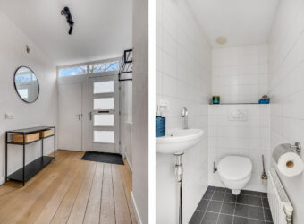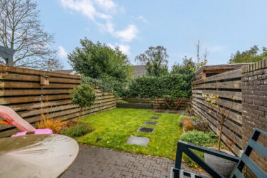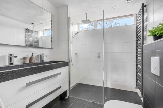 1e verdieping: Hier bevinden zich drie zeer ruime slaapkamers, waarvan één aan de straatzijde en twee aan de tuinzijde. Eén van de kamers is daarbij voorzien van een vaste kast. De moderne badkamer is smaakvol afgewerkt met een breed wastafelmeubel met dubbele wastafel, toilet, inloopdouche met stortdouche, designradiator en inbouwspots in het plafond.