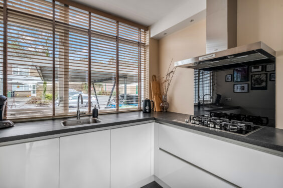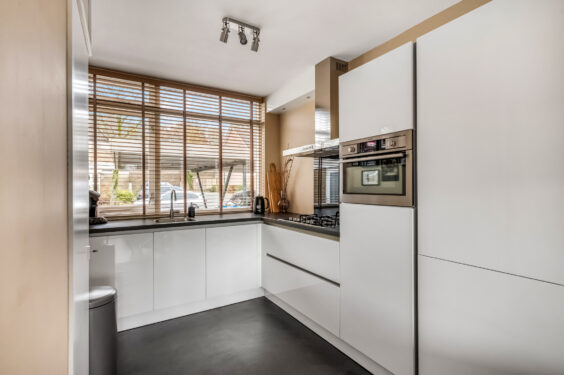 Begane grond: Via de ruime entree kom je binnen in een lichte hal met garderoberuimte, meterkast, toiletruimte met fonteintje en de trapopgang naar boven. Vanuit hier stap je ook de woonkamer binnen: een fijne leefruimte met parketvloer, grote schuifpui naar de tuin en een convectorput voor extra comfort. Tevens is er een praktische trapkast aanwezig. Aan de voorzijde bevindt zich de moderne open keuken met hoekopstelling. Deze is uitgerust met diverse inbouwapparatuur, zoals een koel-vriescombinatie, vaatwasser, 5-pits gasfornuis met afzuigschouw, combi-oven, koelkast én een extra provisiekast. Ideaal voor de enthousiaste hobby kok.