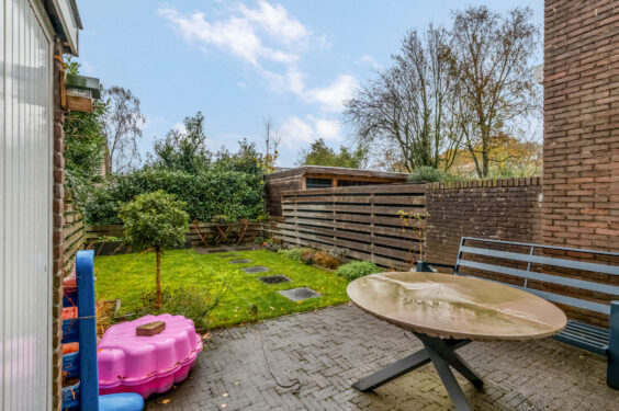 Buiten: Aan de straatzijde bevindt zich een ruime parkeerplaats onder de carport en toegang tot de stenen berging met elektra. De onderhoudsvriendelijke achtertuin is gesitueerd op het westen en is voorzien van een gezellig zitje, gazon en borders. Aan de achtergevel van de woning bevindt zich een handige bergkast voor tuingereedschap. De buitenzonwering aan de achtergevel zorgt voor verkoeling op warme dagen.