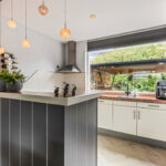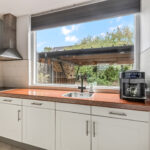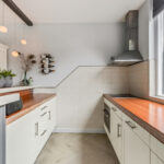 De halfopen keuken ligt aan de voorzijde van de woning met keuken in wandopstelling geplaatst. De keuken heeft een houten werkblad en inbouwapparatuur zoals een 4-pits keramische kookplaat met rvs-afzuigkap, combimagnetron en vaatwasser.