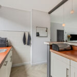 Tegenover de wandopstelling is een 2e keukenblok met houten werkblad, afgesloten middels een halfhoge wand van het eetgedeelte en voorzien van een koelkast, vriezer (3 lades) en extra opbergruimte.