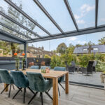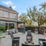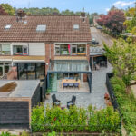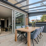 De achterzijde van de woning heeft een sfeervolle serre met glazen schuifpui naar het heerlijke zonnige terras.