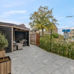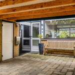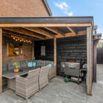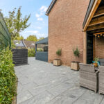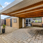 Aan de zijkant van de woning is nog eens een overkapping met terras en afsluitbare poort voor achterom.