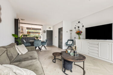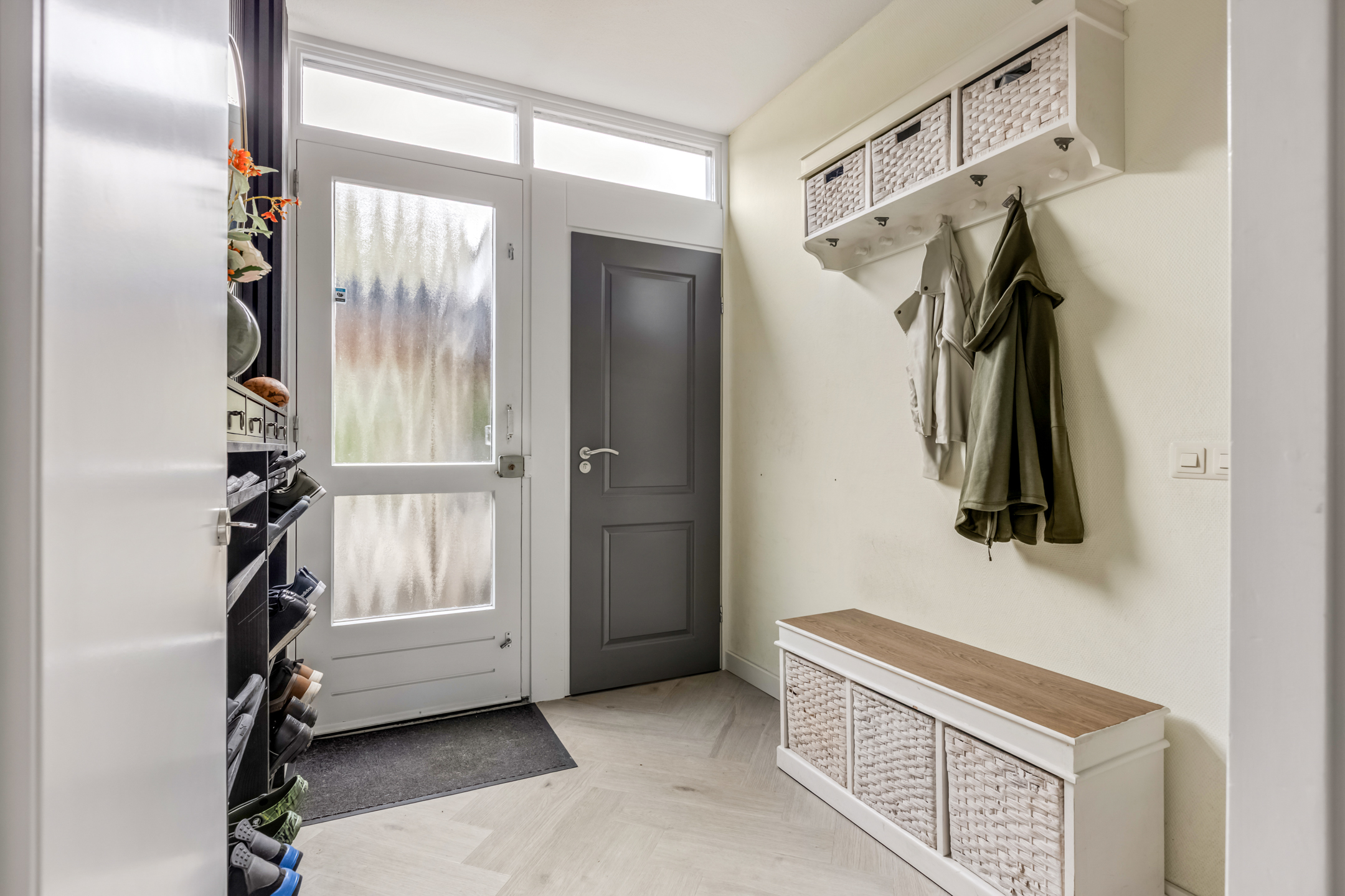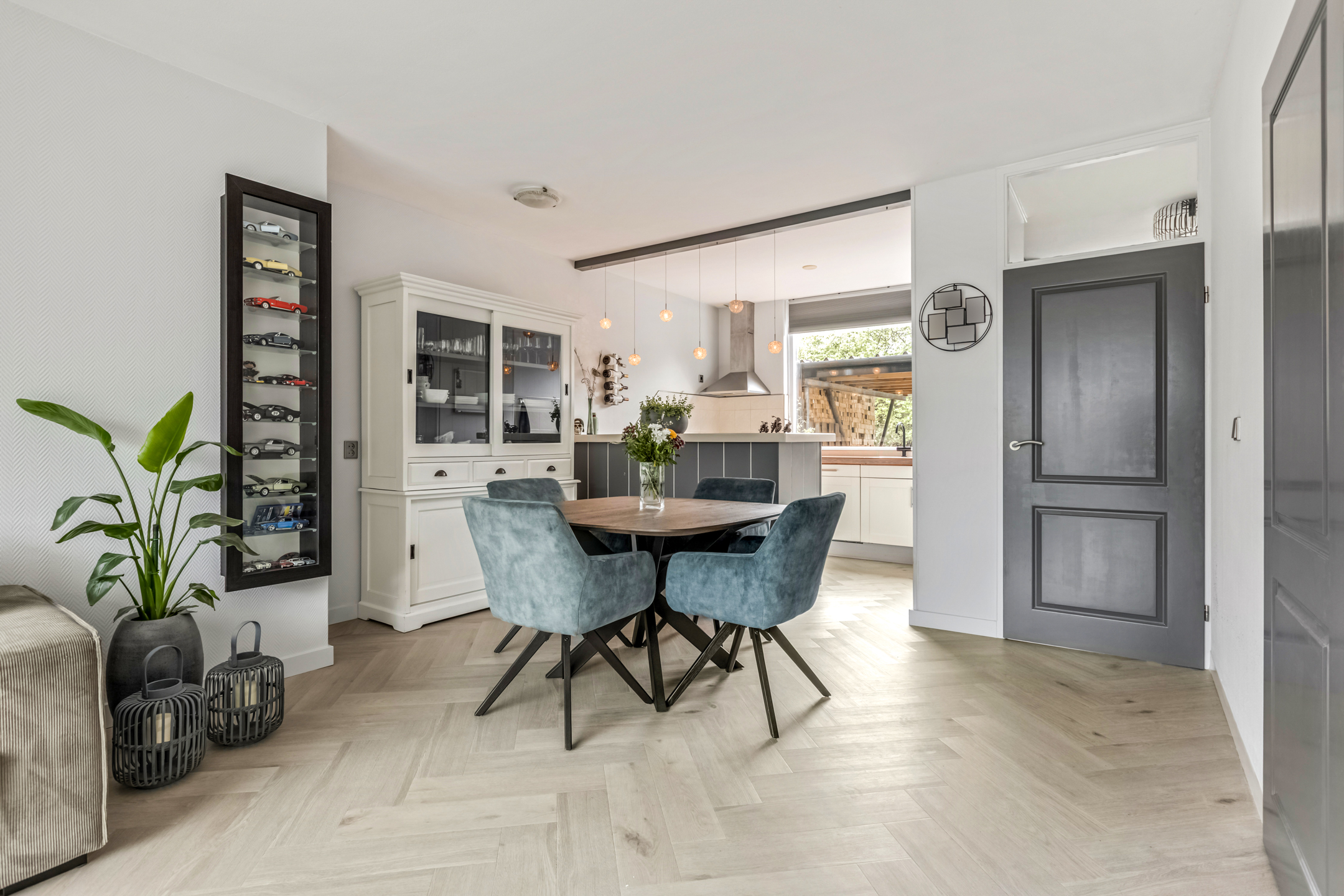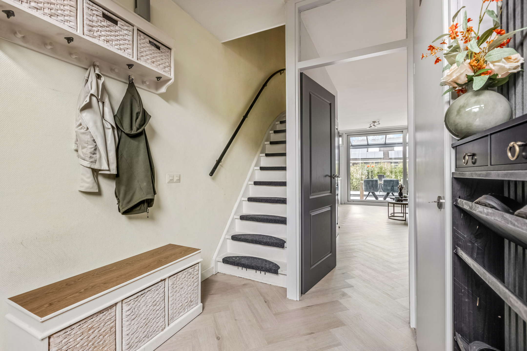 Ontvangsthal met trapopgang naar de 1e verdieping, moderne toiletruimte en meterkast. De sfeervolle tuingerichte woonkamer heeft een schuifpui naar een heerlijk overkapte serre met glazen deuren naar de tuin.