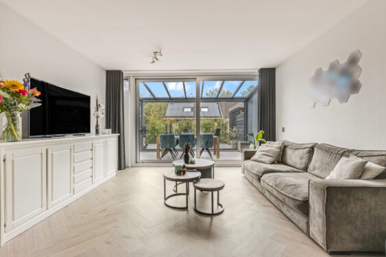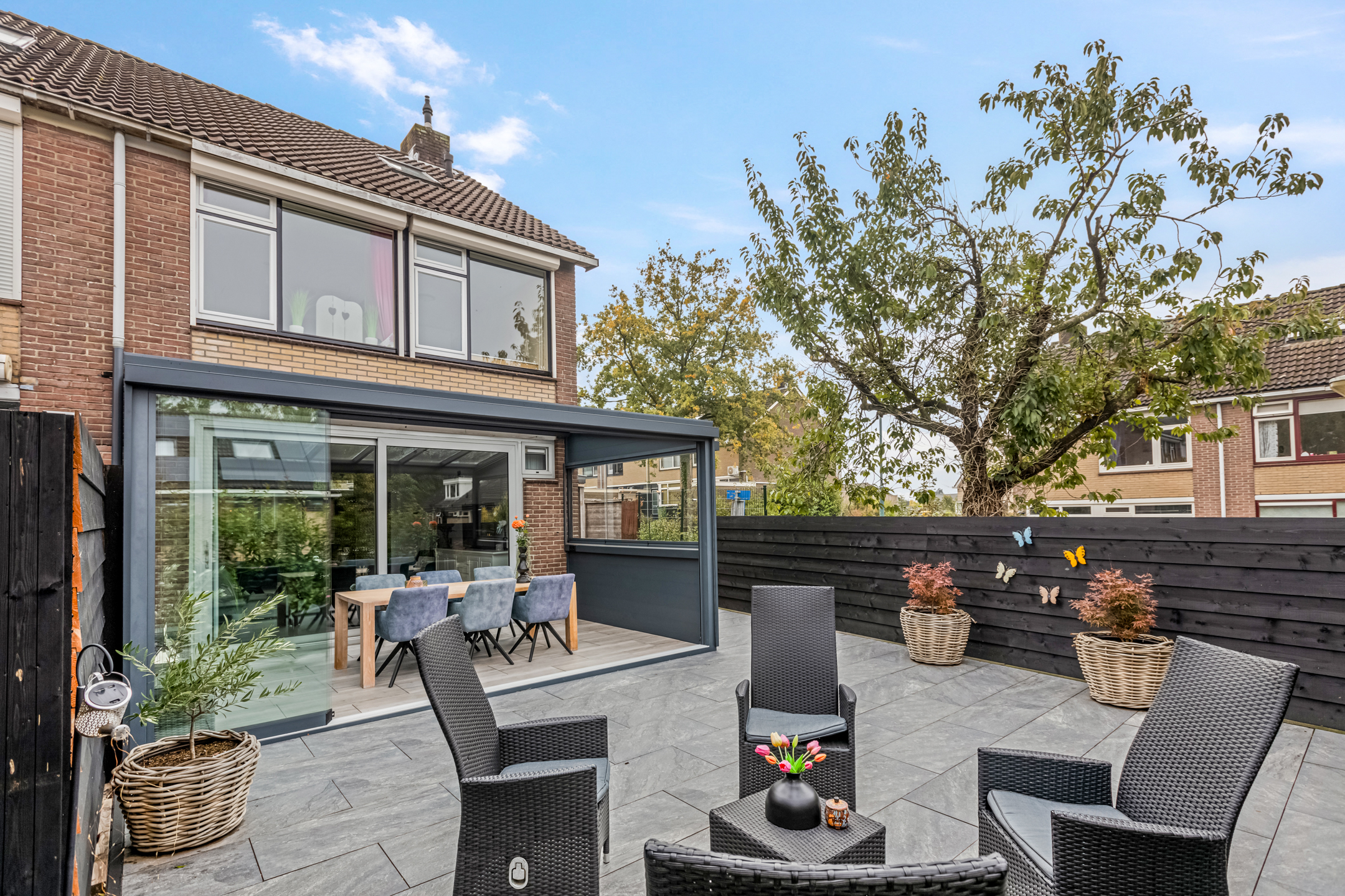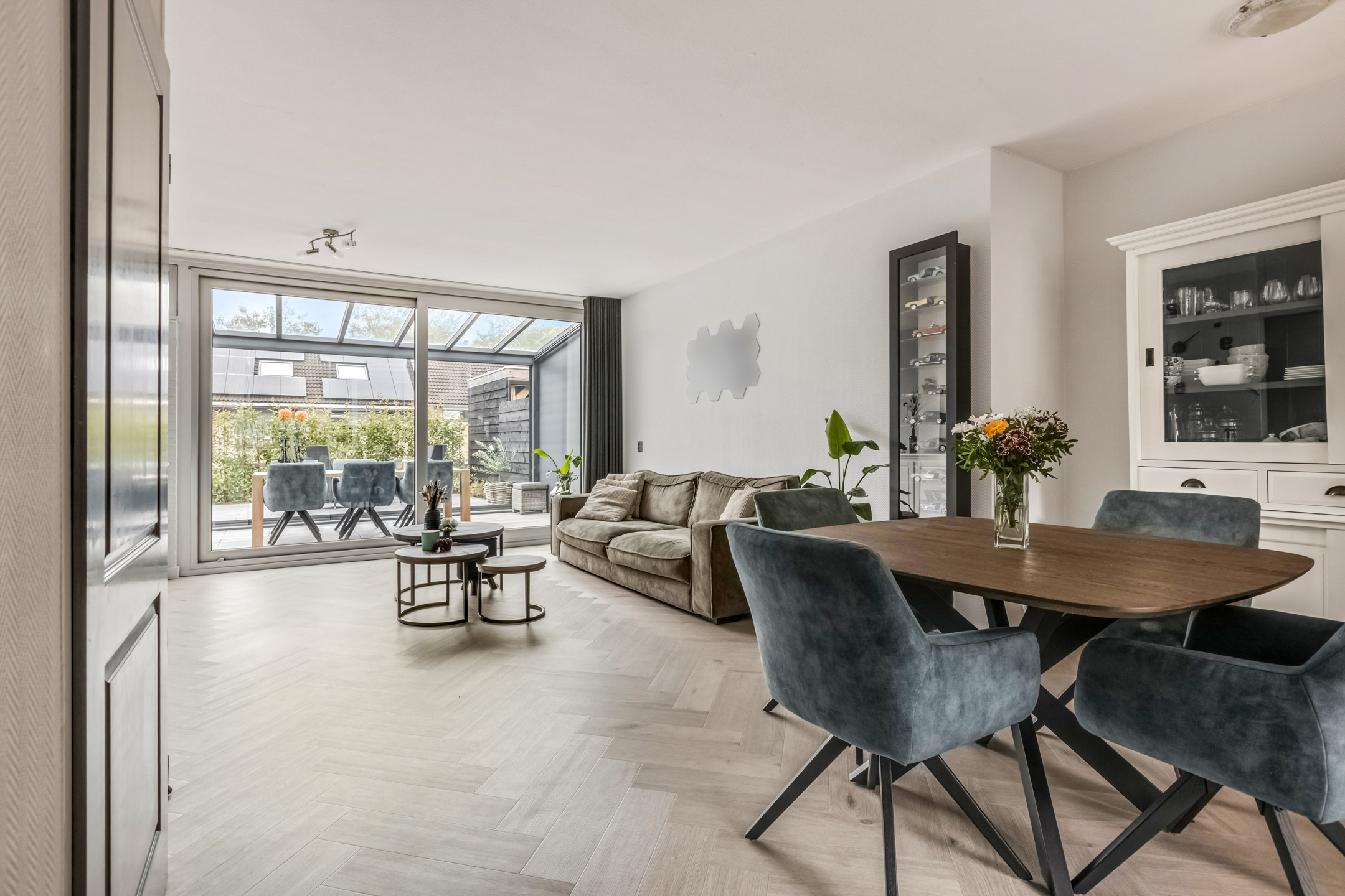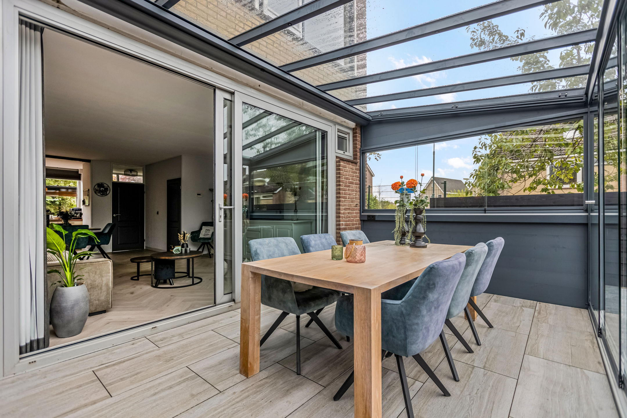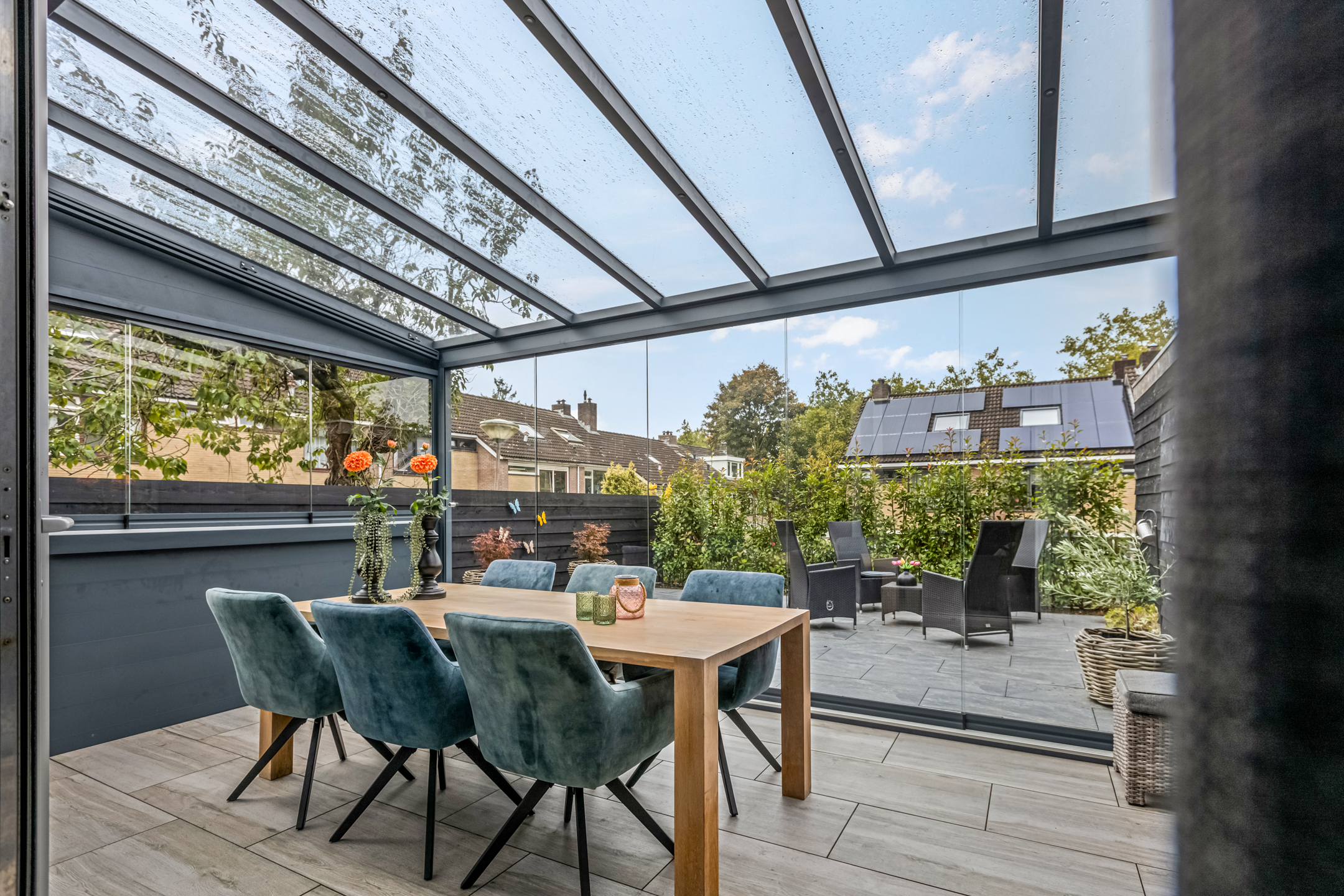 De achterzijde van de woning heeft een sfeervolle serre met glazen schuifpui naar het heerlijke zonnige terras.