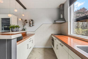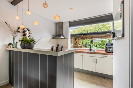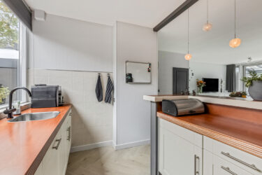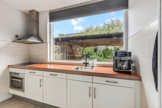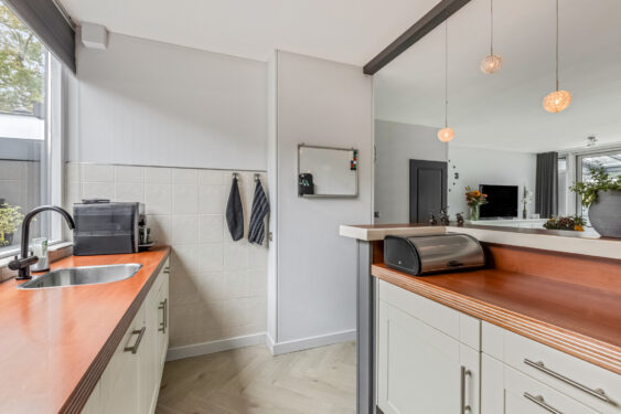 De halfopen keuken ligt aan de voorzijde van de woning met keuken in wandopstelling geplaatst. De keuken heeft een houten werkblad en inbouwapparatuur zoals een 4-pits keramische kookplaat met rvs-afzuigkap, combimagnetron en vaatwasser.
