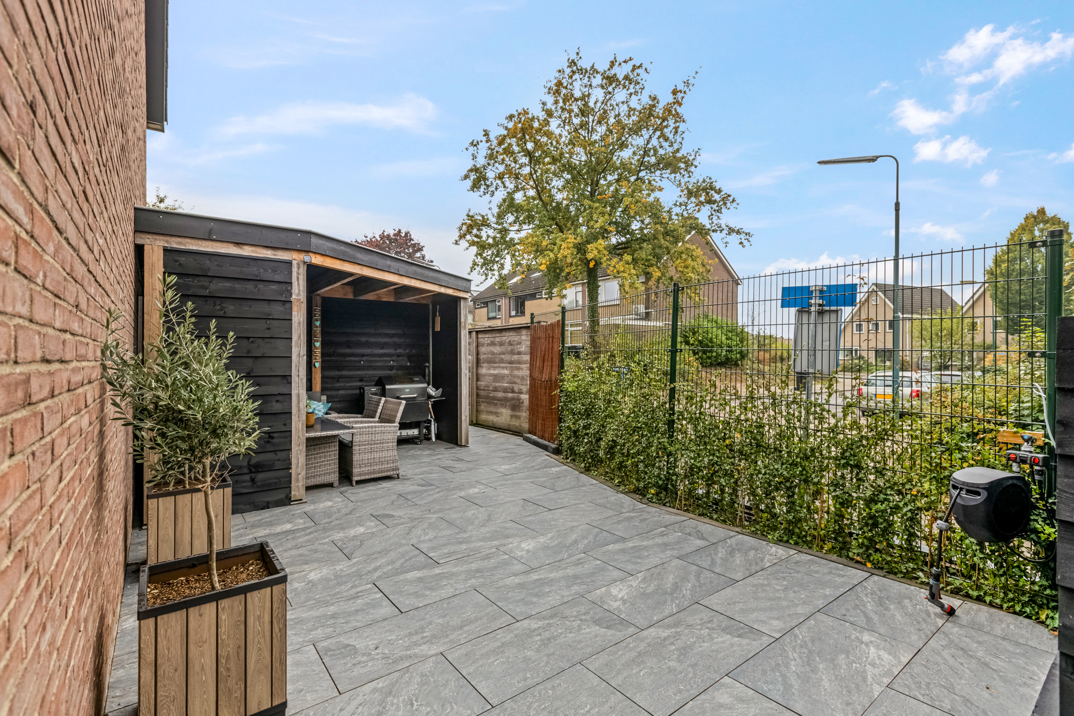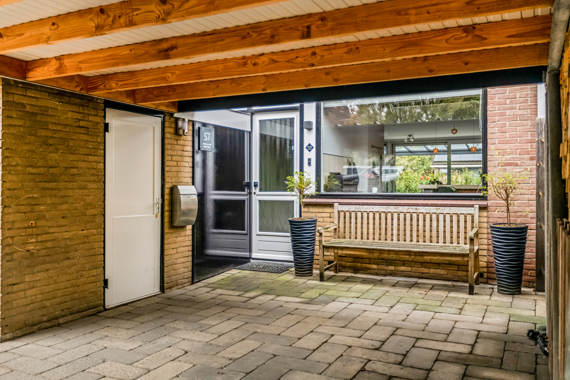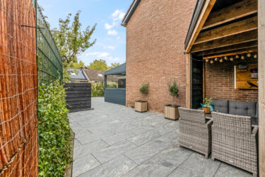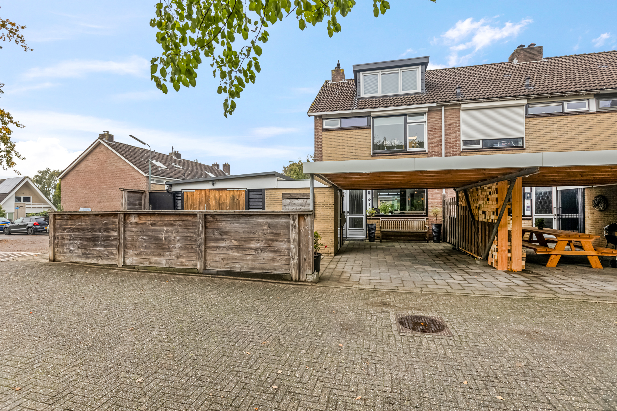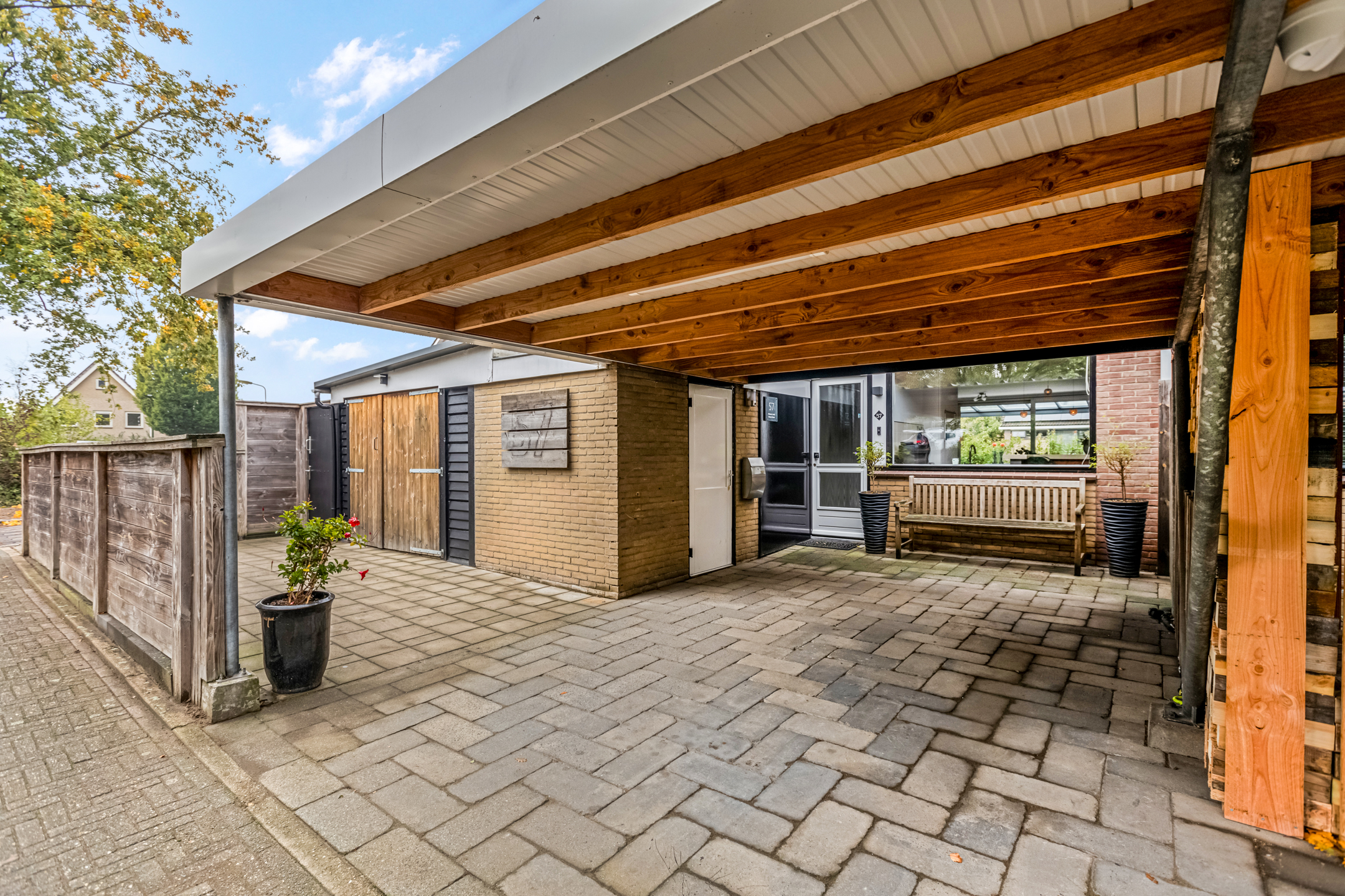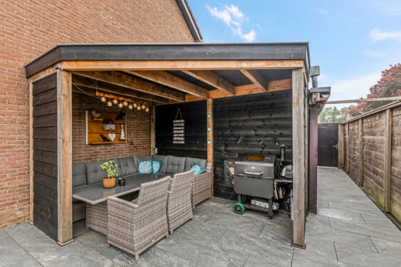 Aan de zijkant van de woning is nog eens een overkapping met terras en afsluitbare poort voor achterom.