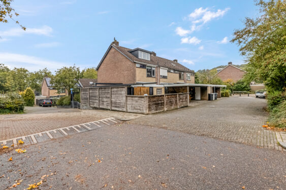 De voorzijde van de woning heeft een parkeerplek onder een carport en geeft toegang tot een stenen berging voorzien van elektra. Naast de stenen berging is nog eens een extra ruime geïsoleerde berging voorzien van elektra.